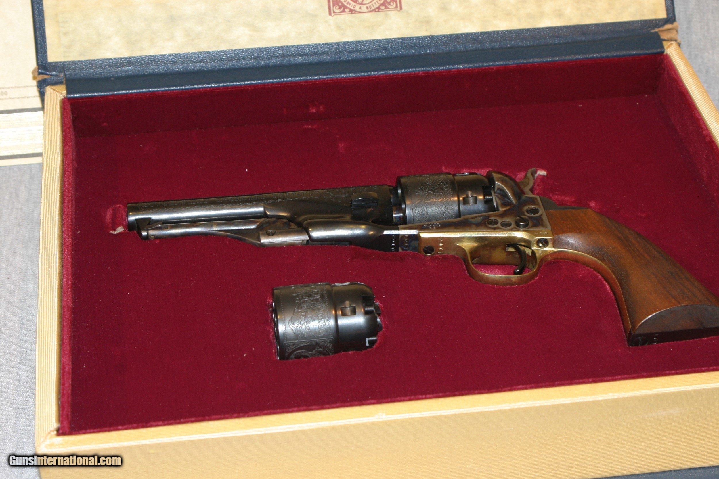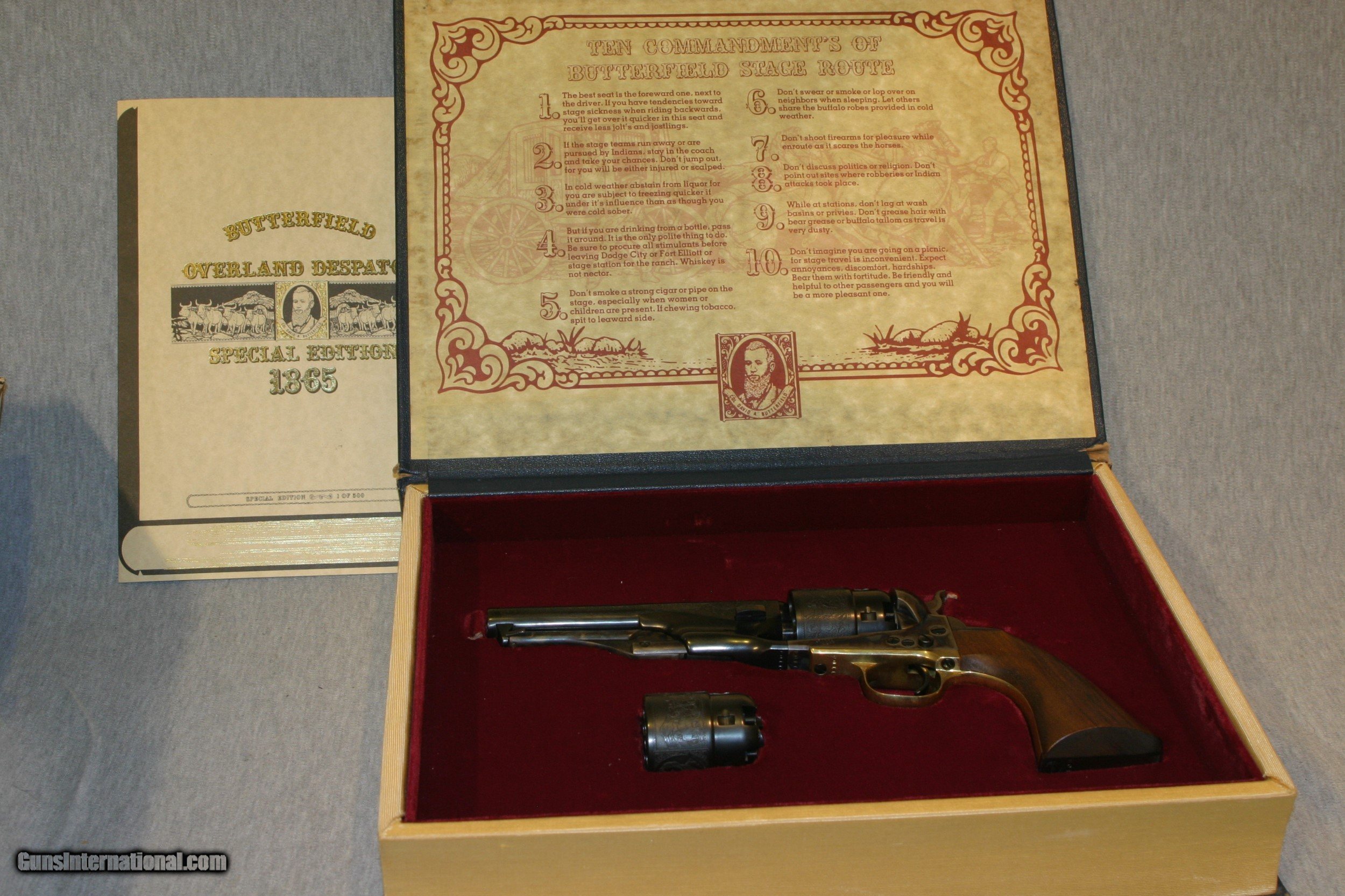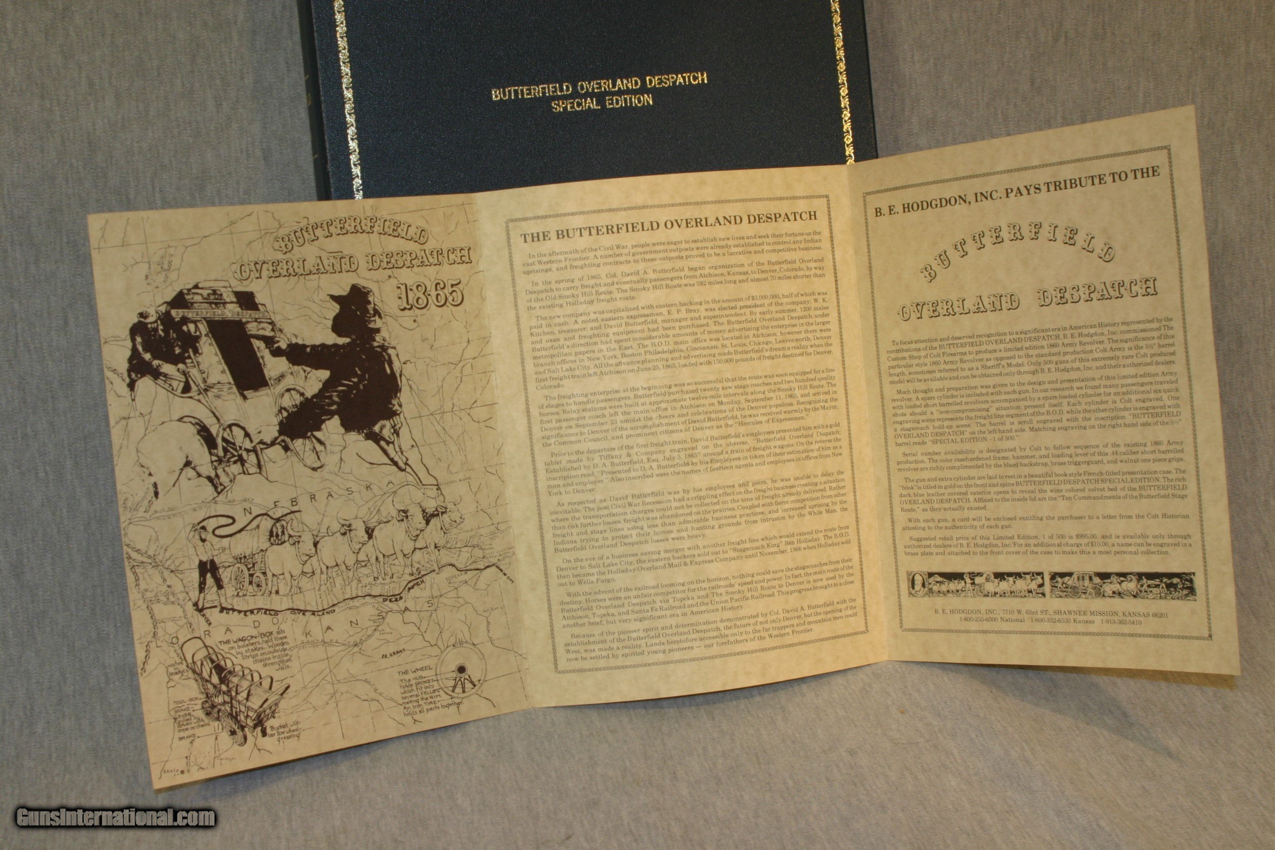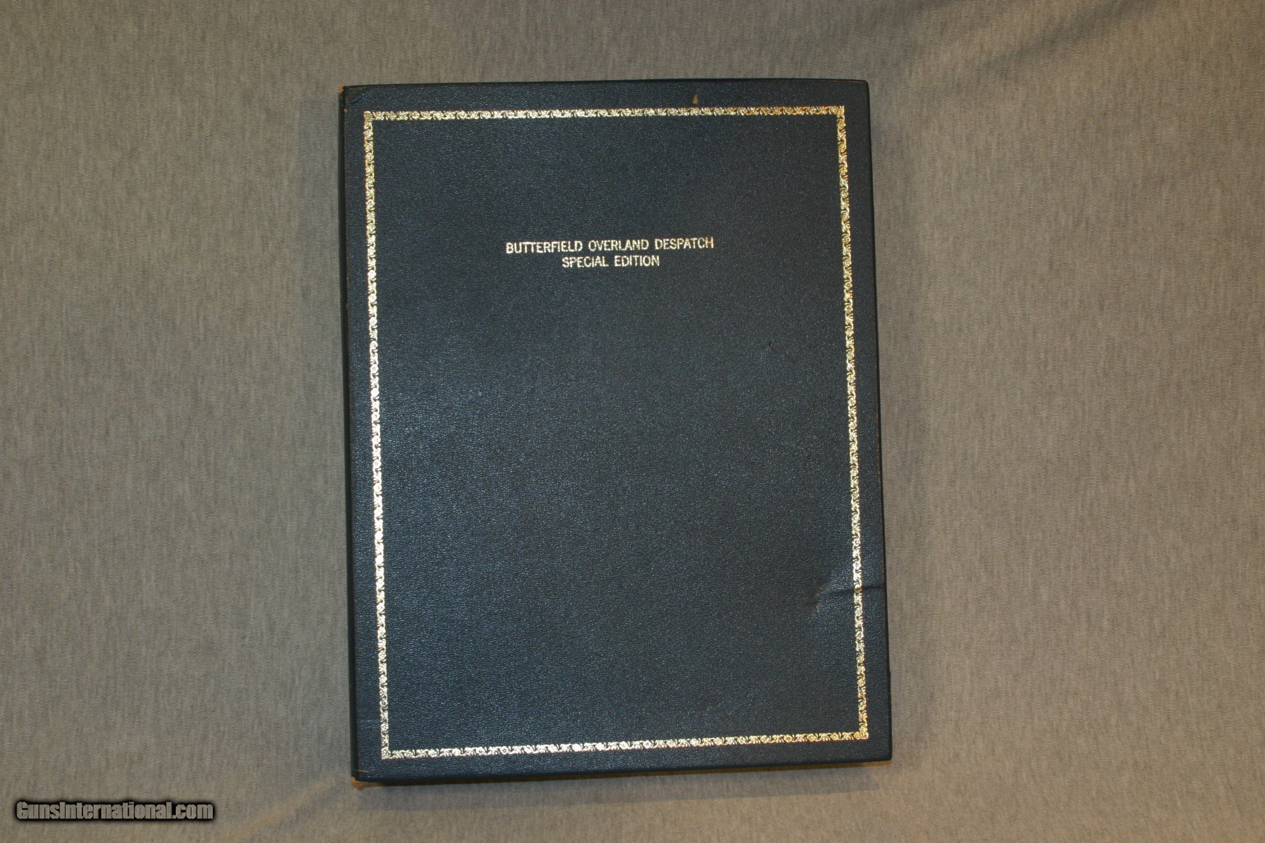 Description: Butterfield Overland Dispatch Limited Edition Revolver. One of 500 shortened Colt 1860 Army revolvers. Comes with an extra cylinder and a book style presentation case. COMPLETE IN WORKING CONDITION, AS NEW! SOLD |