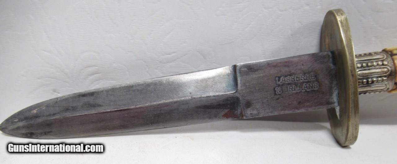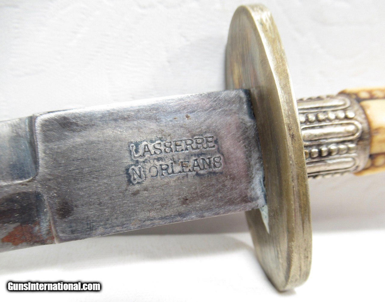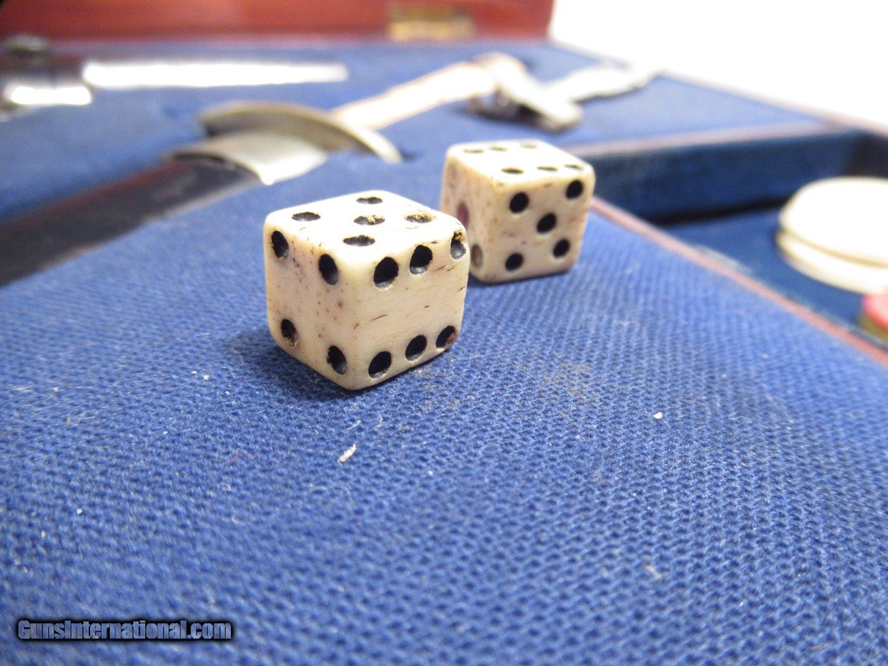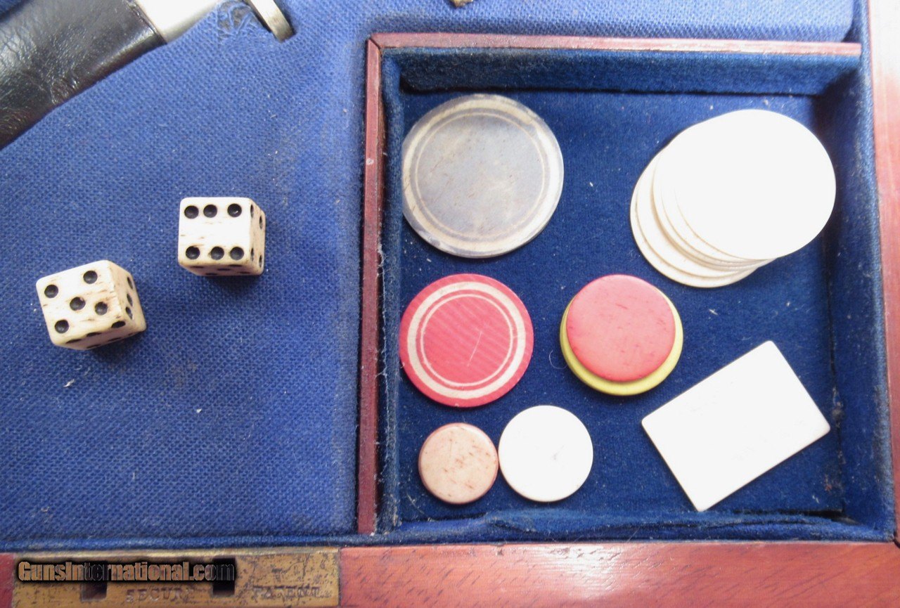 Description: Colt No.1 Deringer; Serial No. 1826; .41 Caliber; Dagger with Ivory Handle Marked “LASSERRE – N ORLEANS”; 4-5/8” Blade – 8 ½” L.O.A. with Nice Sheath; Card Cheat Device Marked “WIZARD”; Small Pair of Dice; 13 Various Poker Chips; Case is probably later than items; Knife may be reproduction; Chips, Dice, and Cheat Device Are Definitely Old; NOTE: French Immigrant L.P. Lasserre & Son, Auguste, Listed in New Orleans Directory as “Cutlers & Surgical Instrument Makers” During the Civil War Era; Really Neat Gambling Display Set; See All Photos for Condition; No Texts; Call (254)541-5765 or Email Only (collectingtexashotmail); PERSONAL PROPERTY of Harold Wieser; Price: $2,475 + $45 S&H Via USPS PRIORITY MAIL; Payment Address: Harold Wieser - 1466 U.S. Hwy 77 - Rosebud, TX 76570; SEND PAYMENTS VIA USPS PRIORITY MAIL; SOLD |