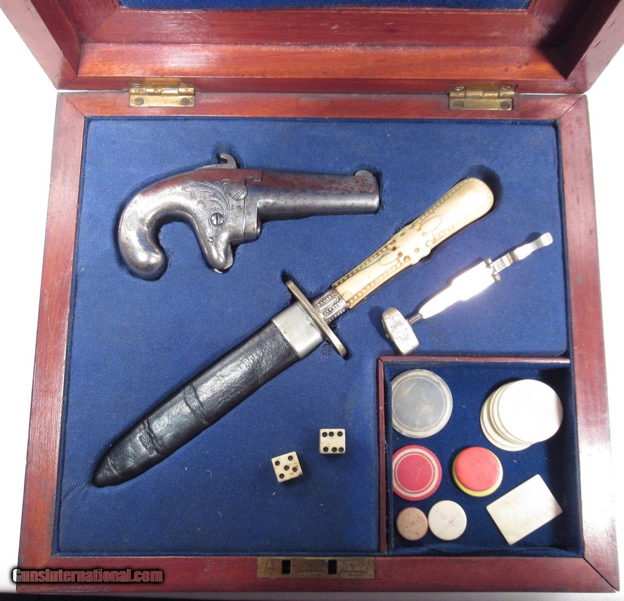 COLT No.1 DERINGER with GAMBLING ITEMS from COLLECTING TEXAS – CASED GAMBLING SET with CHIPS, KNIFE, DICE & CARD CHEAT DEVICE