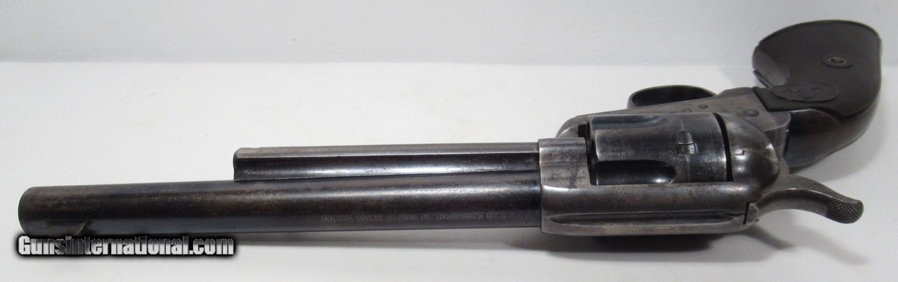Description: Colt Single Action Army; Serial No. 318133; Roll Die “Colt Frontier Six Shooter”; 44/40 Cal. with 7 ½” Barrel – Blue and Case Color Finish; Colt Hard Rubber Grips; All Numbers Match; Lots of Original Metal Finish Remains; Good Original Grips; Perfect Strong Action and Lock-Up; Strong Bore with moderate chattering; Colt Records Indicate this Serial Number to be Blue 7 ½” – 38/40 Shipped to Simmons Hardware; I believe that this is a Factory Error as gun appears to be Correct and Original; This Fine 109 Year-Old Colt 44 came from a North Dakota Ranch; LIQUIDATING PERSONAL COLLECTION; Price: $4,500 + $30 S&H; Price includes insured shipping; return policy: three days inspection from the date the item is received; full refund of shipping both ways ONLY IF THE ITEM IS MISREPRESENTED. SOLD |