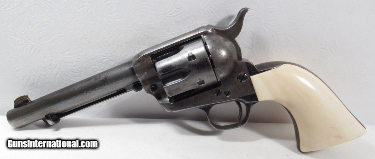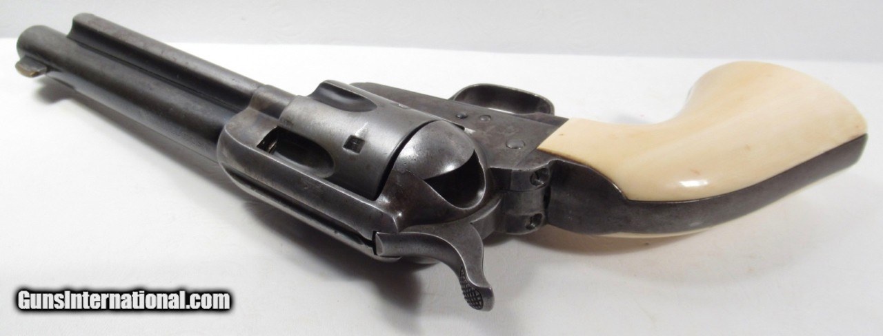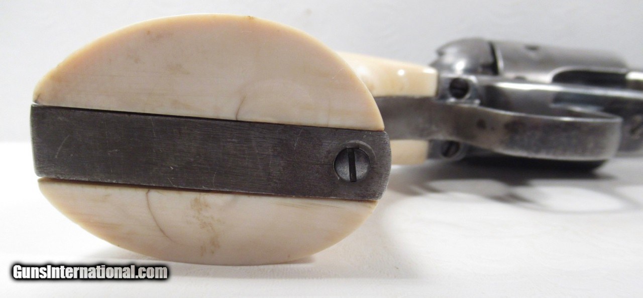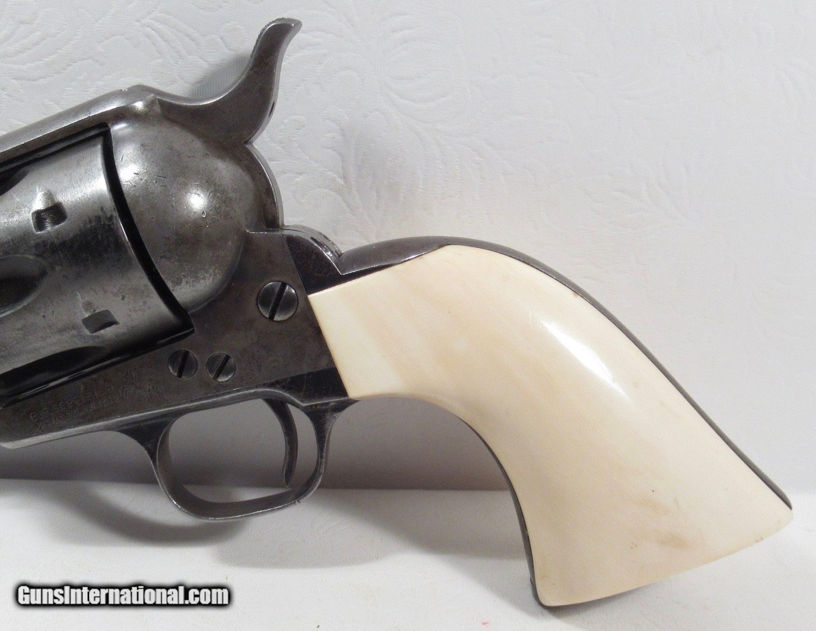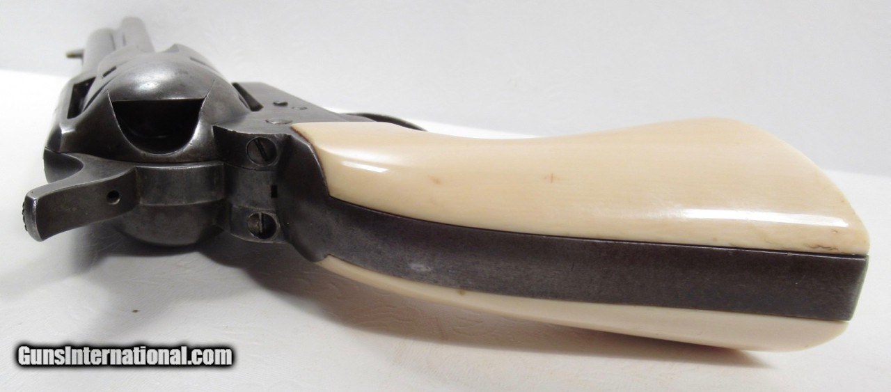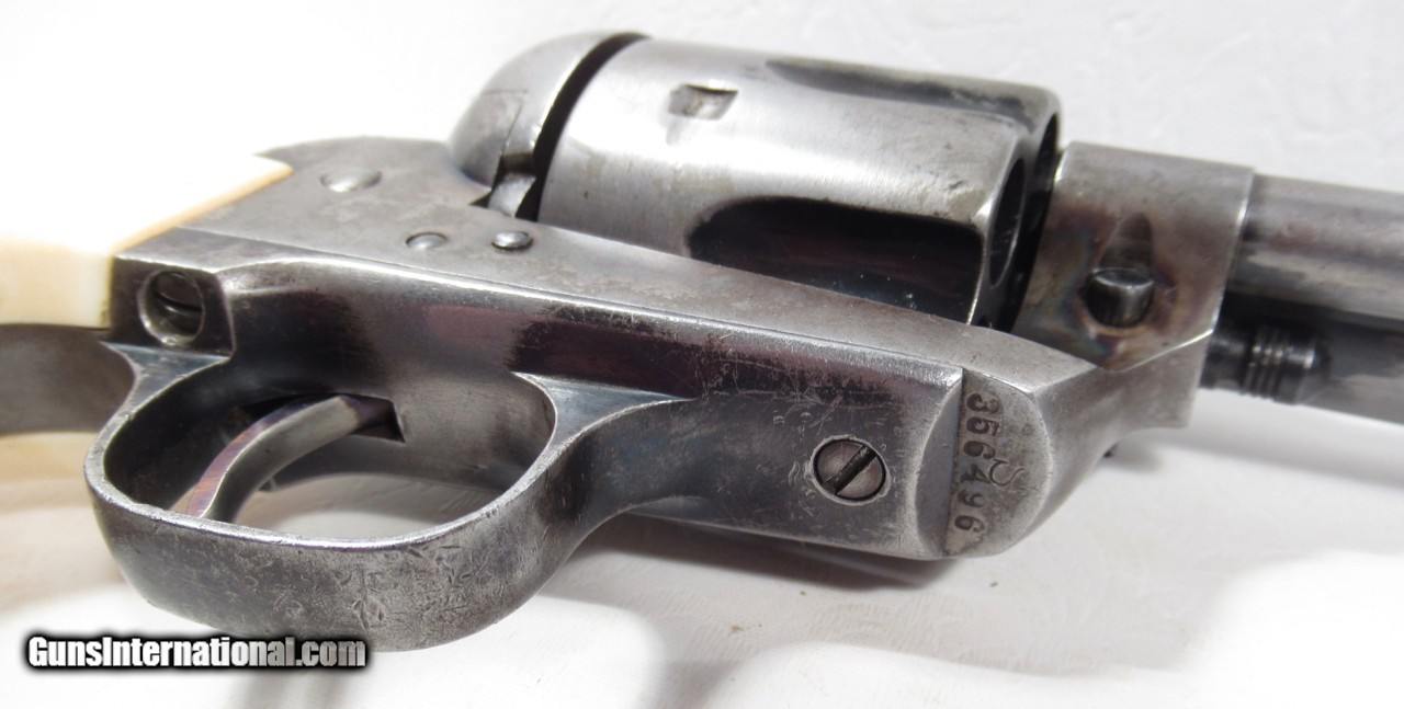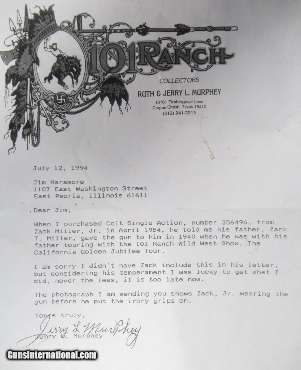 Description: Colt Single Action Army; Serial No. 356496; Made in 1938; 44-40; 5 ½” Barrel; Blue with 1-Piece Ivory Grips; “S” Stembridge Leasing Colt; Obtained by Zack T. Miller in 1940 and Given to Zack Miller Jr.; Typical Stembridge Gun with several replaced parts and un-numbered backstrap; Lots of Original Finish, Good Action and Bore; Nice One-Piece Ivory Grips; See Jerry Murphy Letter (copy) and Zack Miller Signed Photo (copy); Note Brass Overlay on Front Sight; PERSONAL PROPERTY of Harold Wieser; Price: $3,950 + $30 S&H; Price includes insured shipping; return policy: three days inspection from the date the item is received; full refund of shipping both ways ONLY IF THE ITEM IS MISREPRESENTED. SOLD |