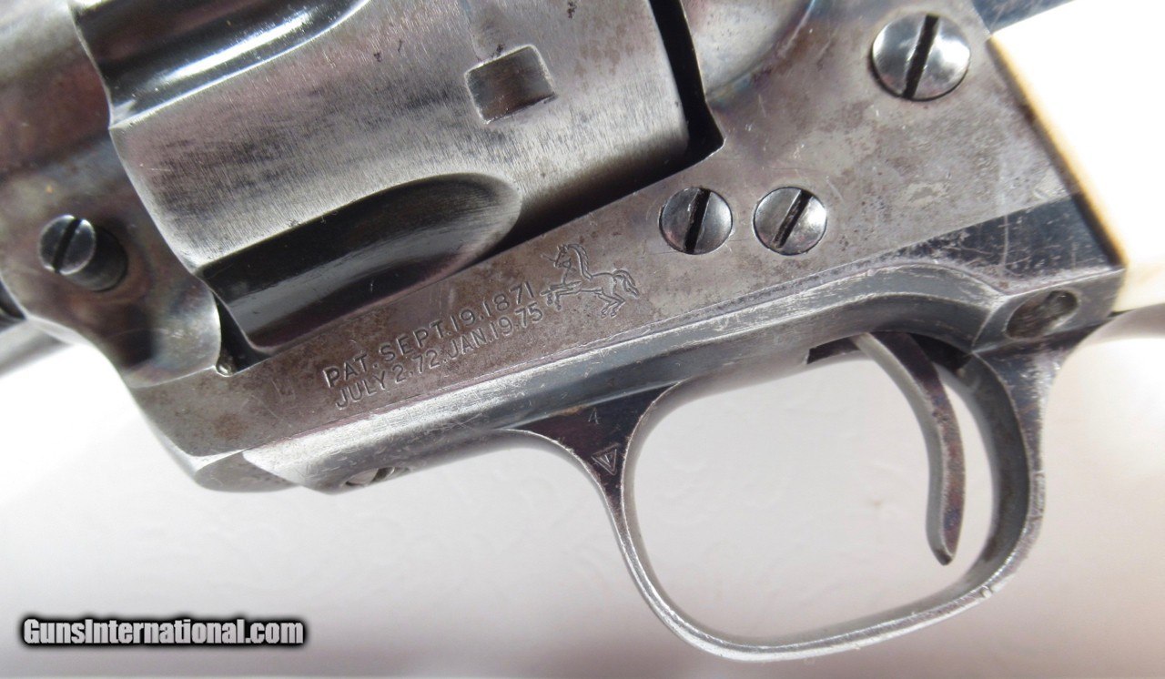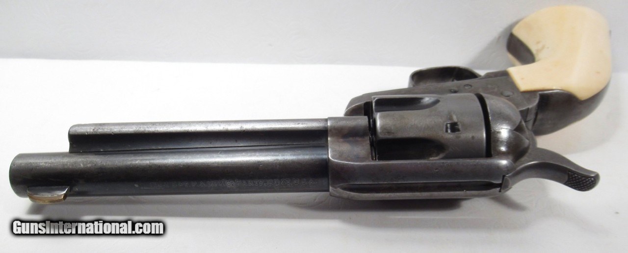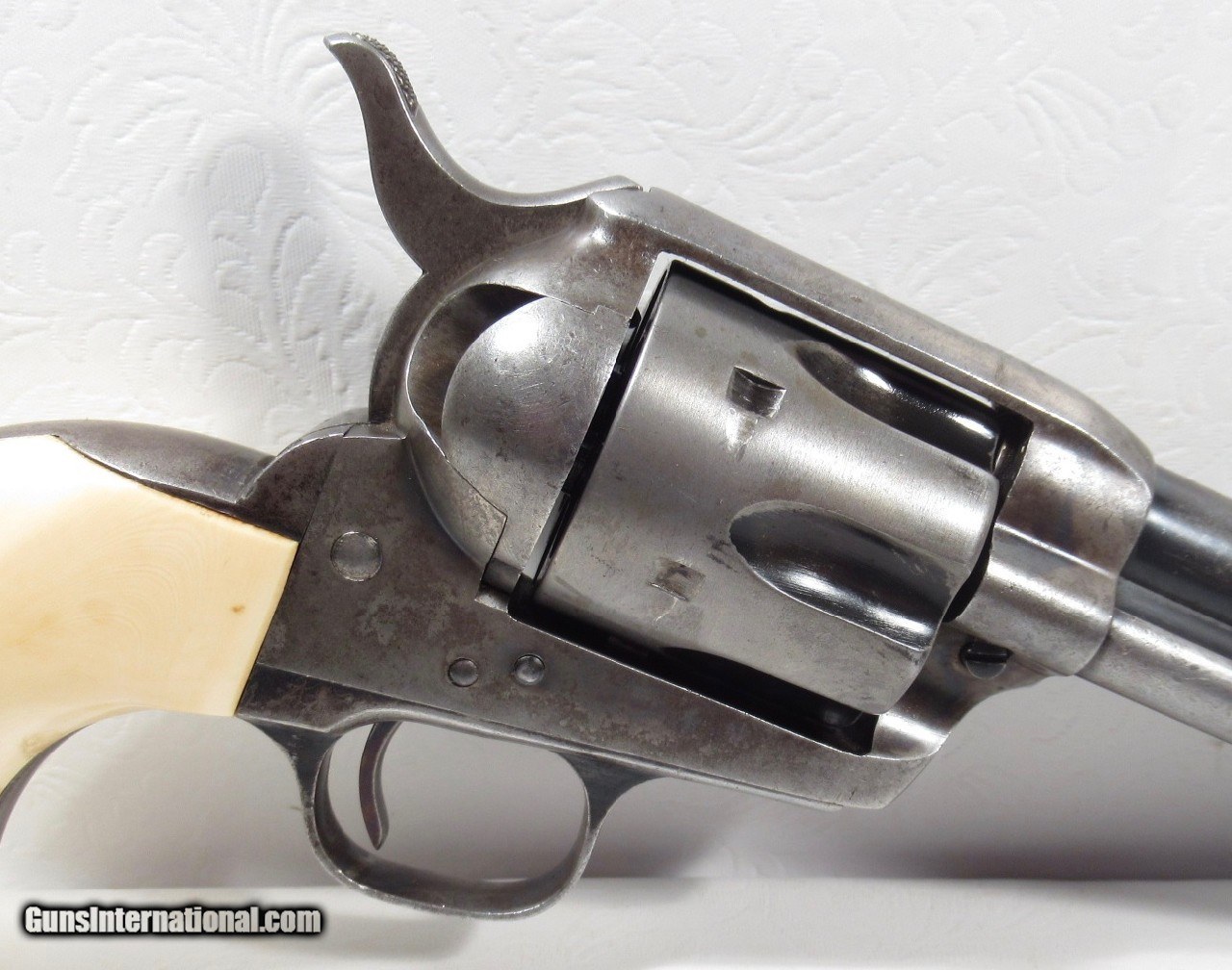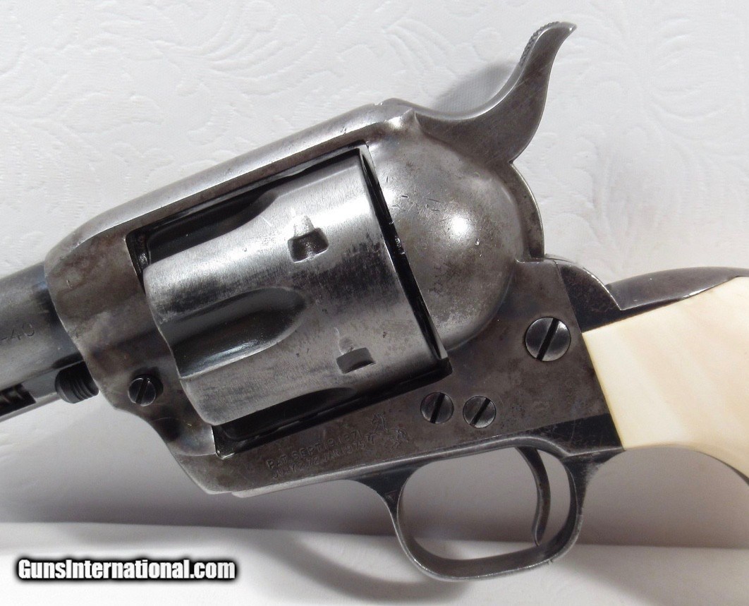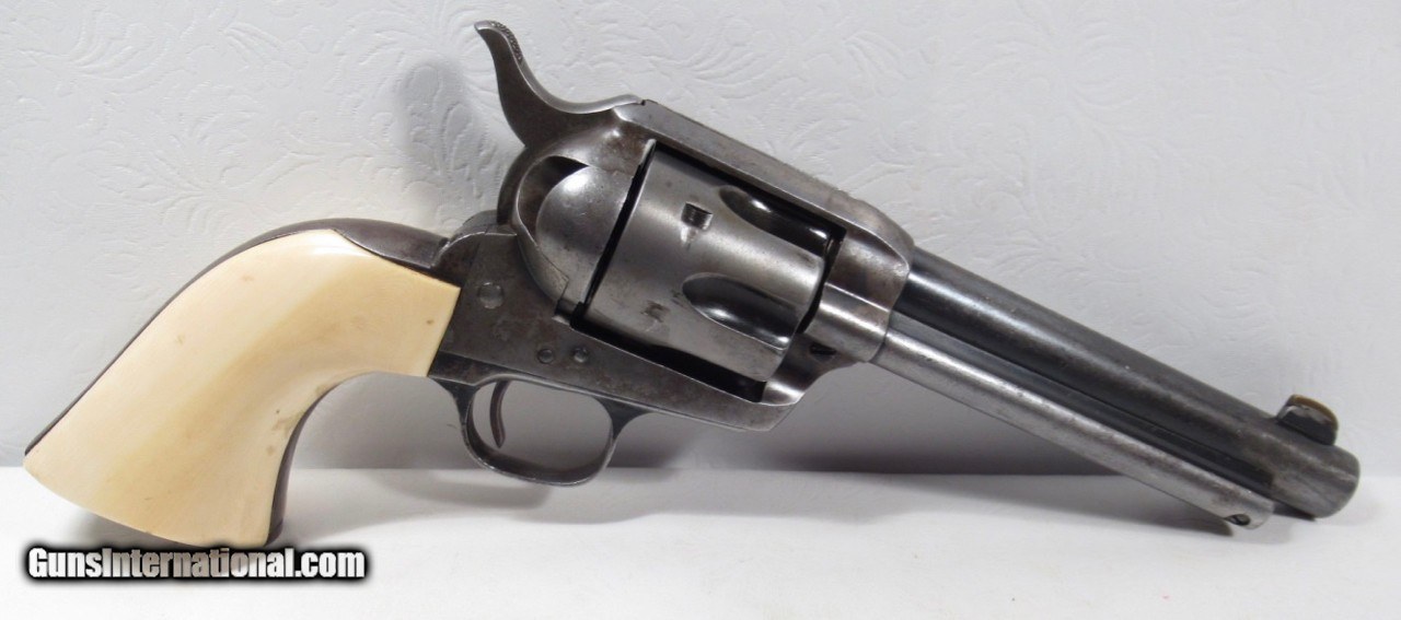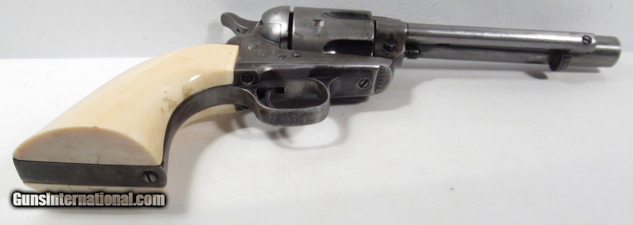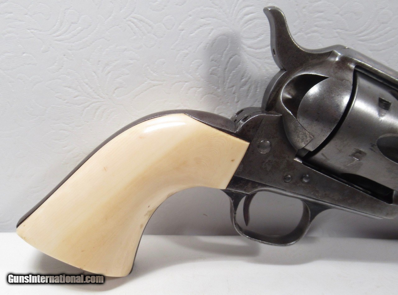 Description: Colt Single Action Army; Serial No. 356496; Made in 1938; 44-40; 5 ½” Barrel; Blue with 1-Piece Ivory Grips; “S” Stembridge Leasing Colt; Obtained by Zack T. Miller in 1940 and Given to Zack Miller Jr.; Typical Stembridge Gun with several replaced parts and un-numbered backstrap; Lots of Original Finish, Good Action and Bore; Nice One-Piece Ivory Grips; See Jerry Murphy Letter (copy) and Zack Miller Signed Photo (copy); Note Brass Overlay on Front Sight; PERSONAL PROPERTY of Harold Wieser; Price: $3,950 + $30 S&H; Price includes insured shipping; return policy: three days inspection from the date the item is received; full refund of shipping both ways ONLY IF THE ITEM IS MISREPRESENTED. SOLD |