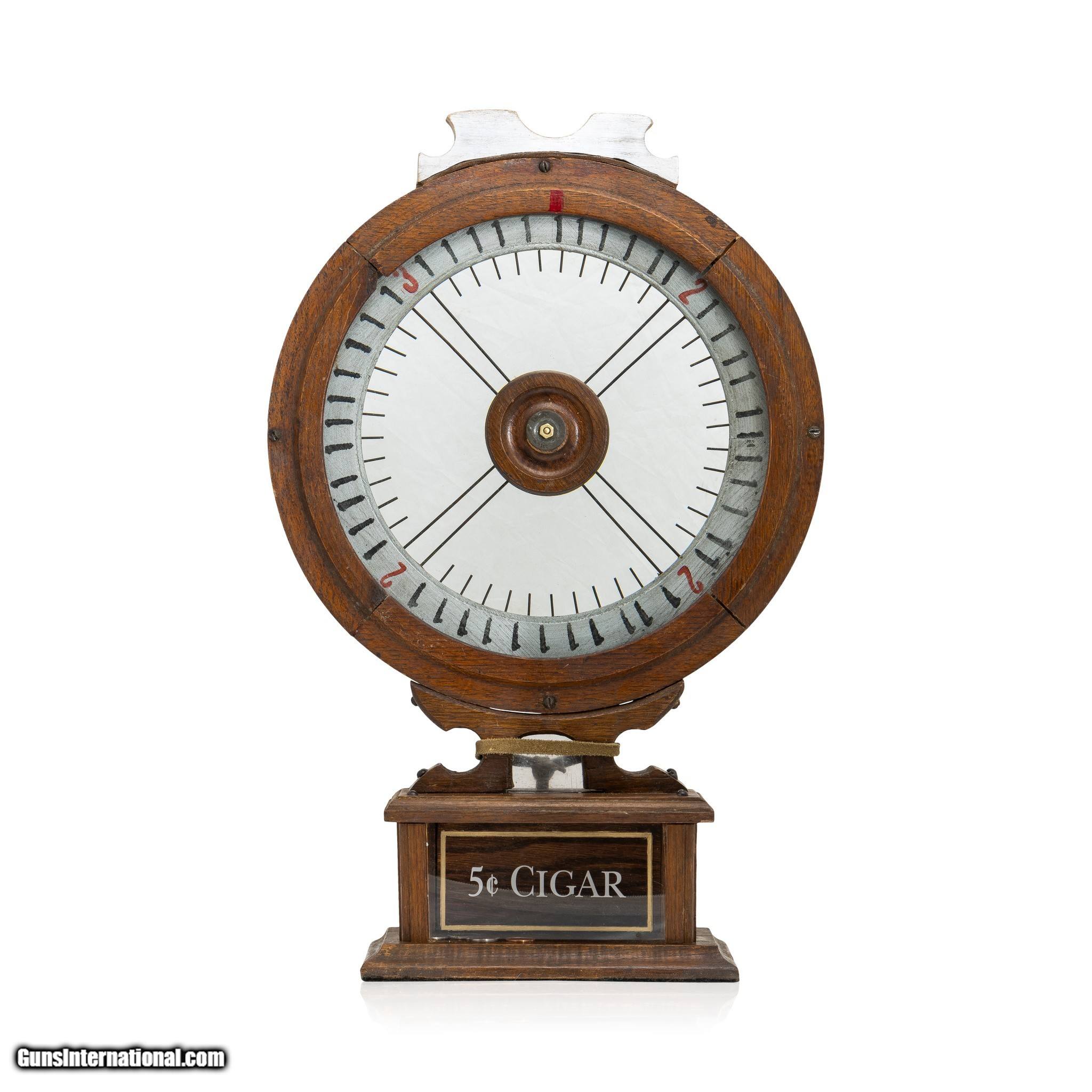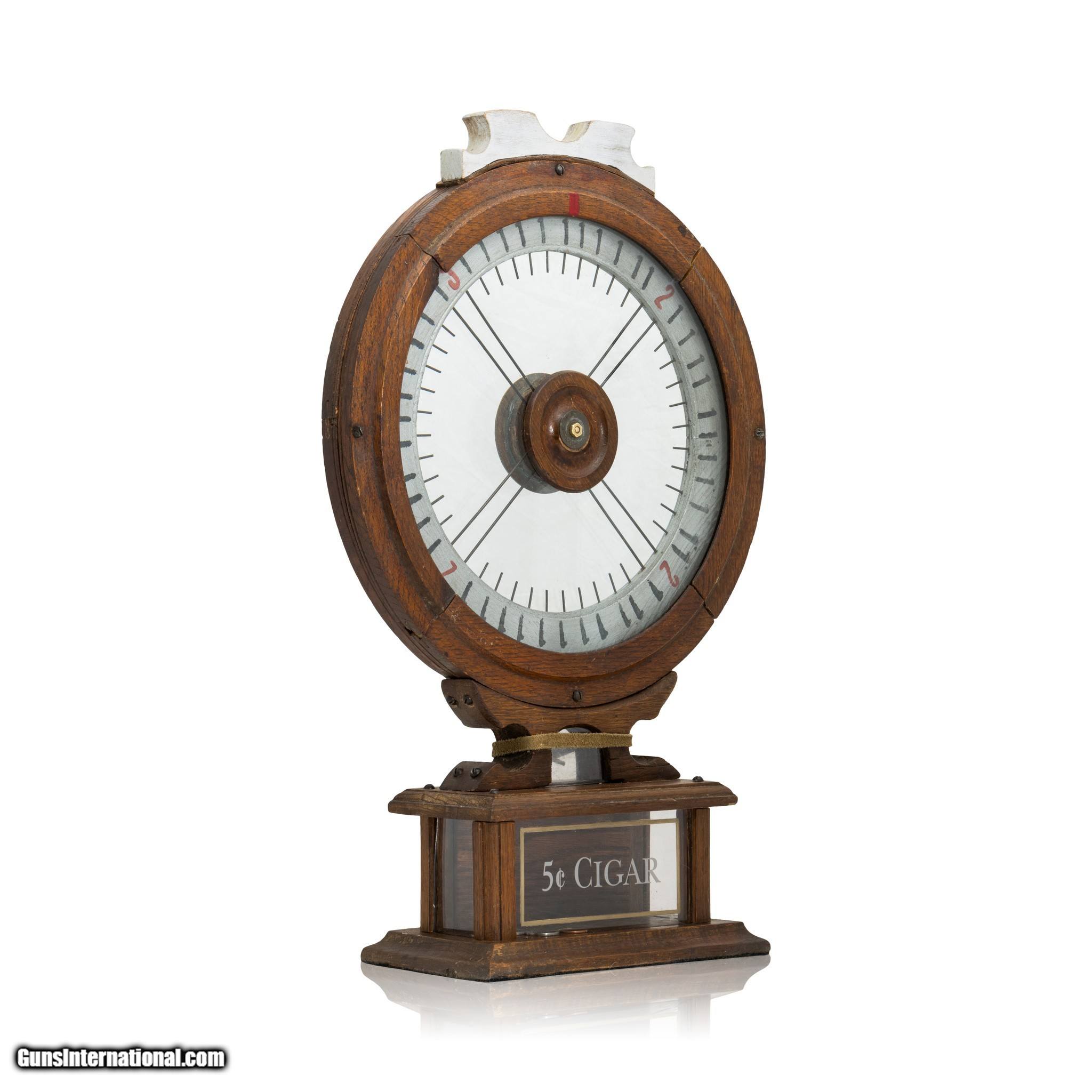 Description: Columbian "fairest wheel" trade simulator. This machine was used in the mid to late 1800's by cigar stores. Participants would start by dropping a nickel in the slot at the top of machine. The weght of the nickel would then cause the wheel to spin and the coin to land in the base. Whatever number the wheel landed on was the amount of cigars the player received. Family Owned & Operated Cisco’s Gallery deals in the rare, exceptional, and one-of-a-kind pieces that define the history of America and the Old West. Our pieces range from American Indian to Cowboy Western and include original items of everyday life, commerce, art, and warfare that tamed America’s frontier. Our 14,000 square foot gallery opened in 1996 in beautiful Coeur d’Alene, Idaho. Personal Service Cisco’s operates on old fashioned values – honesty and integrity, and all of our items are backed by our money back guarantee. We appreciate the opportunity to earn your business. Whether you desire assistance with a jewelry purchase, choosing a gift, identification, or even selling – we hope to be your trusted source. SOLD |