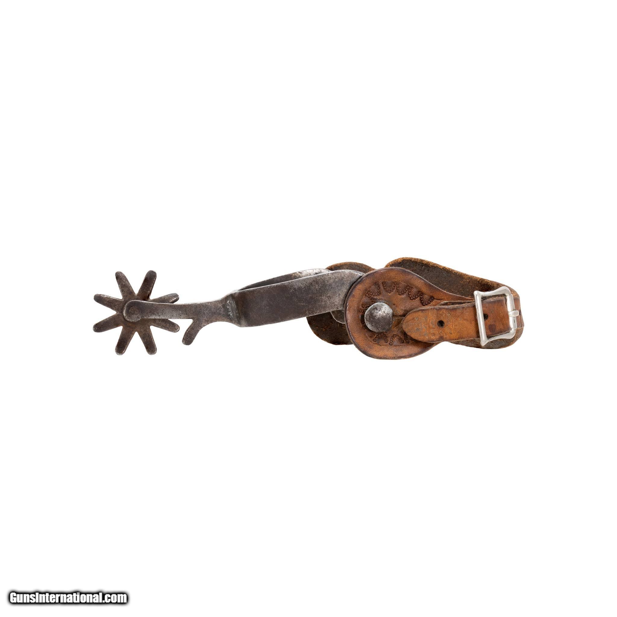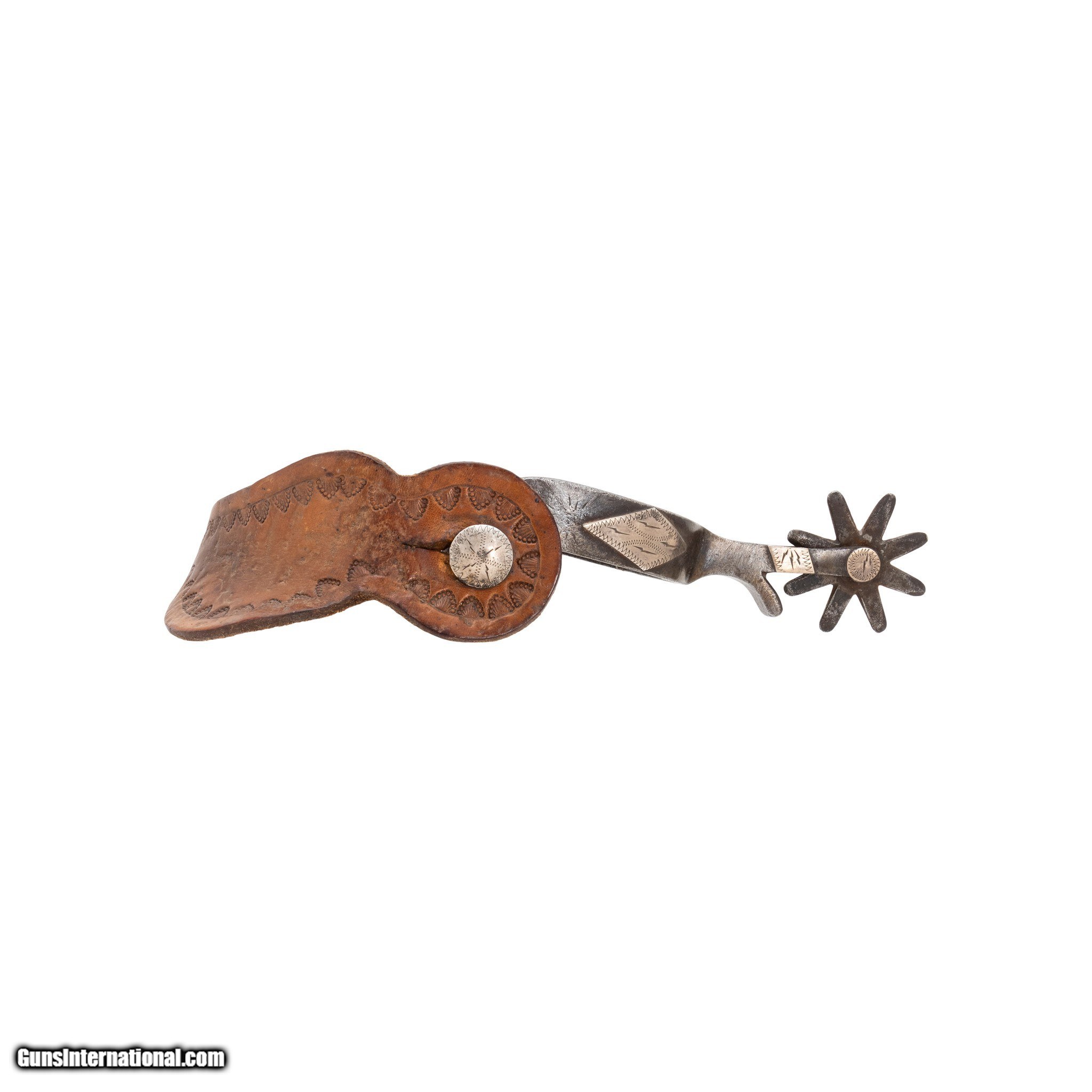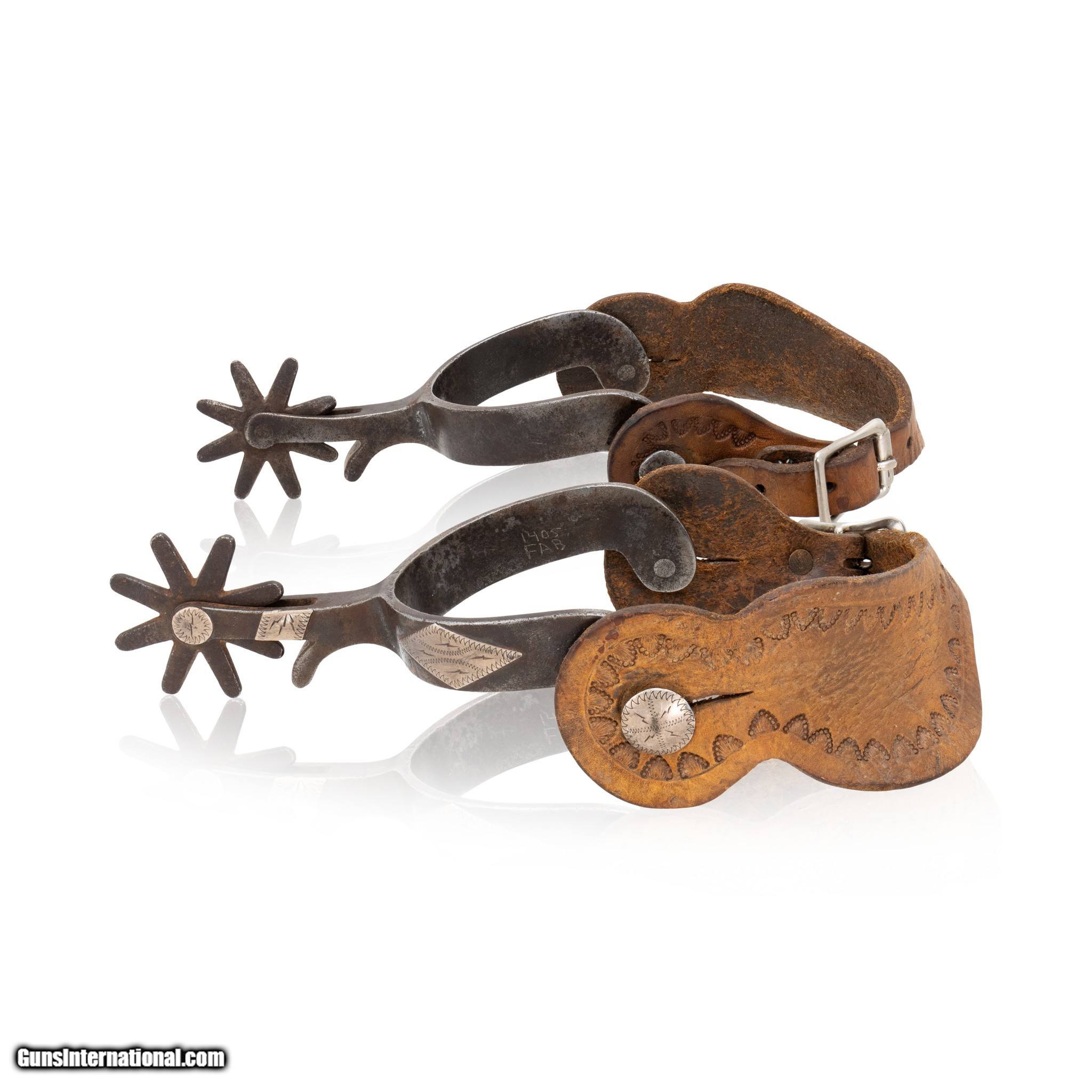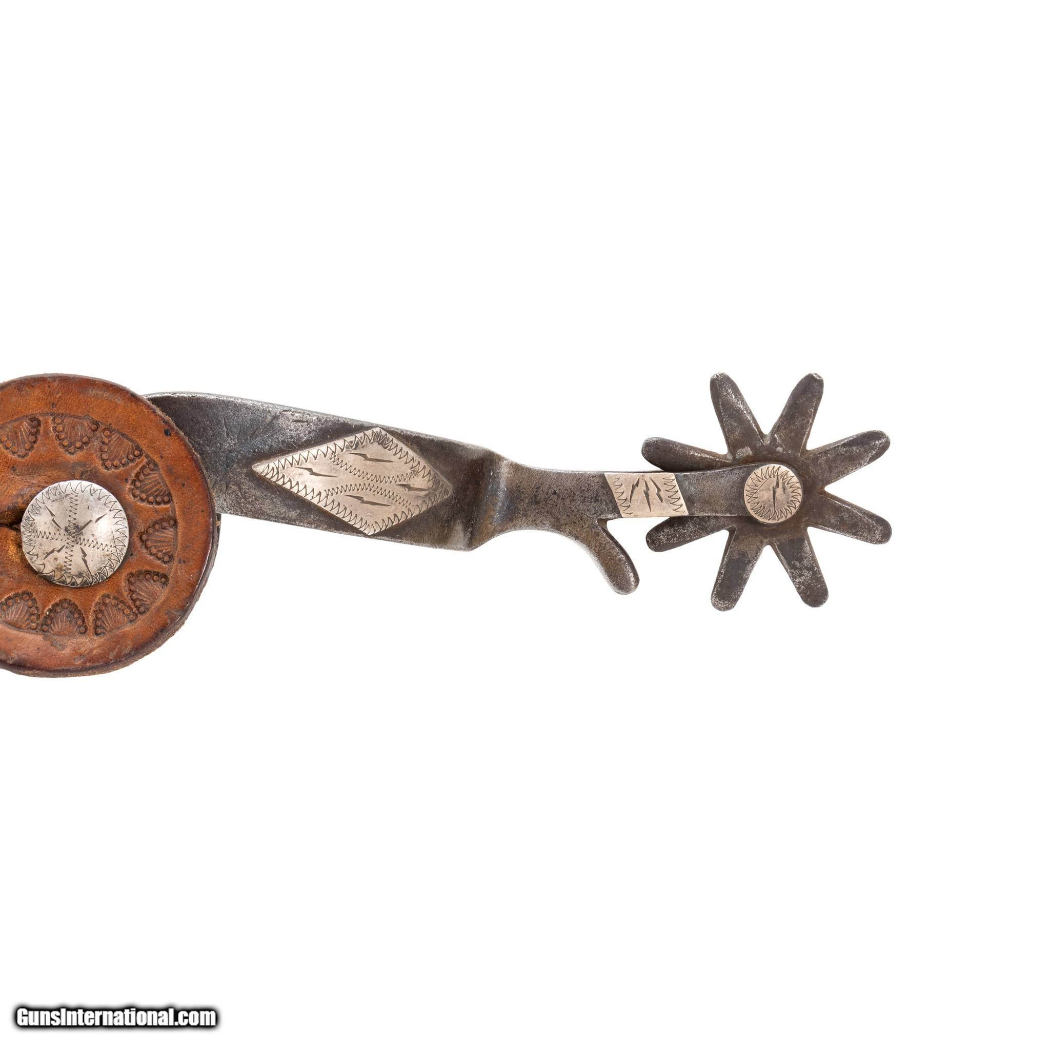 Description: Crockett style spurs with period leathers. Silver overlaid with stamped diamond and other overlaid designs. Leather is tooled with simple pointed design around edge. Spurs in good condition with nice patina and short, dull rowels. Unmarked. Great for continued use or display in a vintage or antique western or cowboy collection. Size: 6"L x 3". Family Owned & Operated Cisco’s Gallery deals in the rare, exceptional, and one-of-a-kind pieces that define the history of America and the Old West. Our pieces range from American Indian to Cowboy Western and include original items of everyday life, commerce, art, and warfare that tamed America’s frontier. Our 14,000 square foot gallery opened in 1996 in beautiful Coeur d’Alene, Idaho. Personal Service Cisco’s operates on old fashioned values – honesty and integrity, and all of our items are backed by our money back guarantee. We appreciate the opportunity to earn your business. Whether you desire assistance with a jewelry purchase, choosing a gift, identification, or even selling – we hope to be your trusted source. SOLD |