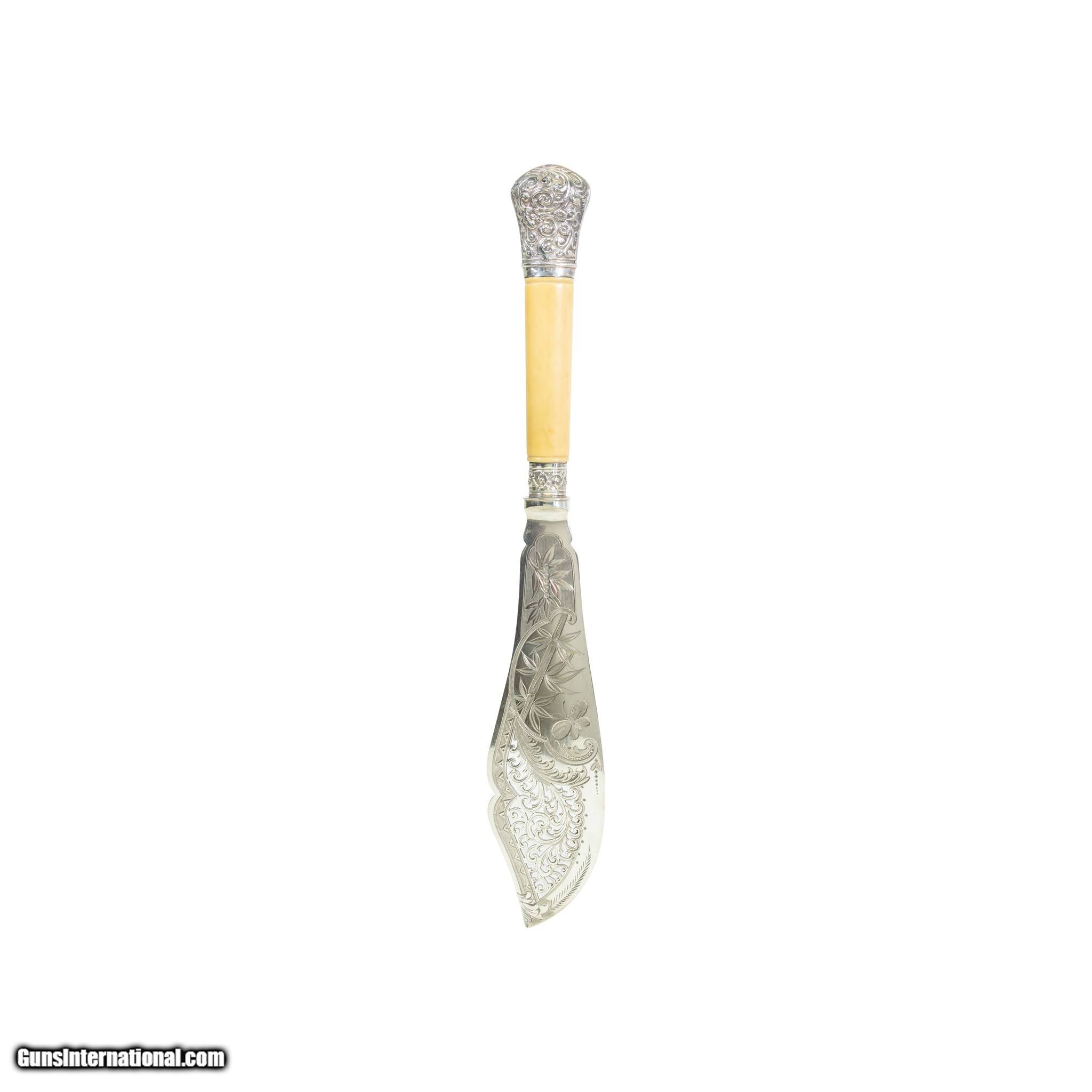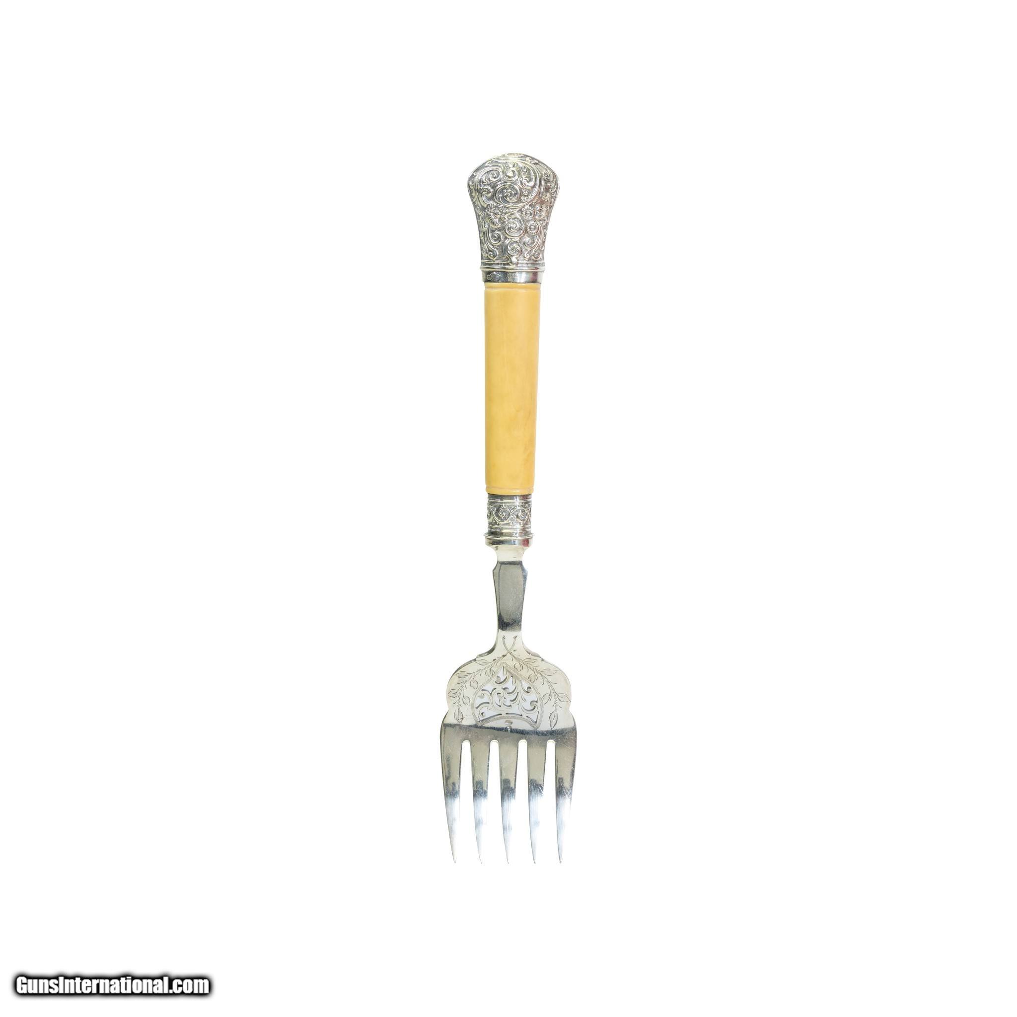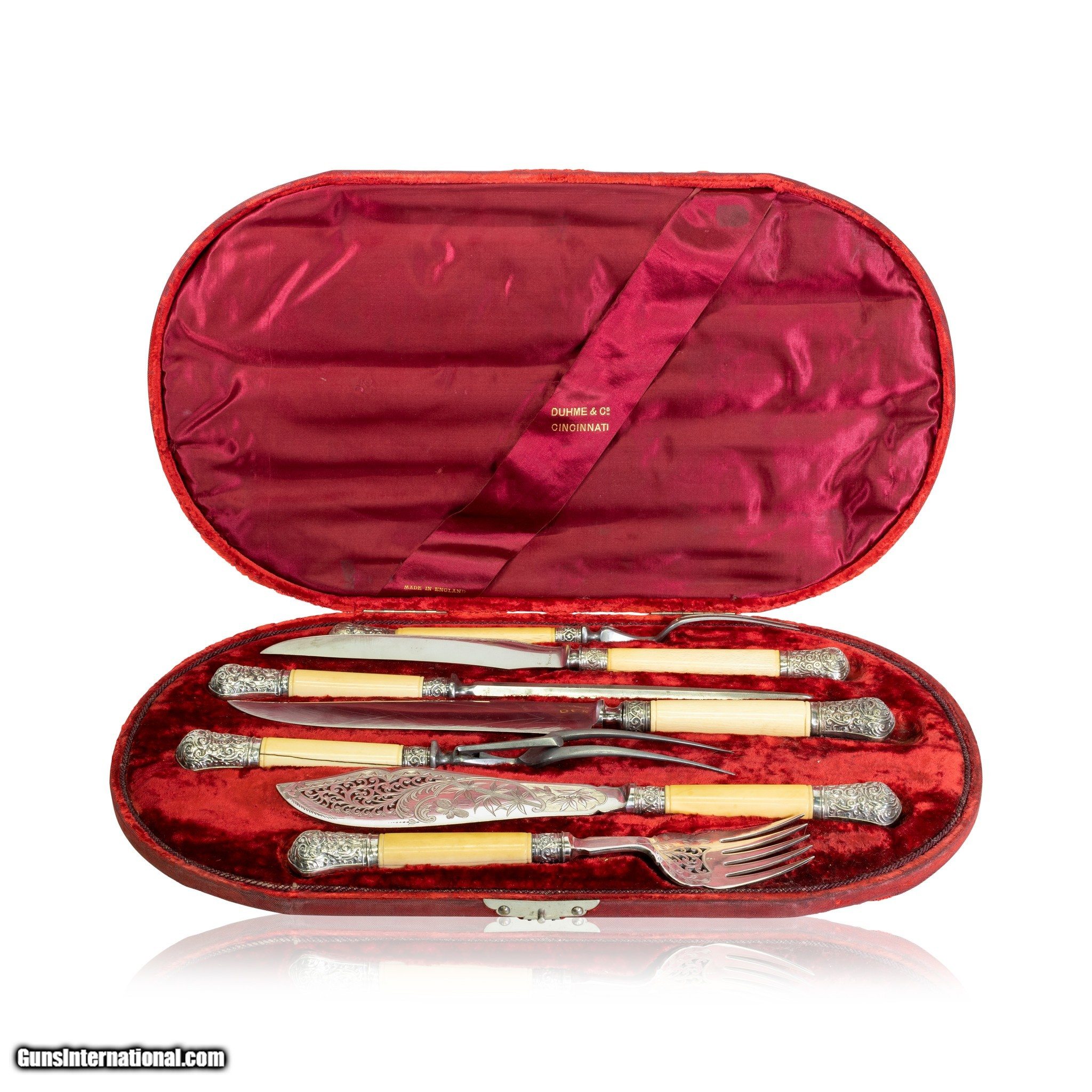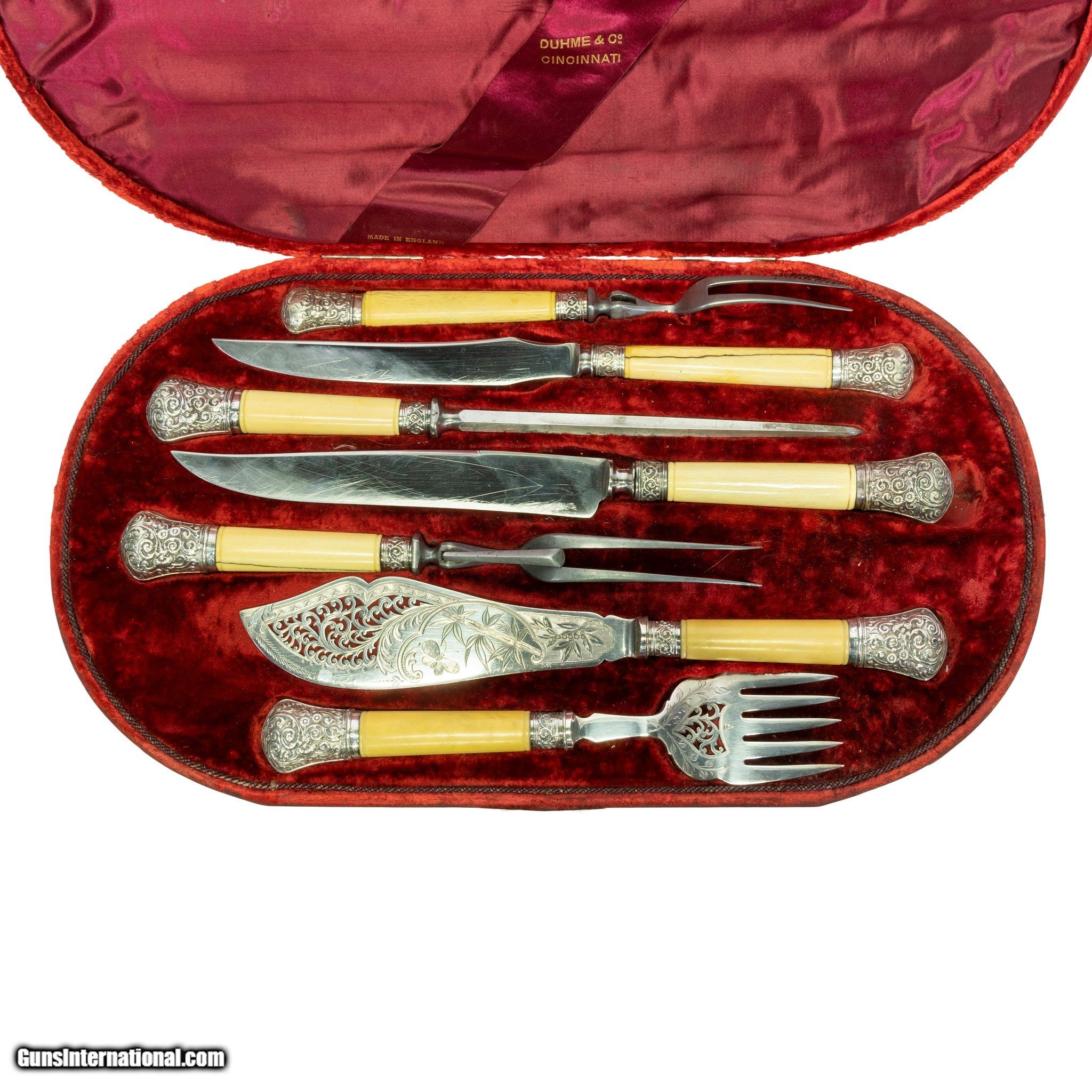 Description: Duhme, Co. Cincinnati seven piece fancy carving set with bakelite handles. Well preserved 1900's set from a Montana ranch. Beautiful historic silverware carving set that would make for a great family heirloom. Size: Knife 14" Case 19" x 9" SOLD |