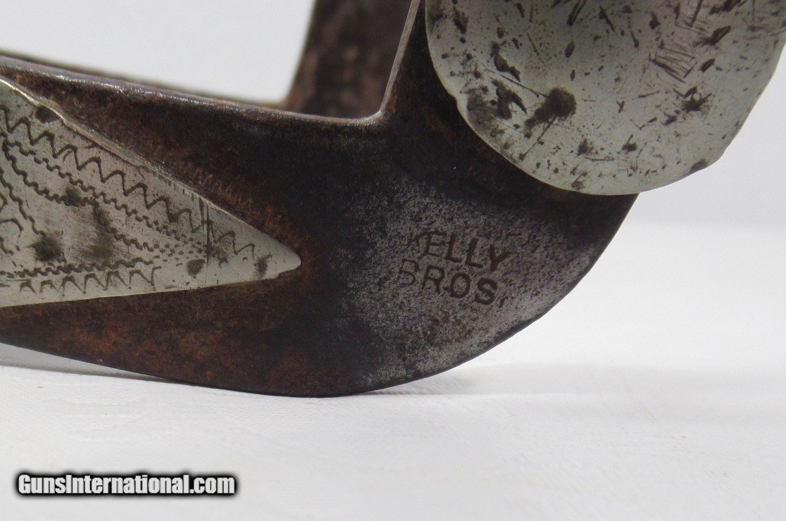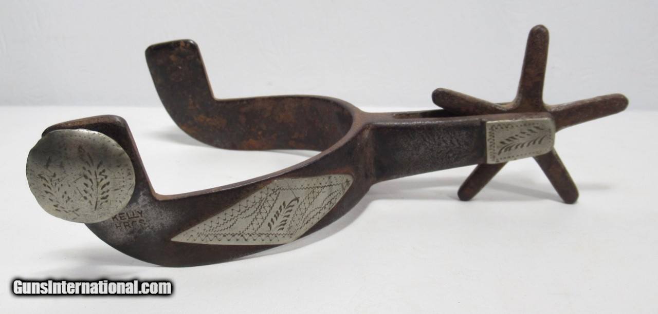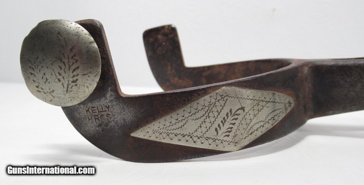Description: Kelly Bros. Straight Mark Single Mounted Texas Cowboy Spurs; Made in Dalhart, Texas; Circa 1912; LIQUIDATING PERSONAL COLLECTION; Price: $400 + $30 S&H; Price includes insured shipping; return policy: three days inspection from the date the item is received; full refund of shipping both ways ONLY IF THE ITEM IS MISREPRESENTED. SOLD |