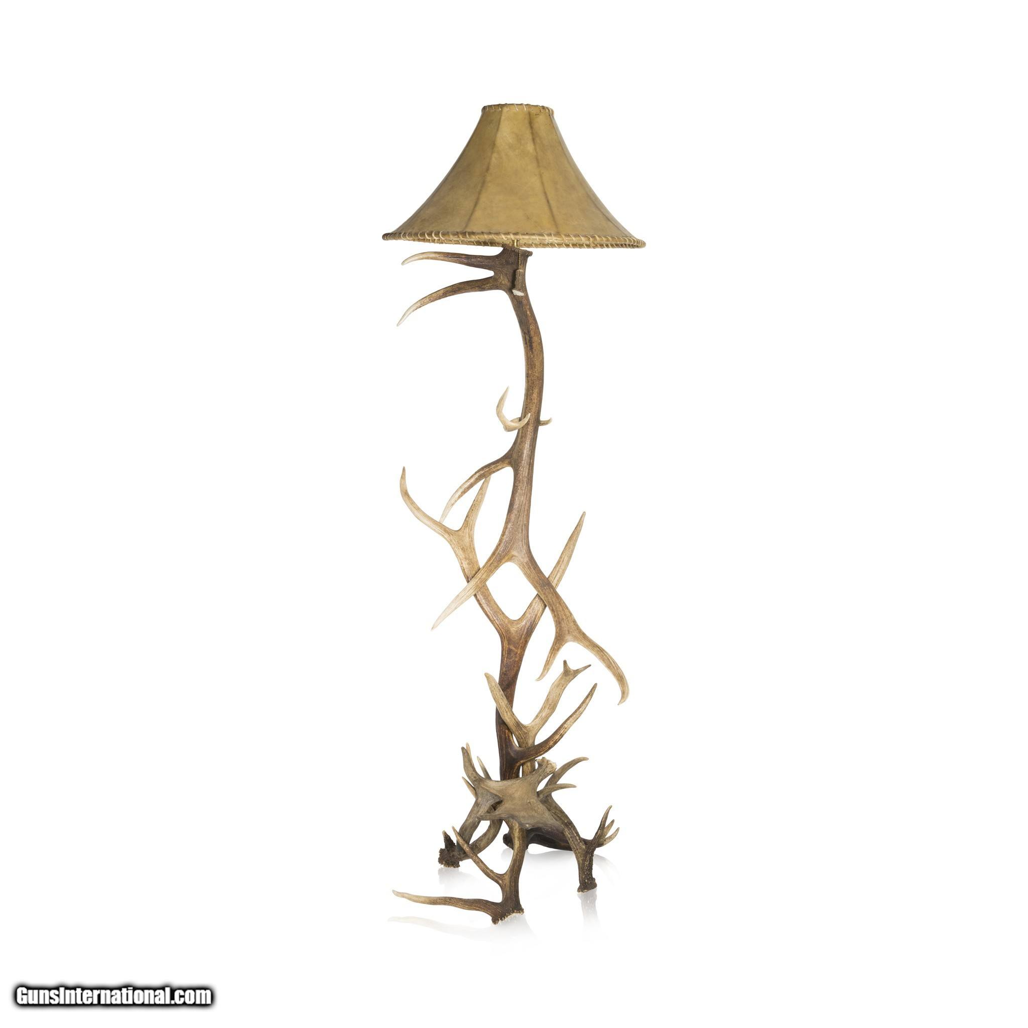 Description: Elk antler floor lamp with whitetail and moose at base having rawhide shade and antler finial. Great statement lighting for hunting lodge, rustic home, or cabin. 75"H shade 24 SOLD |