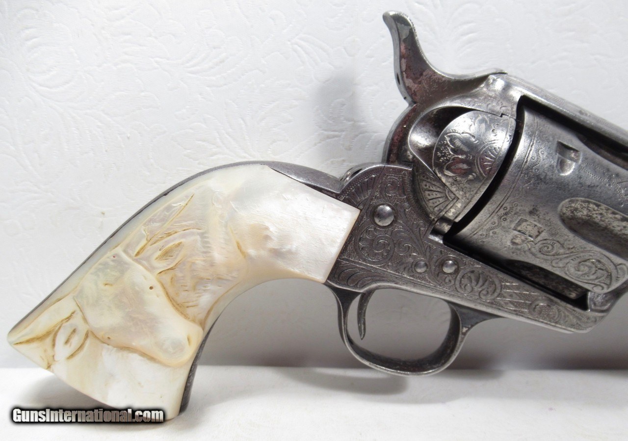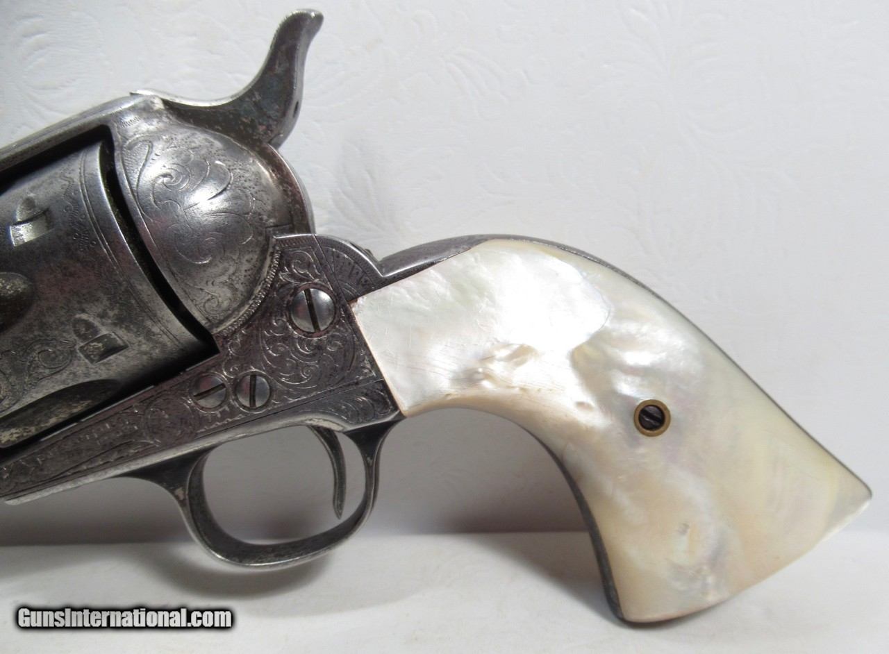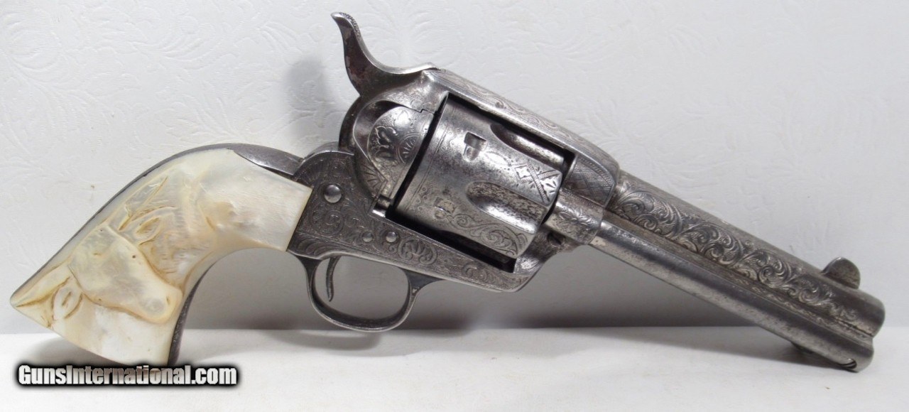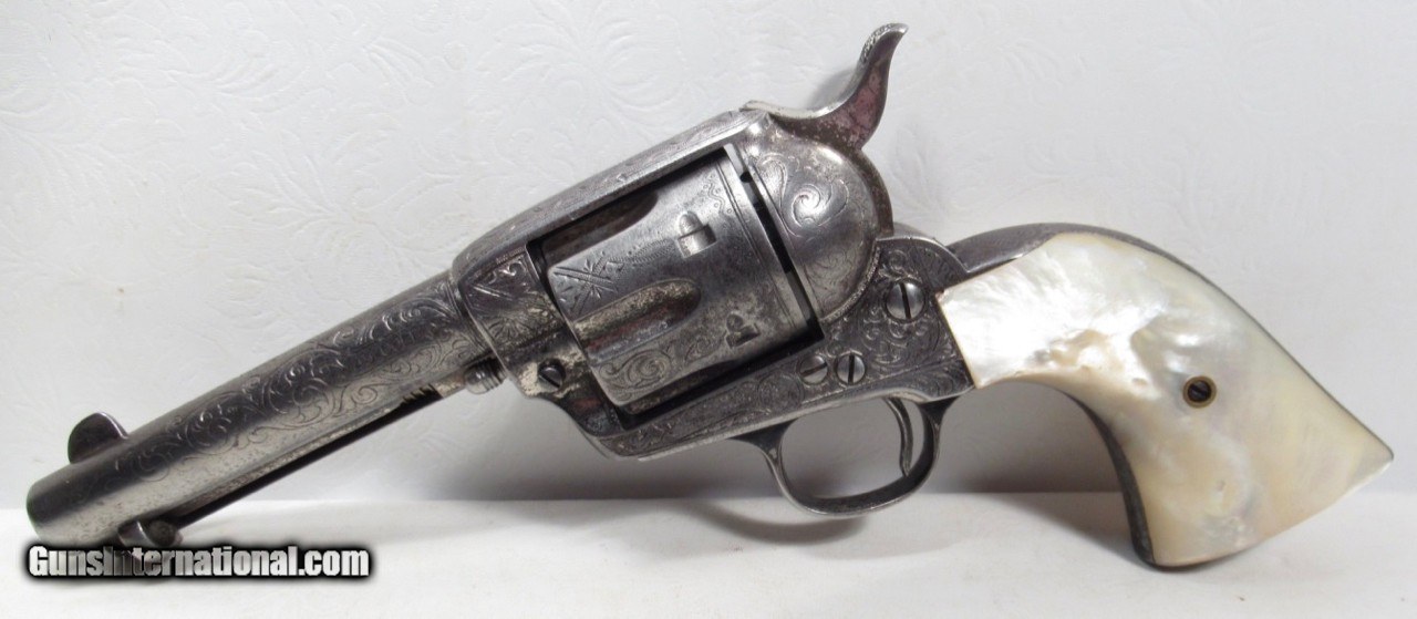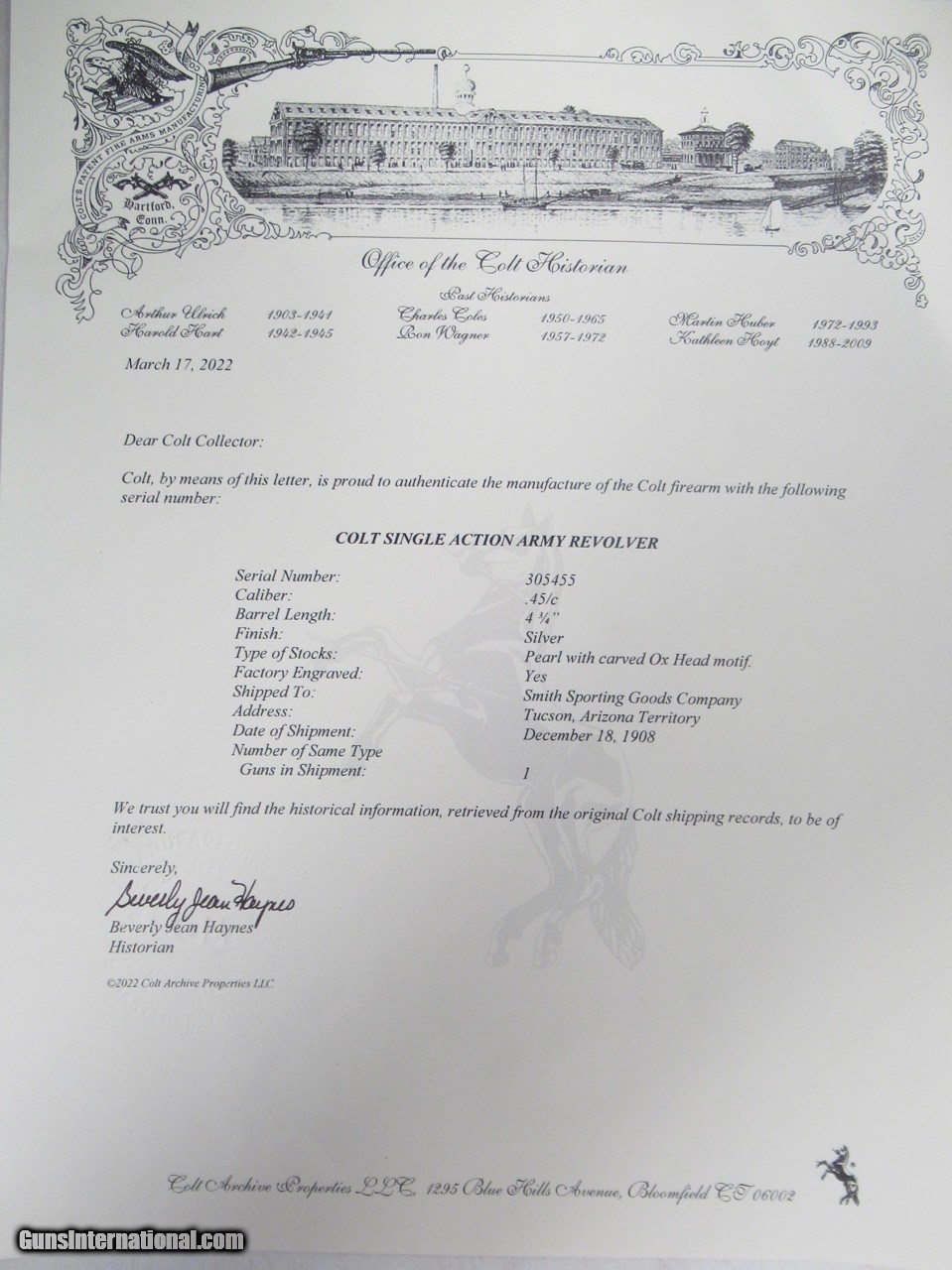 Description: Colt Single Action Army Revolver; Serial No. 305455; Per Included Factory Letter: .45 Caliber with 4 ¾” Barrel, Silver Finish, Carved Pearl Grips with Ox Head Motif; Factory Engraved (Yes); Shipped to Smith Sporting Goods Company of Tucson, Arizona Territory on December 18, 1908 as a One Gun Shipment; Fantastic Factory Engraved with Factory Carved Ox Head Pearl Grips and Silver Finish Revolver; Rare Arizona Territory Shipped 114 Year-Old Colt .45 Revolver; See All Photos for Condition; No Texts; Call (254)541-5765 or Email Only; PERSONAL PROPERTY of Harold Wieser; Price: $39,975 + $45 S&H Via USPS PRIORITY MAIL; Payment Address: Harold Wieser - 1466 U.S. Hwy 77 - Rosebud, TX 76570; SEND PAYMENTS VIA USPS PRIORITY MAIL; BEWARE of SCAMS!!! – DO NOT SEND MONEY or CORRESPONDENTS ELECTRONICALLY UNLESS YOU HAVE SPOKEN to HAROLD WIESER FIRST! 254-541-5765 SOLD |