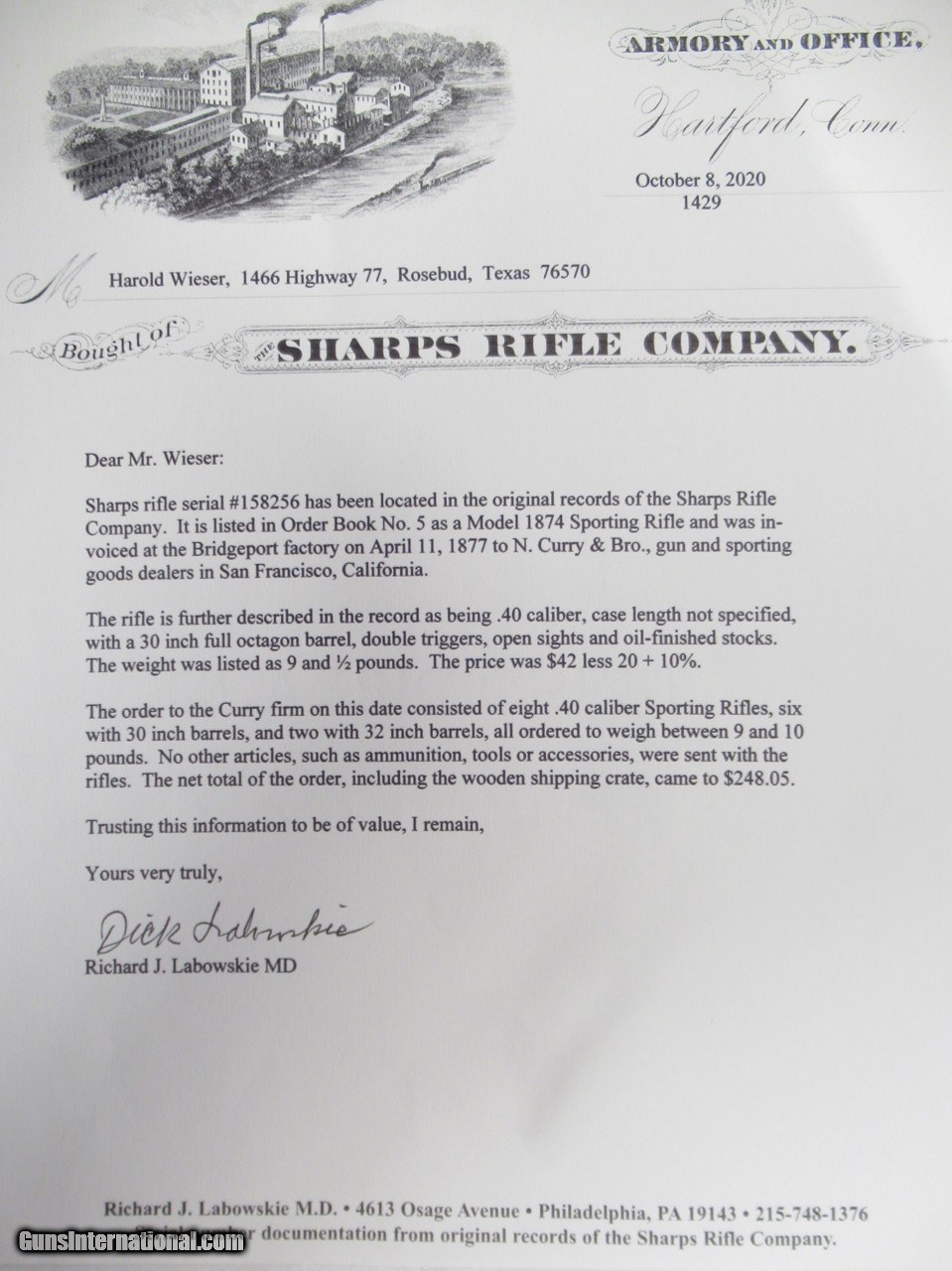 FINE ANTIQUE SHARPS 1874 SPORTING RIFLE from COLLECTING TEXAS – SHIPPED to SAN FRANCISCO, CA. in 1877 – LETTER