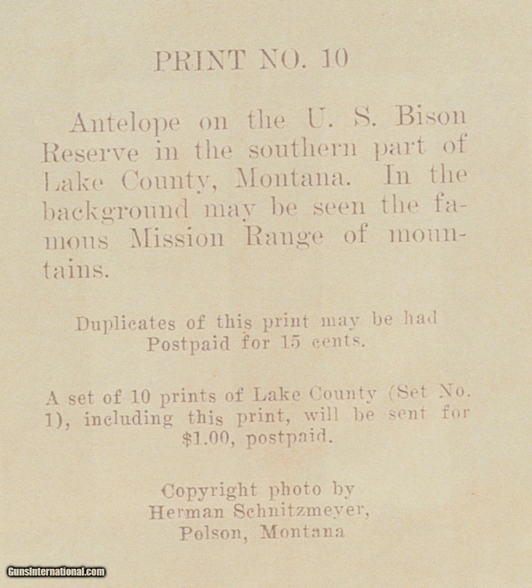 Description: Reframed as a set. Complete descriptions on reverse. No. 6 a view of the Flathead River back by the mission range of mountains. No. 7 View in Lake County , MT known as the Garden of the Rockies looking east from the Poulson hill the Northern Pacific Railway traverses the scene the wooded portion in the middle. No. 8 Along the course of the turbulant Flathead River Lake County, MT. No. 9 Hiawatha Lodge tourist resort on Wildhorse Island in Flathead Lake. Wildhorse Island is the largest of a group of islands and comprises about 2,000 acres. No. 10 Antelope on the US Bison Reserve in the southern part of Lake County, MT. In the background is the mission range of mountains. Photo prints. 5" x 6 1/2" Frame 19" x 29 SOLD |