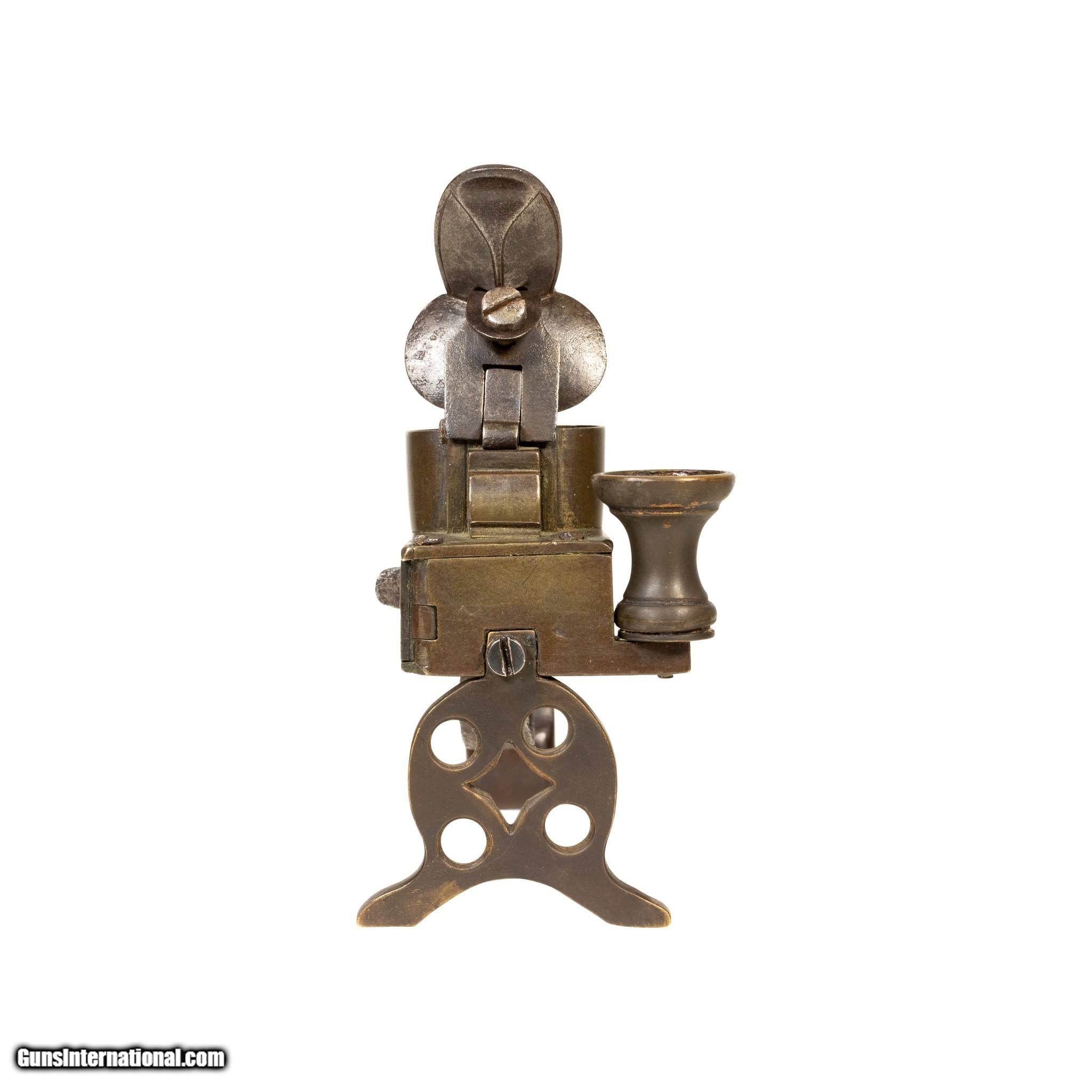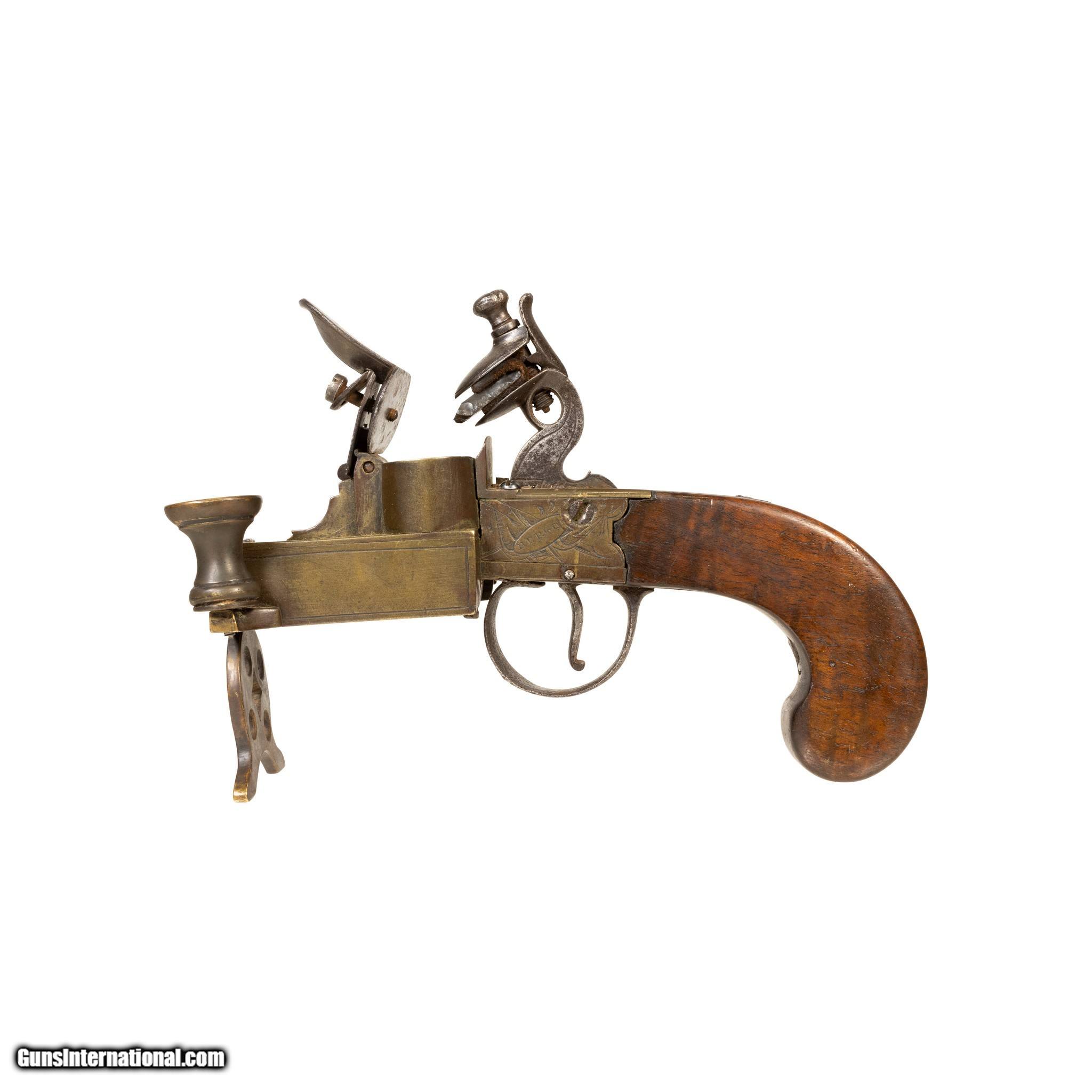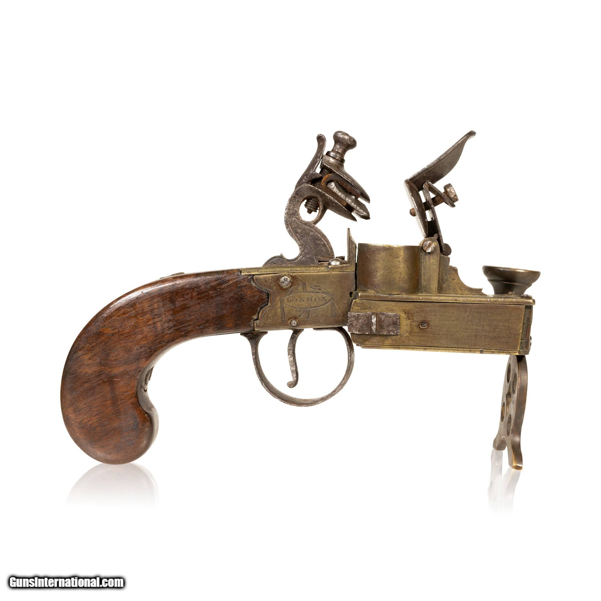 Description: 18th Century Flintlock tinder lighter by Burgon. A good example of this well known type by Burgon. Frame of brass engraved in English fashion with flags, double neck cock with line engraving, and molded friezen with line engraving. All small parts appear to be original. Flattened walnut butt. Ex. Peter Wainwright PERIOD: 18th Century ORIGIN: United States SIZE: 6"L x 5"H SOLD |