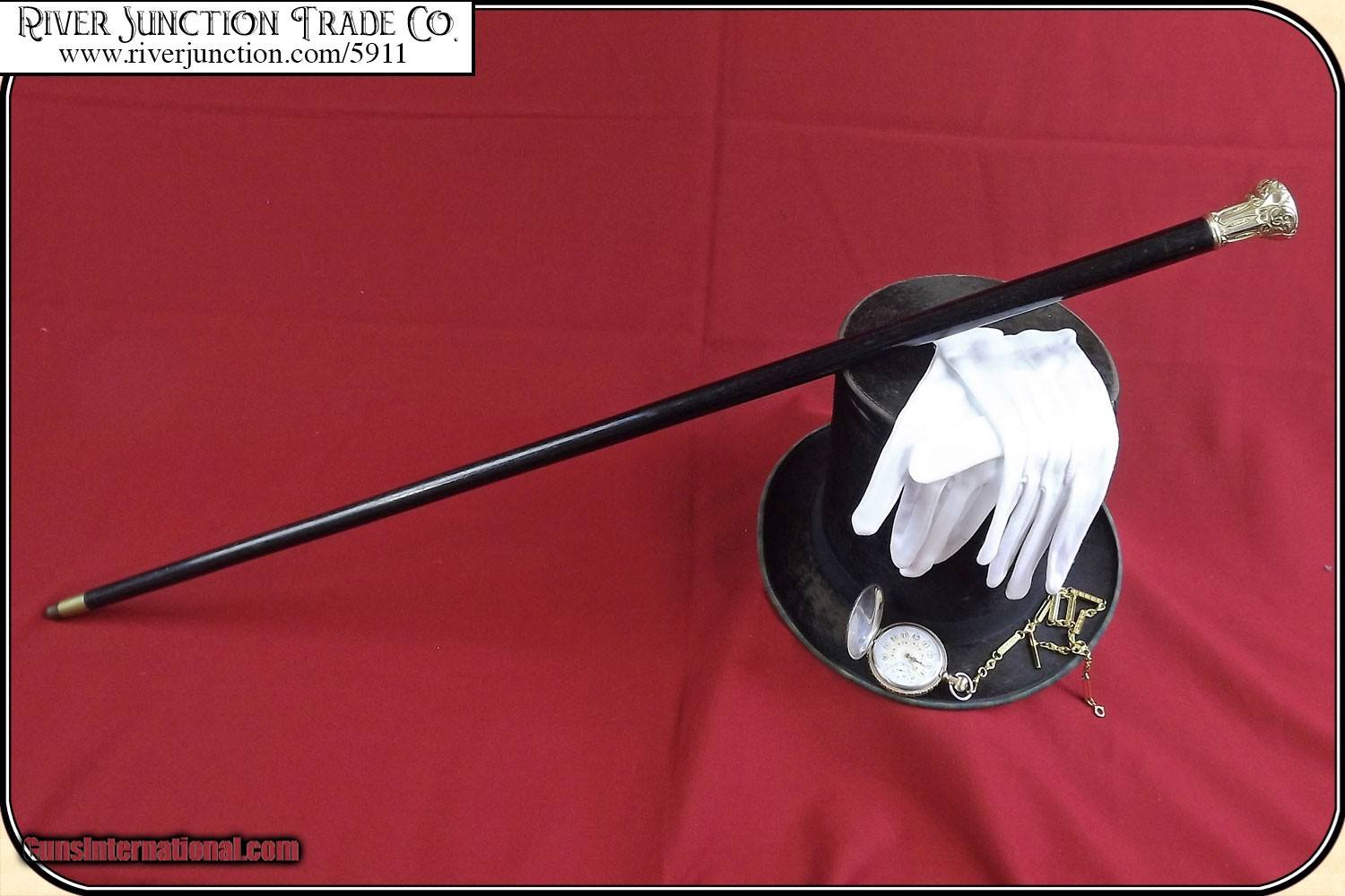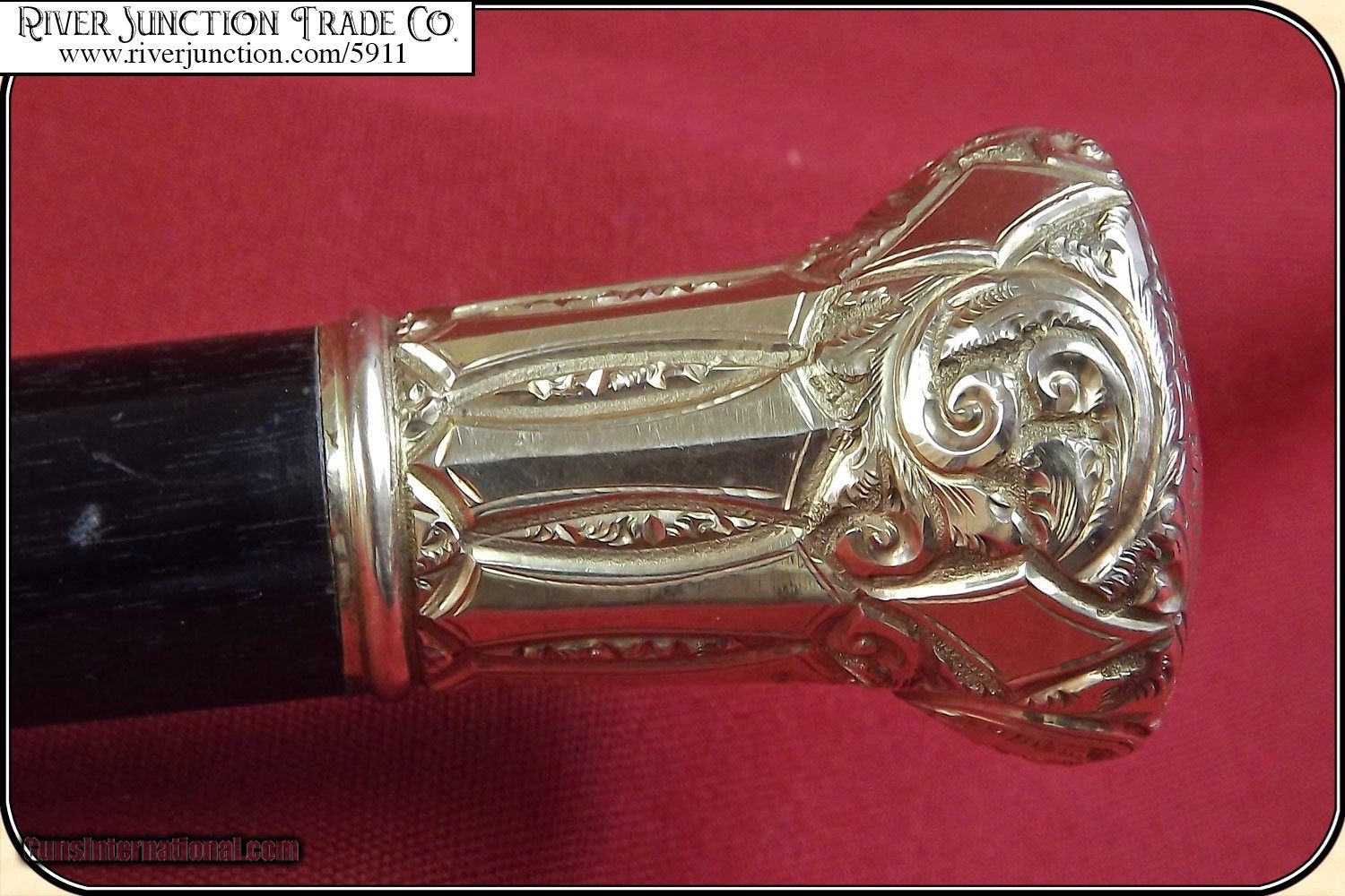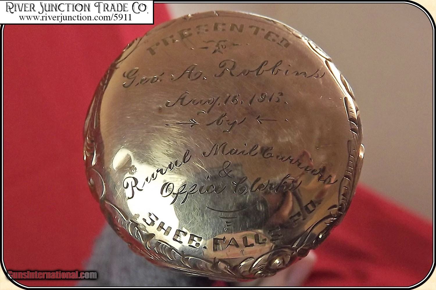 Description: Antique Gold Mounted Presentation Cane, I dated early 20th century. This presentation walking stick is inscribed "PRESENTED" "To Geo. A. Robbins Aug. 16 1913 by Rural Mail Carriers & Office Clerks Shee Falls P.O." Handle is bright Gold mounted on a black shaft. The stick is long with overall measurement of it being 36". The shaft is polished ebony hardwood. The ferrule is in very good shape with little wear on the tip. All parts are tight and secure, ready to swagger. Over all, this stick has a wonderful patina and is in excellent original condition and would make a great addition to any collection or wardrobe. A real beauty. Whereas a gentleman carries an umbrella or a walking stick he “wears” a cane. The umbrella and the walking stick are functional accoutrements; but a gentleman’s cane is a finishing touch to his wardrobe. He should give equal attention to the selection of his cane as to his choice of wardrobe, the nature of the day’s business being uppermost in his mind. Payment: Item, can be ordered with a credit card or paypal on our sight. Just Google (riverjunction) and type in the River Junction Trade Co. item number (5911) in the search box. Before you checkout you will see shipping cost and total. OR If you prefer: Pay by cash, postal money order, cashiers check, personal & business checks. We wait for checks to clear. Call me 563-880-4588. Jim SOLD |