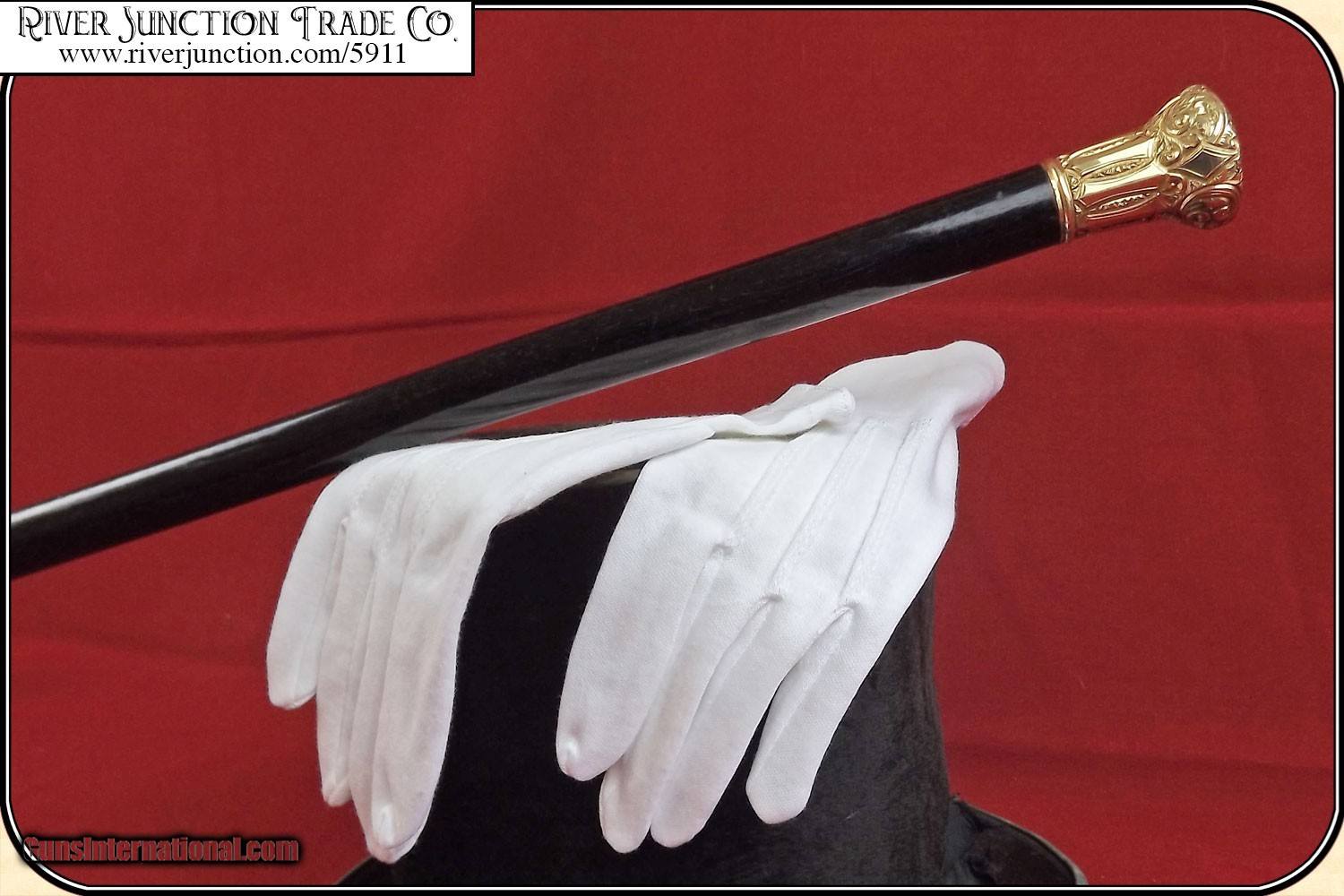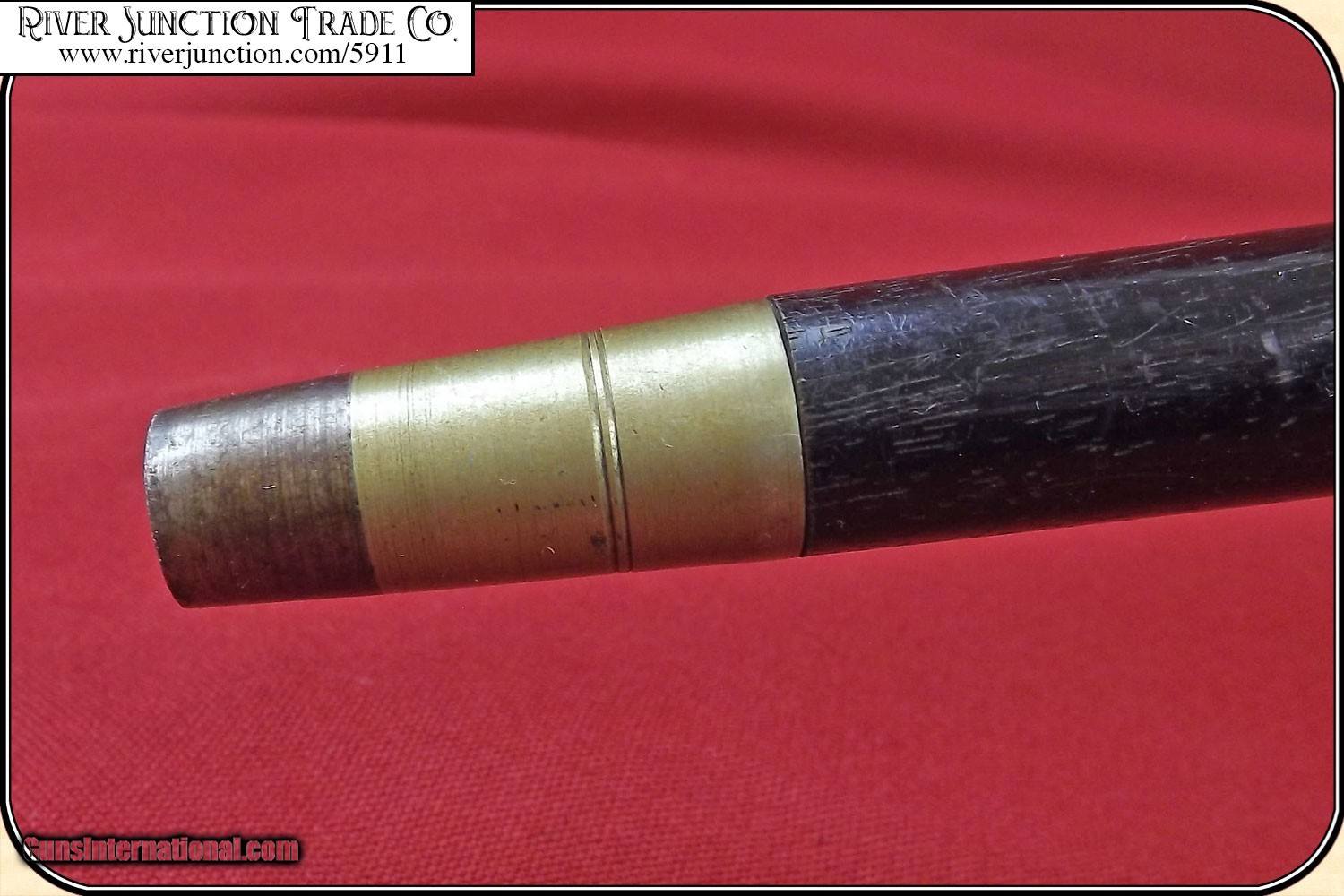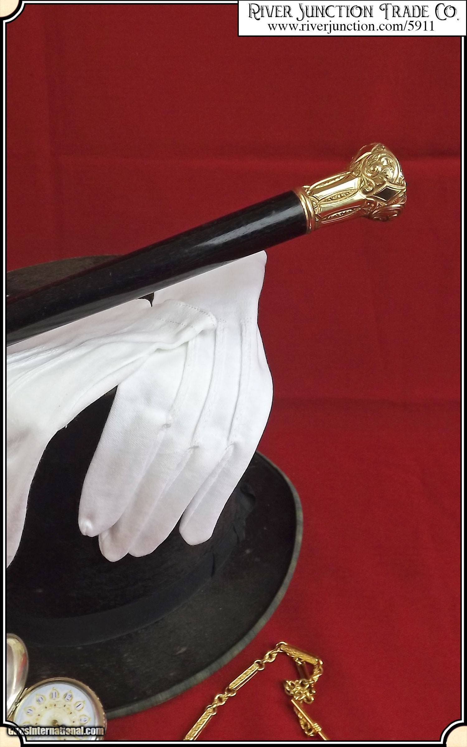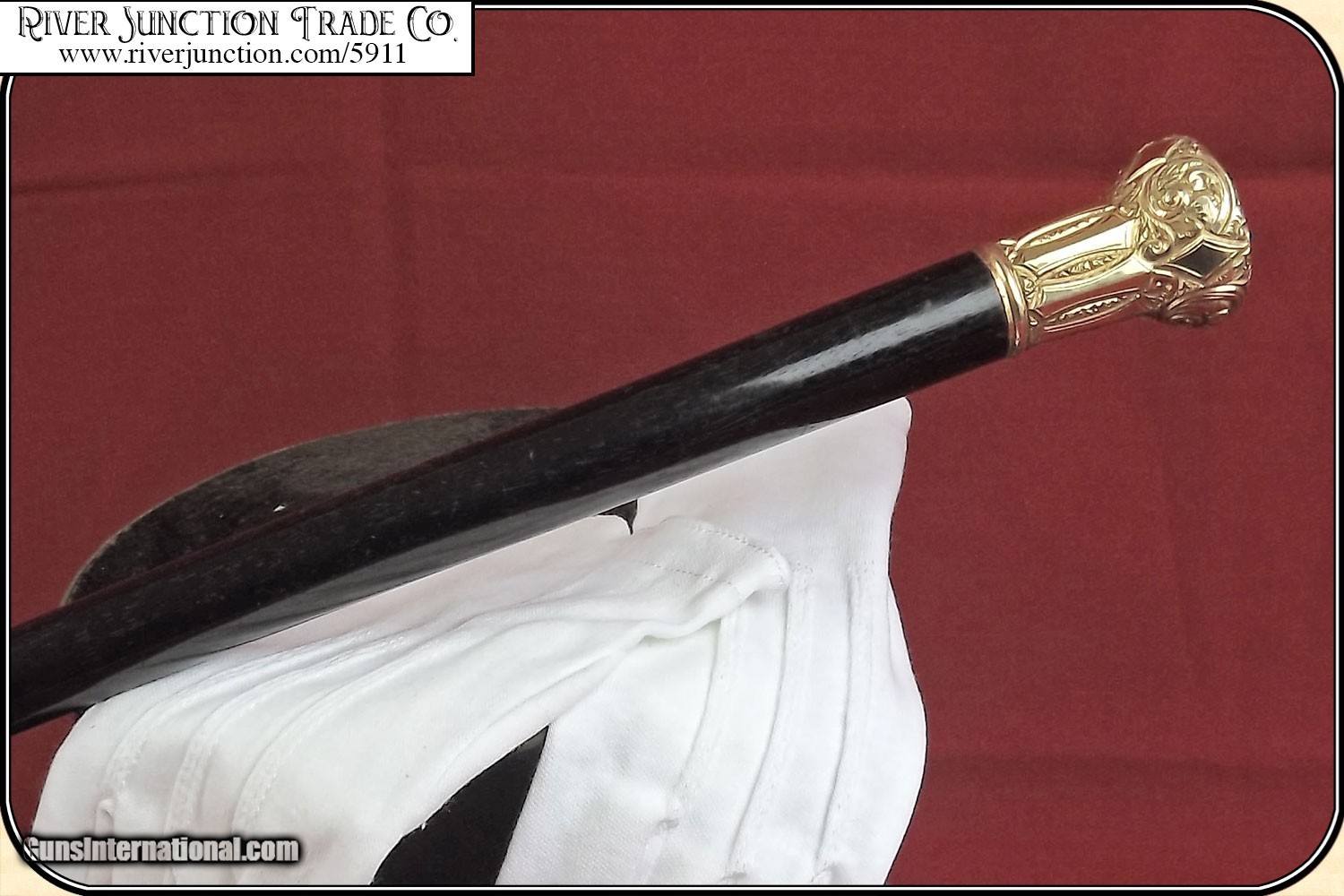 Description: Antique Gold Mounted Presentation Cane, I dated early 20th century. This presentation walking stick is inscribed "PRESENTED" "To Geo. A. Robbins Aug. 16 1913 by Rural Mail Carriers & Office Clerks Shee Falls P.O." Handle is bright Gold mounted on a black shaft. The stick is long with overall measurement of it being 36". The shaft is polished ebony hardwood. The ferrule is in very good shape with little wear on the tip. All parts are tight and secure, ready to swagger. Over all, this stick has a wonderful patina and is in excellent original condition and would make a great addition to any collection or wardrobe. A real beauty. Whereas a gentleman carries an umbrella or a walking stick he “wears” a cane. The umbrella and the walking stick are functional accoutrements; but a gentleman’s cane is a finishing touch to his wardrobe. He should give equal attention to the selection of his cane as to his choice of wardrobe, the nature of the day’s business being uppermost in his mind. Payment: Item, can be ordered with a credit card or paypal on our sight. Just Google (riverjunction) and type in the River Junction Trade Co. item number (5911) in the search box. Before you checkout you will see shipping cost and total. OR If you prefer: Pay by cash, postal money order, cashiers check, personal & business checks. We wait for checks to clear. Call me 563-880-4588. Jim SOLD |