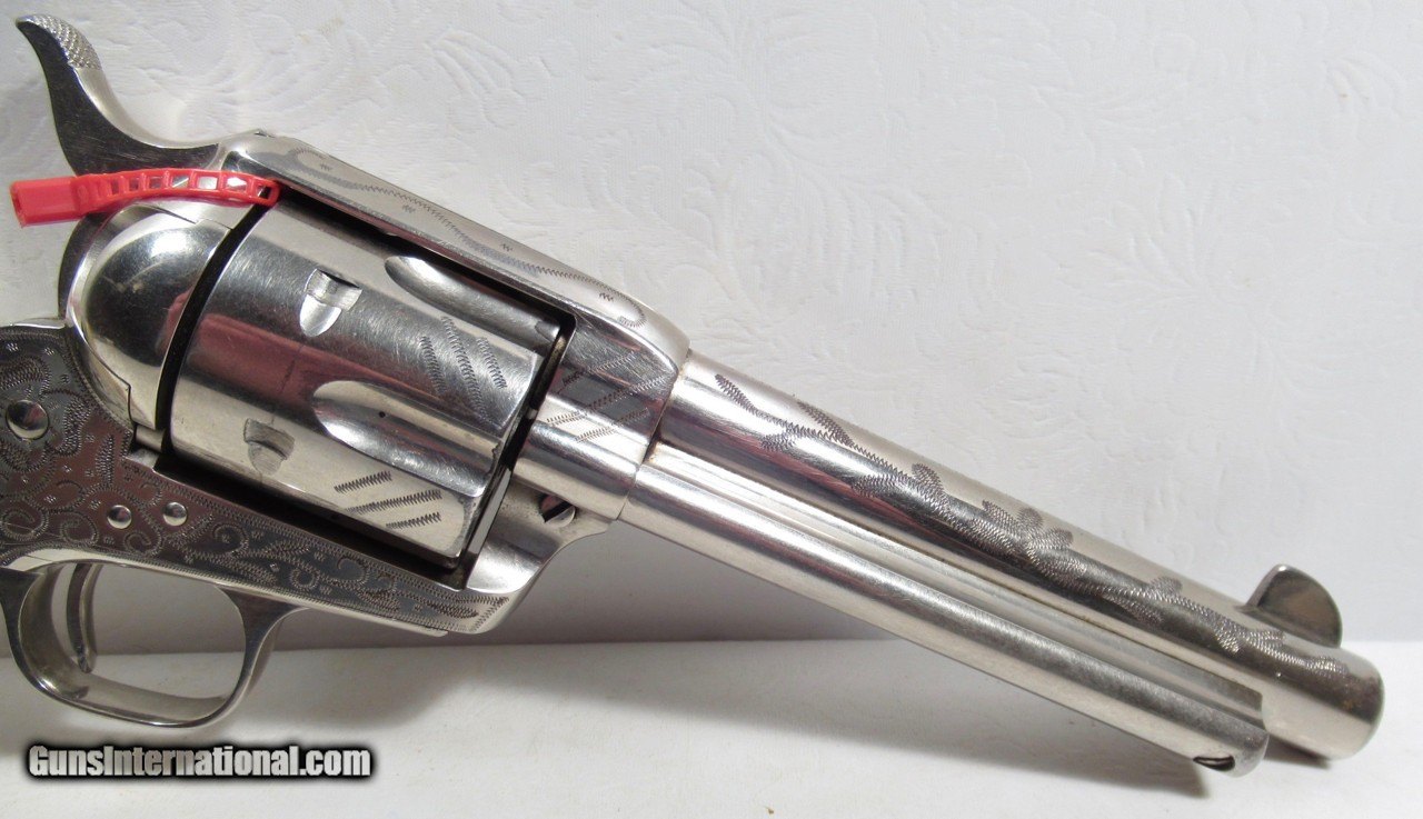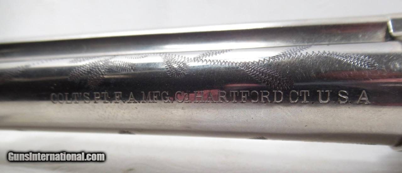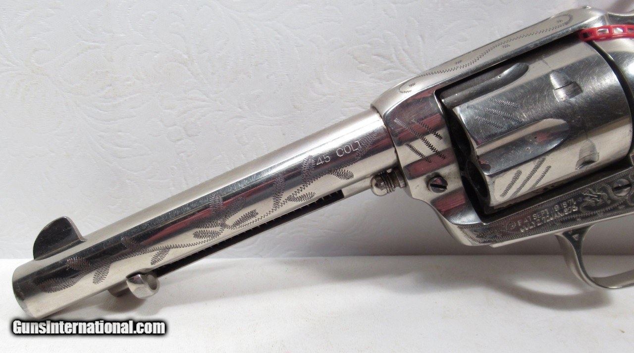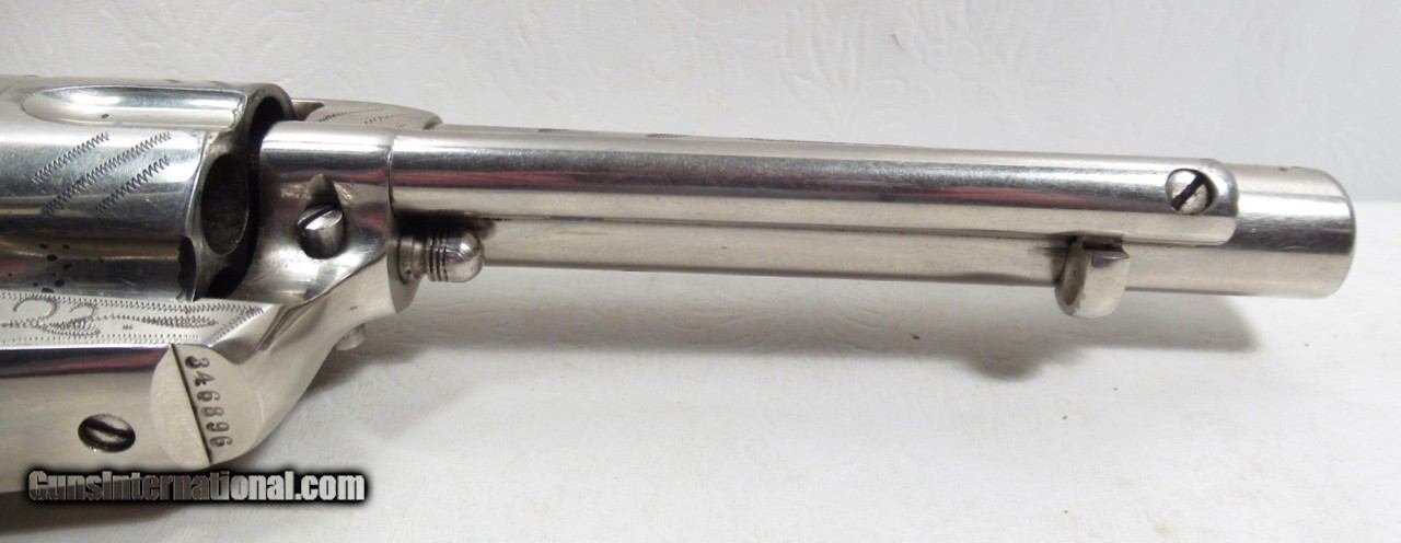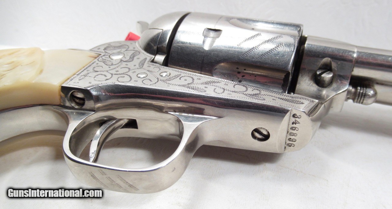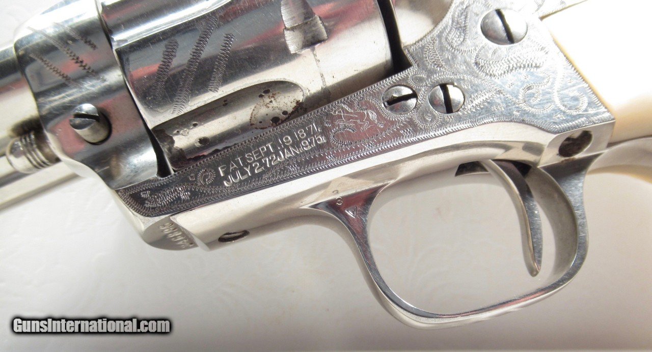 Description: Colt Single Action Army Revolver; Serial No. 346896; Per Included Factory Letter: .45 Caliber with 5 ½” Barrel and Nickel Finish; Shipped to Wolf & Klar of Fort Worth, Texas on October 17, 1924 as Part of a 5 Gun Shipment (Processed on Colt Factory Order 21006/5); Near Perfect Condition with Typical Wolf & Klar Engraving; Beautiful Wolf & Klar Style Carved Pearl Grips with Steer-Head Motif; Perfect Action and Bore; All Numbers Match; Great 98 Year-Old Texas Shipped Colt 45; See All Photos for Condition; No Texts; Call (254)541-5765 or Email Only; PERSONAL PROPERTY of Harold Wieser; Price: $7,975 + $45 S&H Via USPS PRIORITY MAIL; Payment Address: Harold Wieser - 1466 U.S. Hwy 77 - Rosebud, TX 76570; SEND PAYMENTS VIA USPS PRIORITY MAIL; BEWARE of SCAMS!!! – DO NOT SEND MONEY or CORRESPONDENTS ELECTRONICALLY UNLESS YOU HAVE SPOKEN to HAROLD WIESER FIRST! 254-541-5765 SOLD |