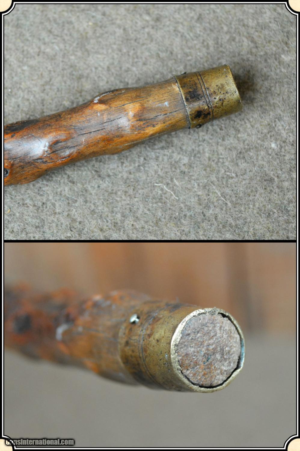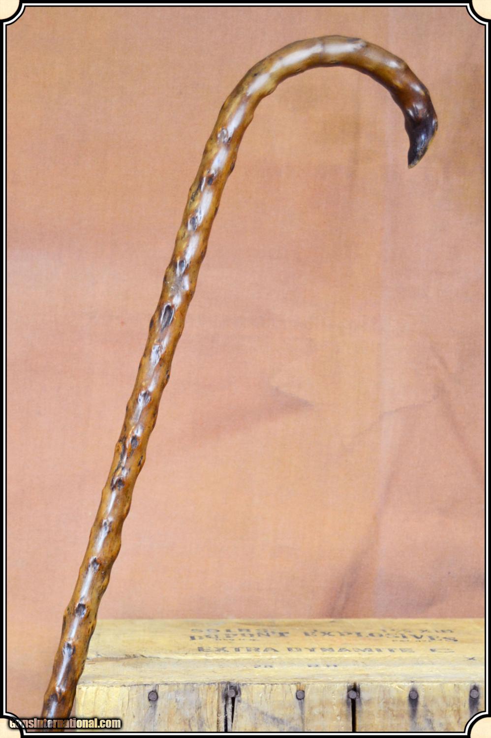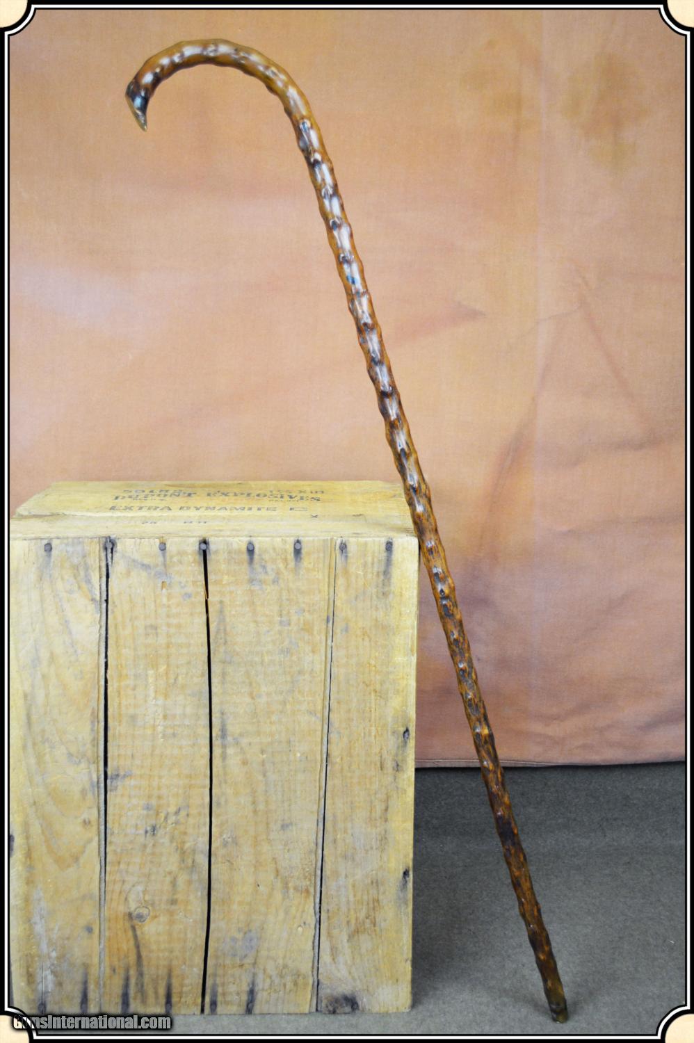 Description: This vintage blackthorn cane is extremely handsome in its simplicity. It puts me in mind of the "Little Tramp" character of Charley Chaplin. It has no cracks, and is completely solid in every way. Length is about 36 inches. It has a brass wear tip. Many Irish Shillelaghs were made from blackthorn and this cane would serve as a Shillelagh as well. PAYMENT Cash, postal money order, cashiers check, personal & business checks. May order at riverjucntion on-line with credit card. SOLD |