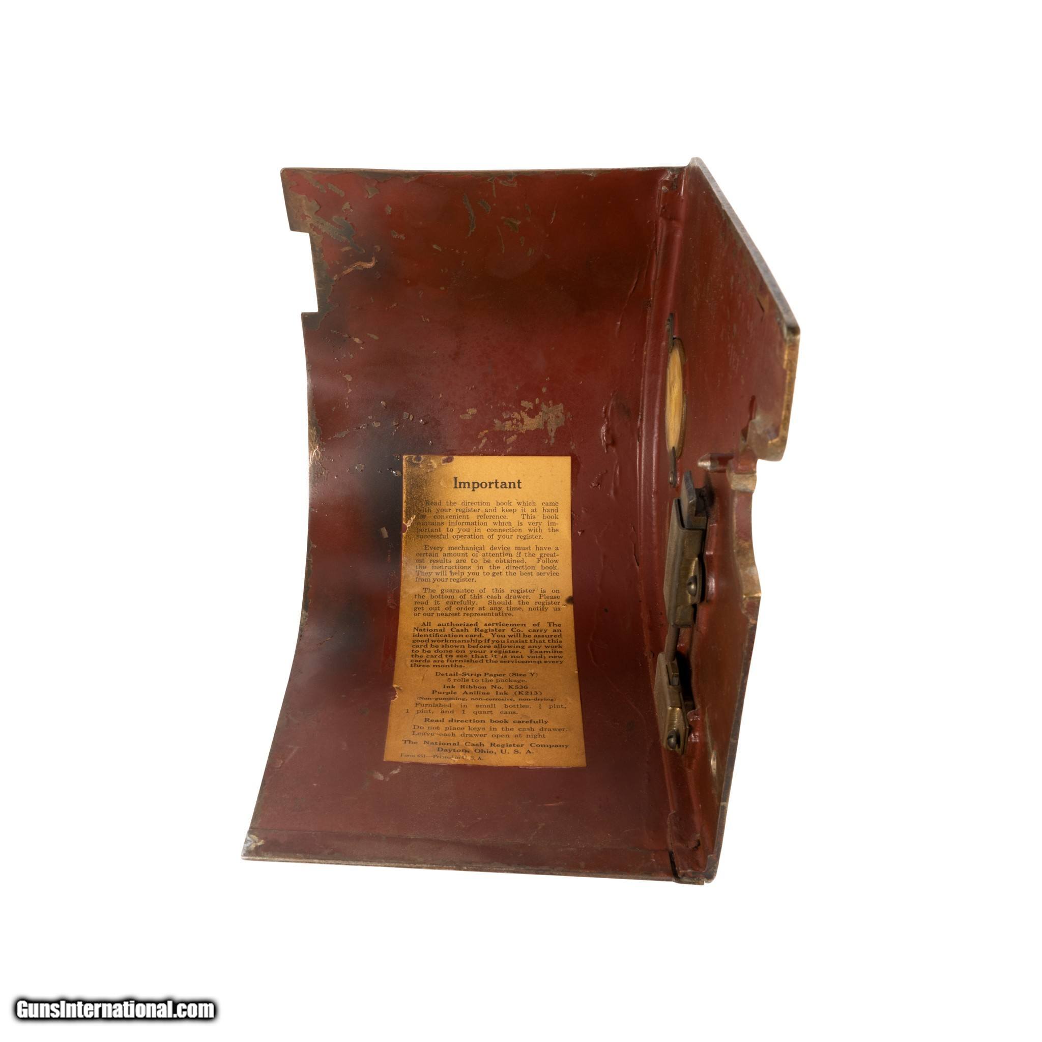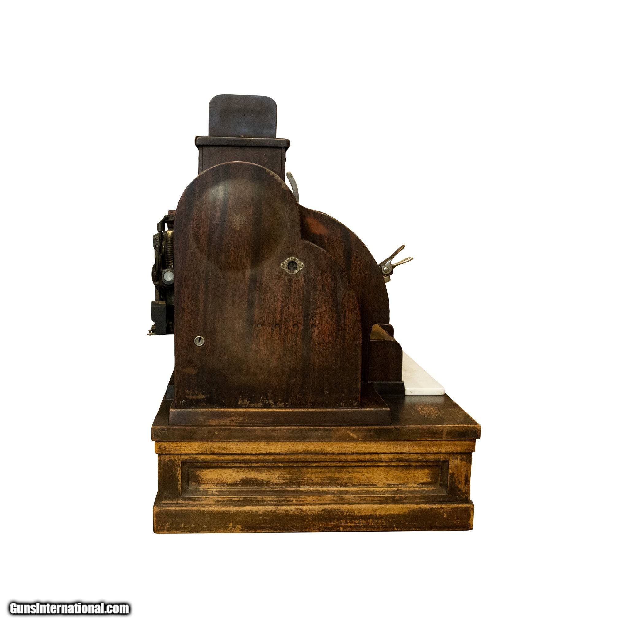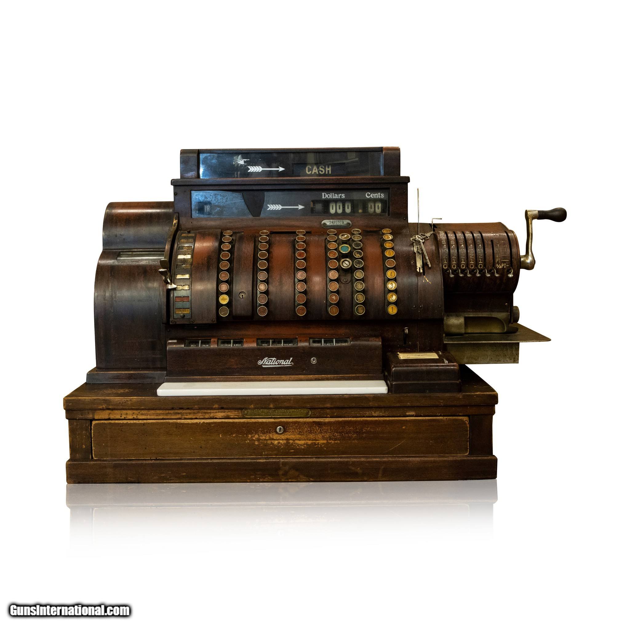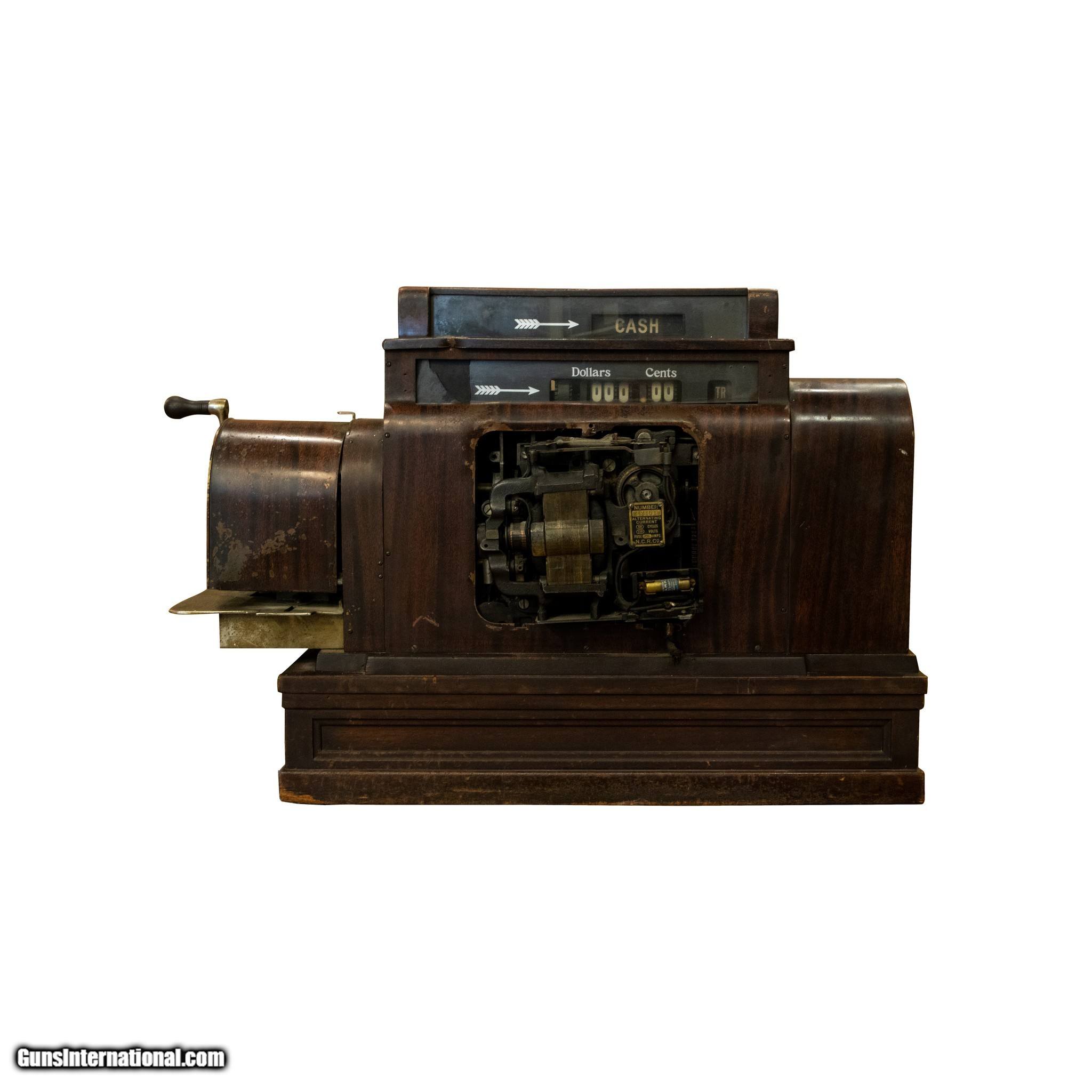 Description: Early 1900s cash register on wood base. Made by the National Cash Register Co. of Dayton, OH. Drawer opens, 57 keys, brown in color with period wear to the original paint. Model 998(5) E. "E" stands for electric. Serial #2421519. Great condition. Could continue to be used, or would look great on display in a Western themed home or collection. Size: 36" x 18"W x 24"W Family Owned & Operated Cisco’s Gallery deals in the rare, exceptional, and one-of-a-kind pieces that define the history of America and the Old West. Our pieces range from American Indian to Cowboy Western and include original items of everyday life, commerce, art, and warfare that tamed America’s frontier. Our 14,000 square foot gallery opened in 1996 in beautiful Coeur d’Alene, Idaho. Personal Service Cisco’s operates on old fashioned values – honesty and integrity, and all of our items are backed by our money back guarantee. We appreciate the opportunity to earn your business. Whether you desire assistance with a jewelry purchase, choosing a gift, identification, or even selling – we hope to be your trusted source. SOLD |