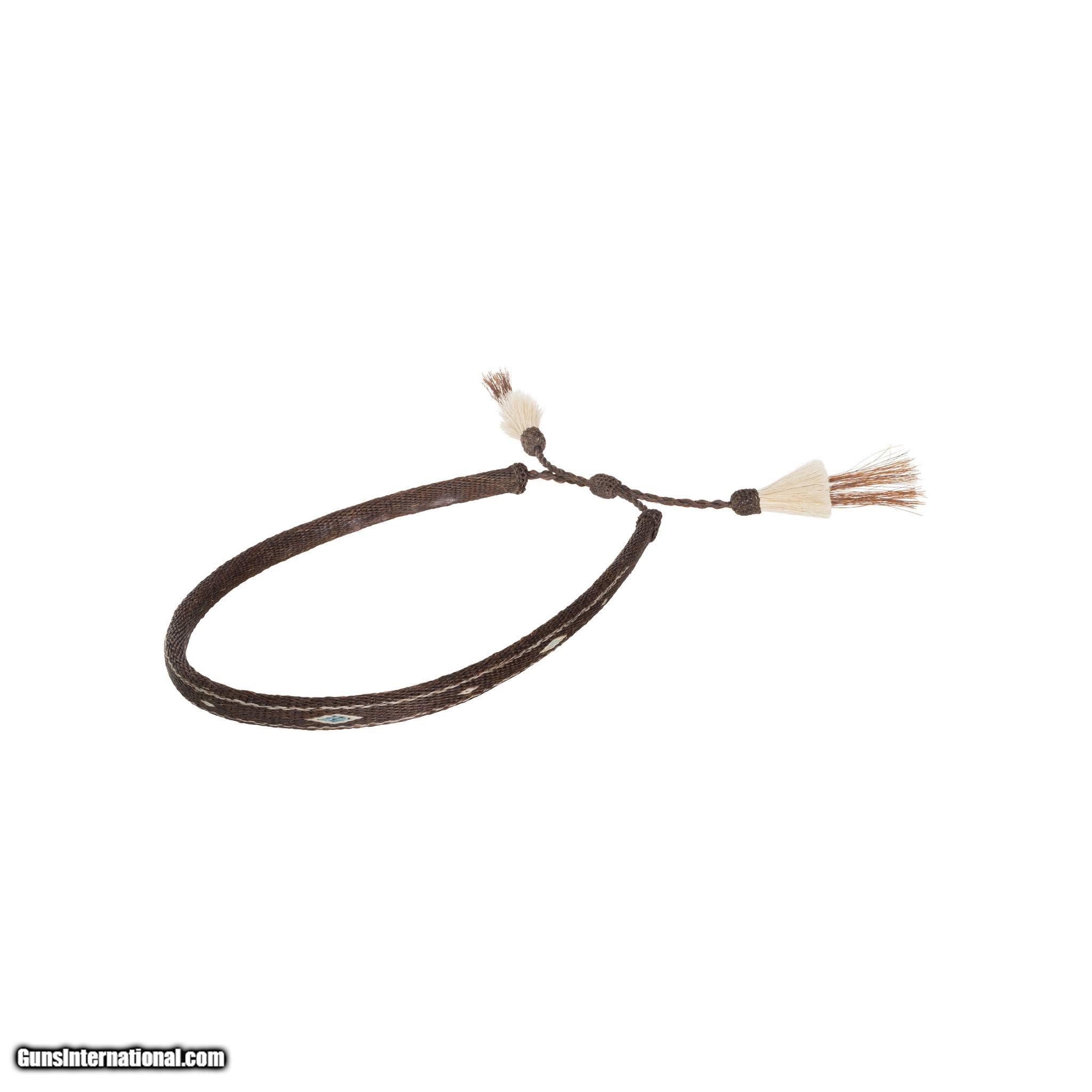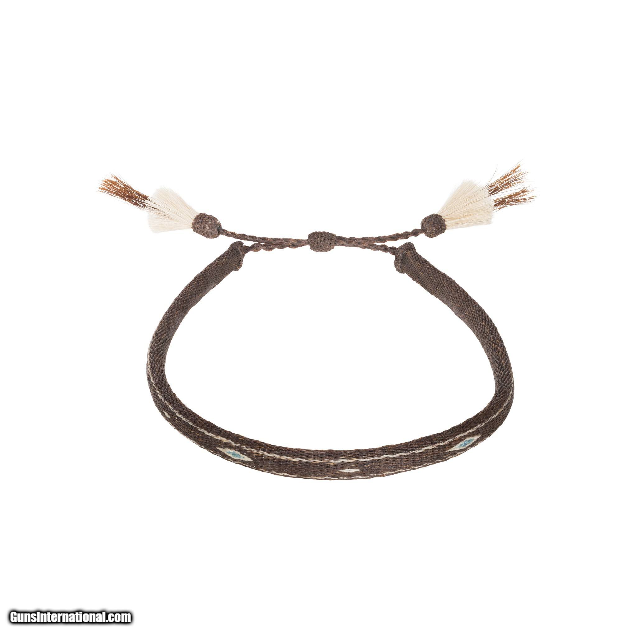 Description: Handmade horse hair hat band. Piece is a natural black color with white and cobalt blue diamonds across center of band. Band is adjustable in size. Great for continued use on a cowboy hat, either for more fancy occasions or for day to day use. Contemporary piece made in Montana. Size 26" expandable. SOLD |