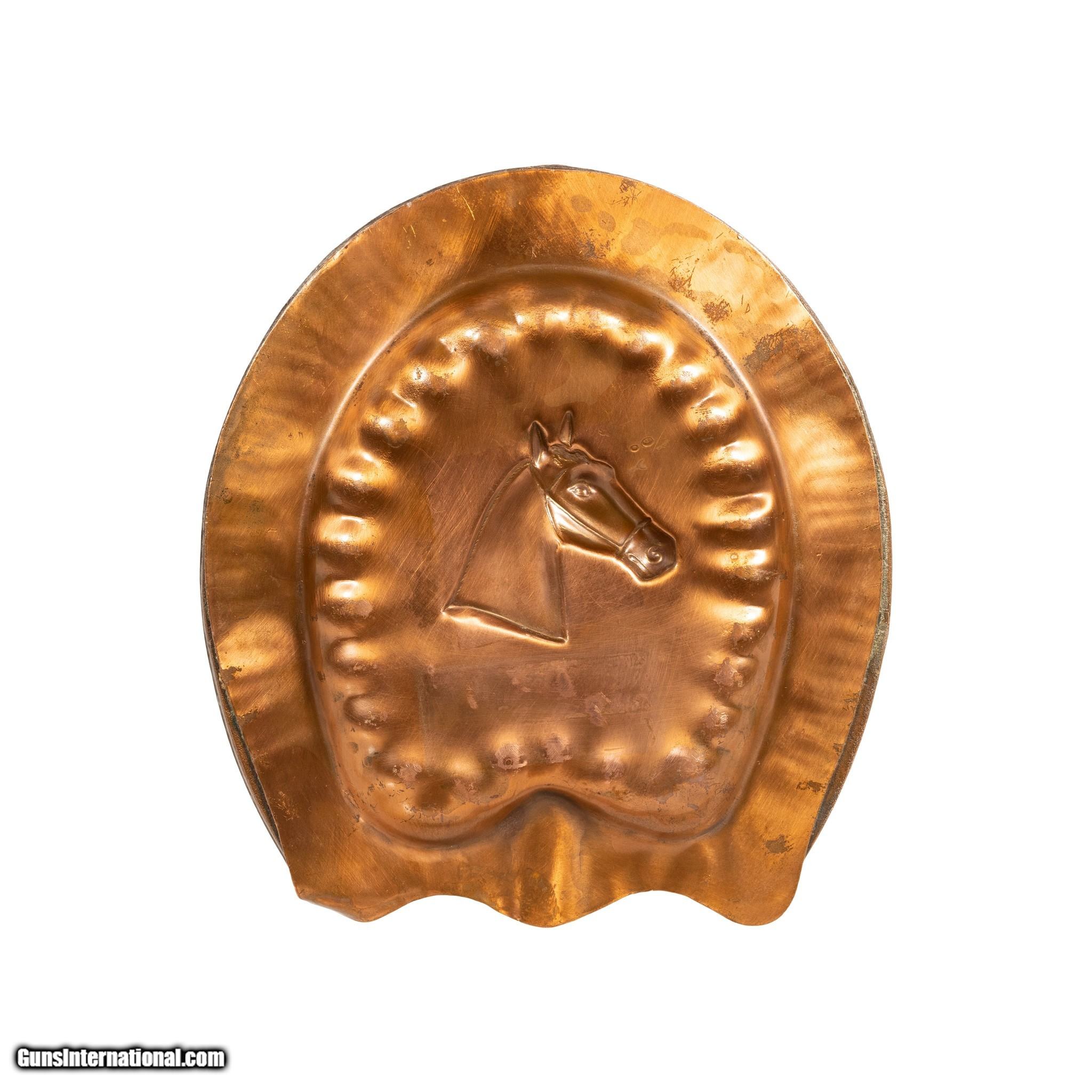 Description: Hand pounded copper ashtray. Piece features a horse head motif in the center of piece with divots around image. Exterior of piece is framed by a copperized horse shoe. Great piece of Western cowboy decor that dates back to the 1920's. Would look great in a Western, Southwestern, farm or ranch house. Piece could continue to be used as an ashtray, or could be an interesting statement piece of decor on a wall or shelf. Size: 5" x 5 SOLD |