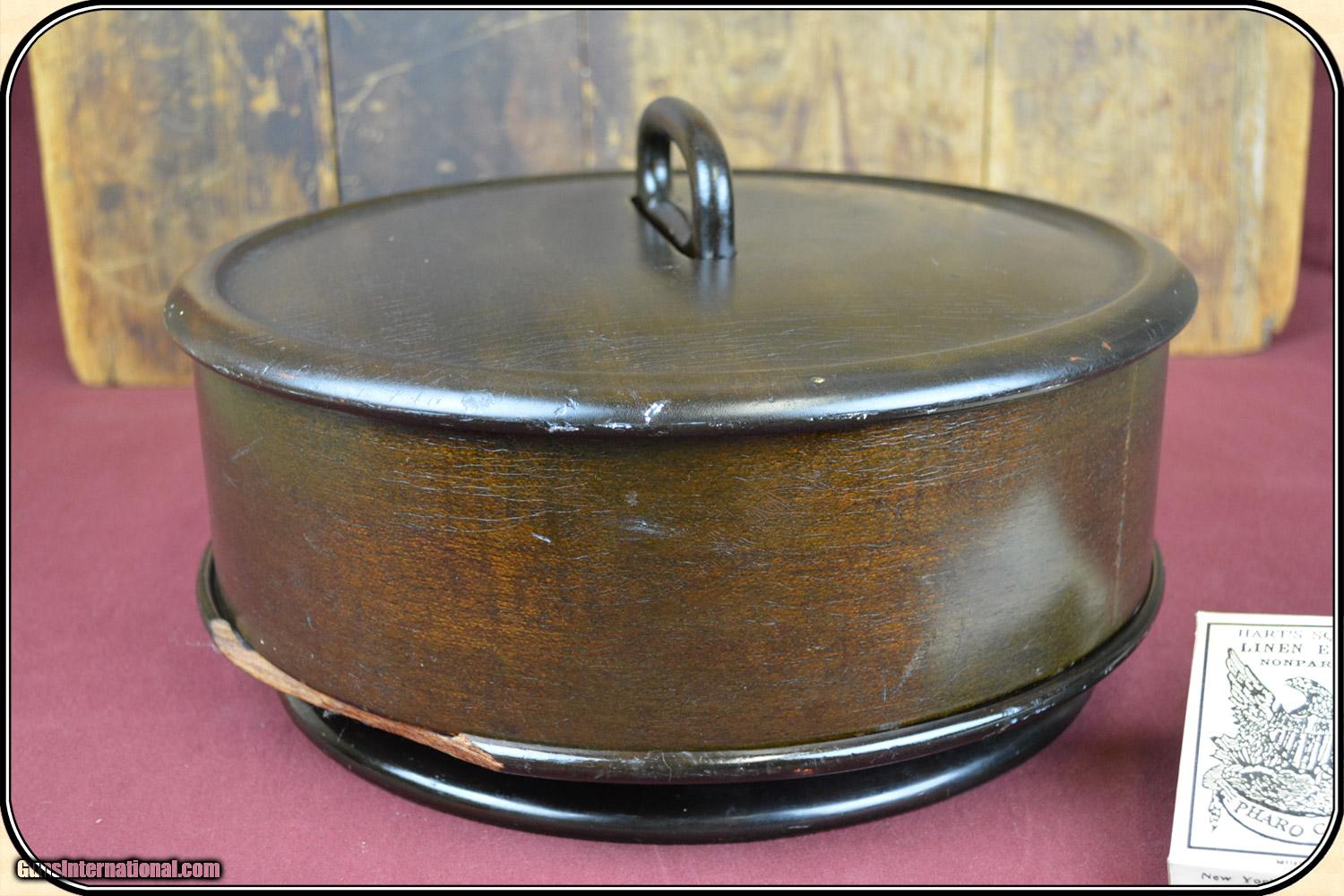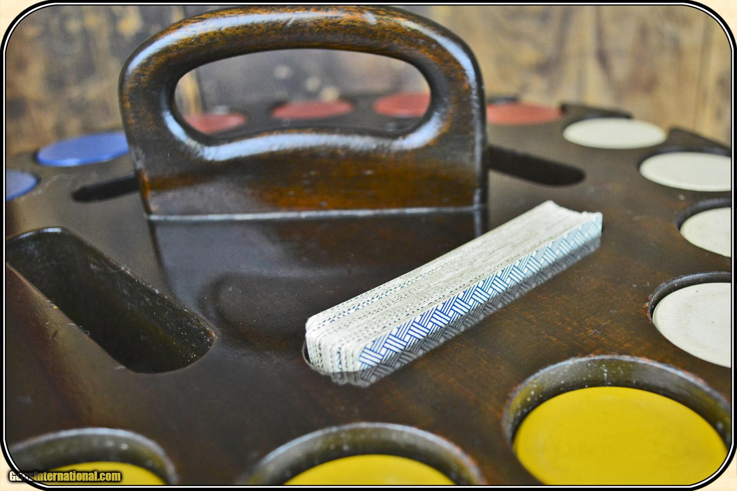 Description: Large Gambling Hall, turn table Poker Chip Rack. The chips are Victorian era clay chips. Housed in a massive solid walnut rack with slots for four decks of cards. The set has a walnut covered with an opening for the handle to pass through. The round case is 13 inches in diameter, by about 7 1/4 inches tall including the carry handle. There are 16 stacks of chips, each with about 25 chips a total of about 400 chips. 100 chips in each color: red, blue, yellow and white. The chips are 1.5 in. in diameter with no markings. They are not chipped or cracked. Fully loaded this set weighs about 17 lbs It is a wonderful large saloon type set. On the rim of the base there is a chip that does detract a little, but to find such a big set is very unusual. I have included 2 sets of old time reproduction cards. Payment Cash, postal money order, cashiers check, personal & business checks. Can be ordered with a credit card or paypal at wxx.riverjunction,cxx just type in the number 4363 in the search box. SOLD |