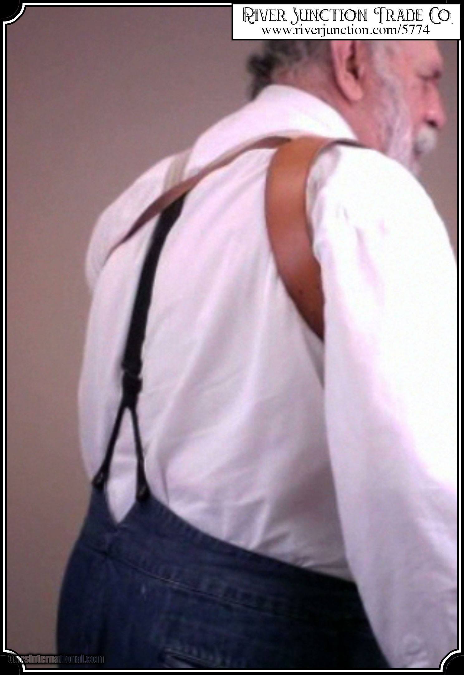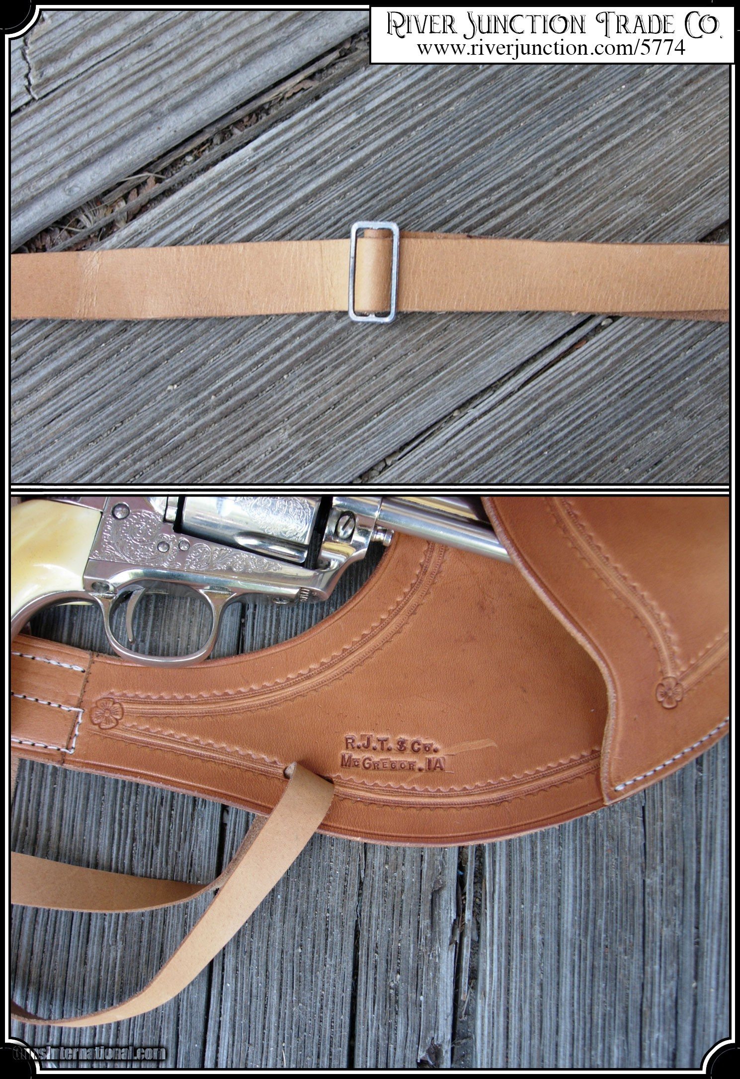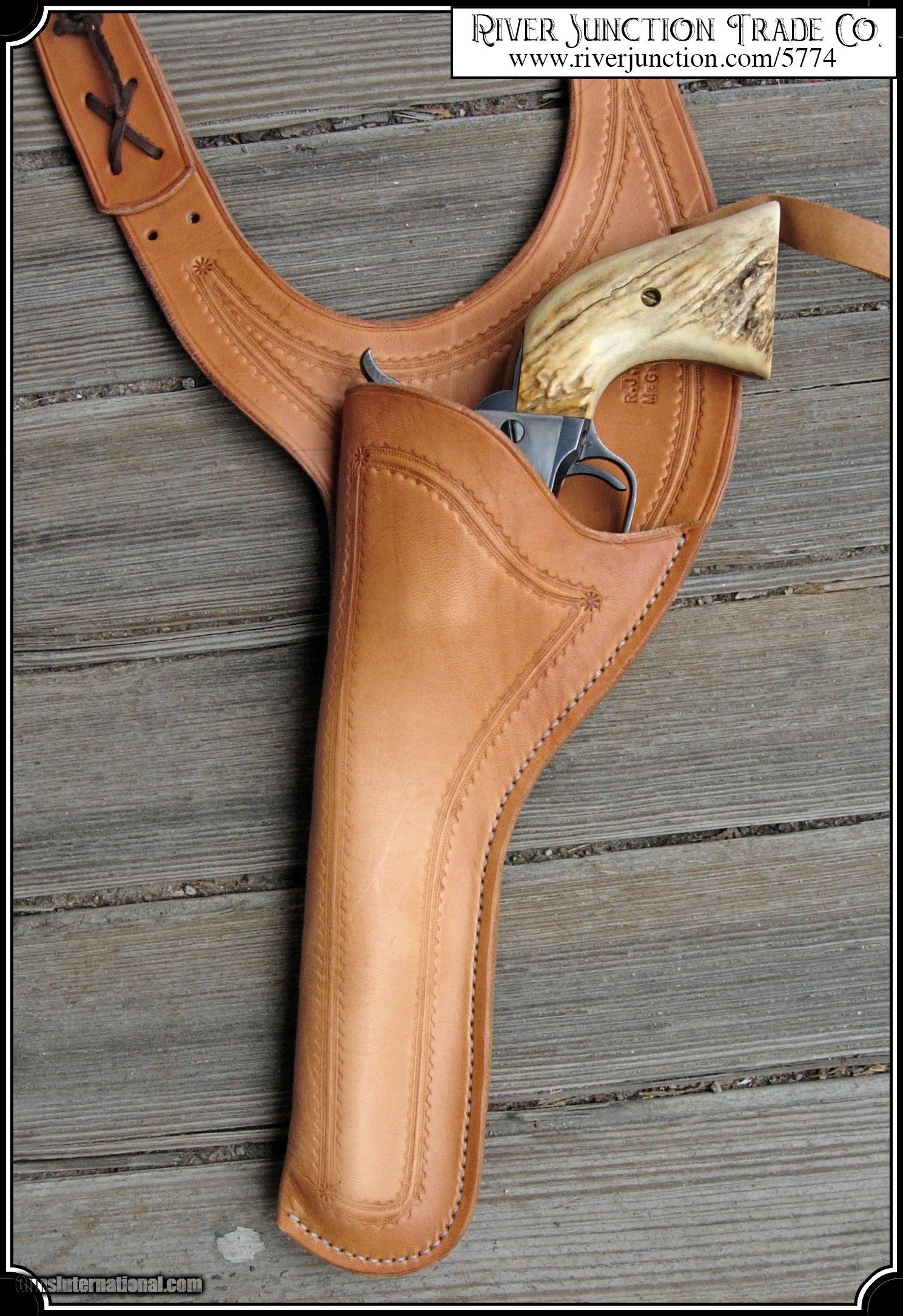 Description: Keeps revolver always safe and ready. Made of fine natural leather. Nicely embossed, with leather strap to hold holster on shoulder. These holsters are hand made from 6-7 oz leather, oiled to a rich tan. Sewn with linen thread. The boarder stamping on the pouch were chosen to closely approximate the original. This holster is made of lighter weight leather than most makers use today, more like was used in the old days, that makes it lay close to the body and comfortable to wear all day. Please choose right or left hand draw. This holster fits most large frame guns with 7 1/2" barrels. This holster is copied from an original antique Texas shoulder holster in the River Junction Collection, and as seen in the old Sear and Roebuck or Montgomery Ward catalogs. I did that because those old boys knew what they were doing. The Huckleberry Rigs of today are strictly show biz. They are made too heavy, and they will not stay in place and can not be worn comfortably all day, as the Texas can. For Holsters with a 7 1/2 to 8" barrel look at #4519, or if you have something a bit smaller try the Texas Shoulder Holster for 4 3/4 to 5 1/2 #2760. Most all of our holster designs are made from originals we have found. These holster are crafted for River Junction by our most talented leather-smith. Each piece is hand-made for us and cut in their shop from the hide. The piece is worked and tooled right on the crafter's bench and all are dyed, oiled and sewn by hand. It is the hand sewing that makes for the strongest stitch much superior to the machine stitch. All that at the most favorable price. Payment: Item, can be ordered on line with a credit card or paypal on our sight. Just Google (riverjunction) and type in the River Junction Trade Co. item number (5774) in the search box. Before you checkout you will see shipping cost and total. OR If you prefer: Pay by cash, postal money order, cashiers check, personal & business checks. We wait for checks to clear. We always answer questions and entertain offers. Have questions? Call me 563-880-4588. Jim SOLD |
