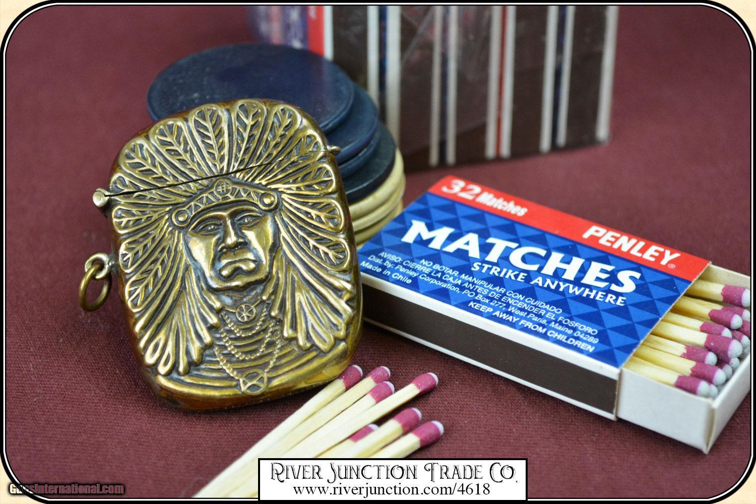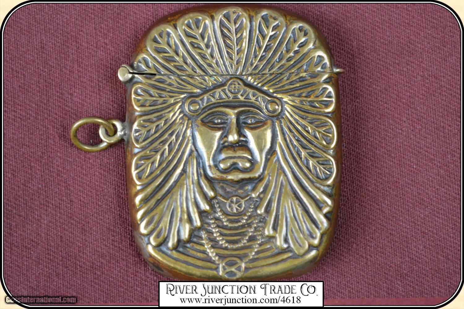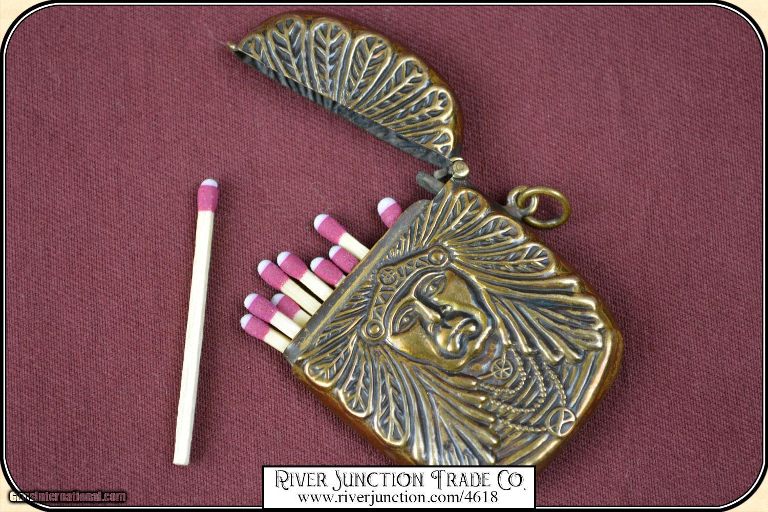 Description: Antique Match Safe/vesta in the shape of an American Indian head. This is a very old match safe. The top is hinged and is tight. The knurled surface on the bottom is were the match head would strike. I believe it is nickel with a old gold wash finish. See pictures. Almost no ware in beautiful condition. Measures 2 1/8" tall and 1 5/8" wide. This match-safe will be a prize possession of yours. This vintage match safe dates from the late nineteenth century. The ring on the side will be perfect to fasten to you watch chain. Excellent shape for the age. There are no splits, no breaks, and no repairs. Lid opens to almost 90 degrees and closes with a secure click. Hinge is excellent. The collectors have been hard after these and that makes them hard to find. Will hold the small vest pocket matches. We include a package of 10 boxes of the vest pocket matches. They are the good strike anywhere matches. Just think of the looks you will get when you pull this out of your vest pocket and light your cheroot. Payment Cash, postal money order, cashiers check, personal & business checks. Can be ordered with a credit card or paypal at wxx.riverjunction,cxx just type in the number 4618 in the search box. SOLD |