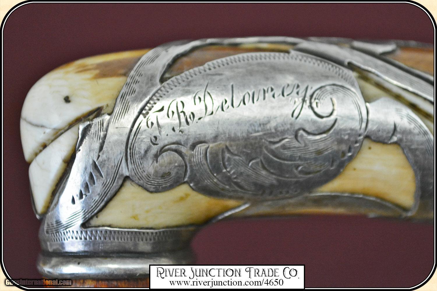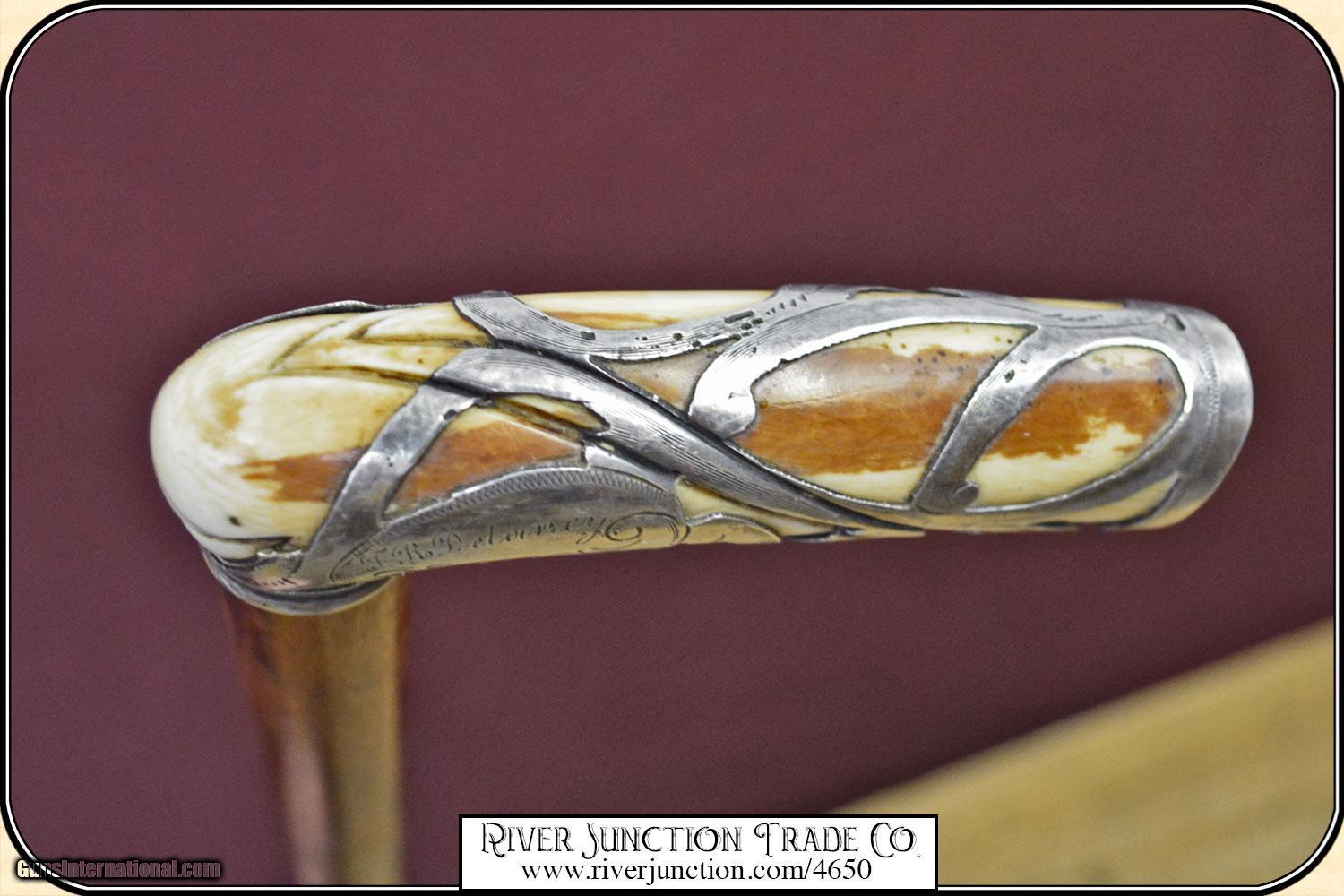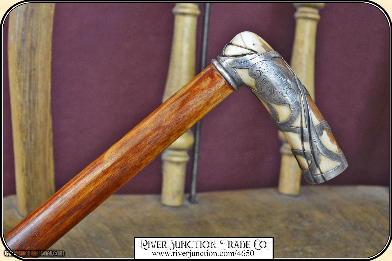 Description: Art Deco looking, silver over ivory cane. The Hippo ivory “L” handle is 1 1/4" high and 4 1/2" long. It has carved grooves that the silver is sunk into. Blunt on the end where the silver over caps it. Additionally, it is encased in a decorated lattice silver cage with its owners name: “T.R. Delaney”. Delaney is said to be a riverboat Captain on the Missouri river, however I can not find a record of him.The shaft is a hard wood that terminates with a 2 1/4" brass ferrule. The overall length is 36" and the condition is very good. It is American, ca 1890. The handle and wood are all stable and ready to use. Payment Cash, postal money order, cashiers check, personal & business checks. Can be ordered with a credit card or paypal at wxx.riverjunction,cxx just type in the number 4650 in the search box. SOLD |
