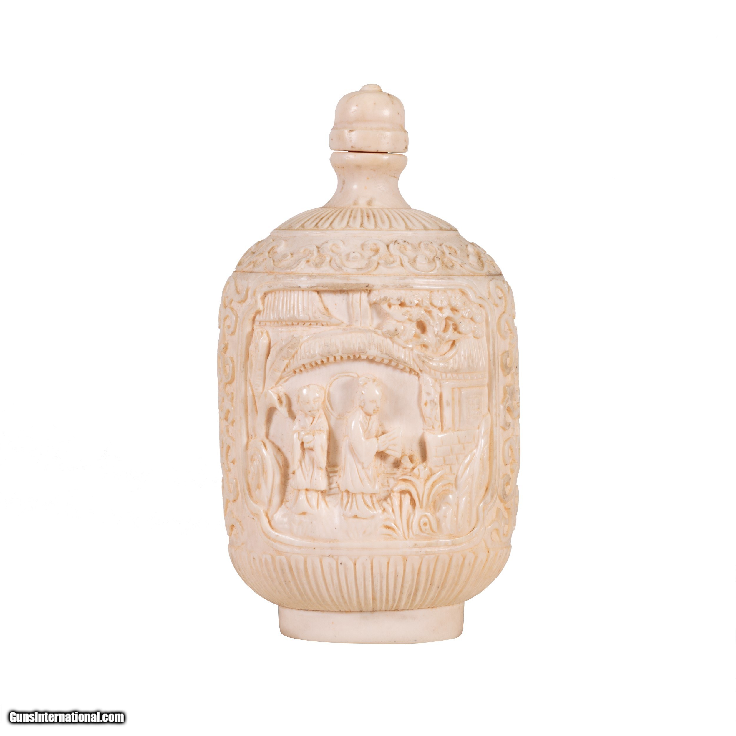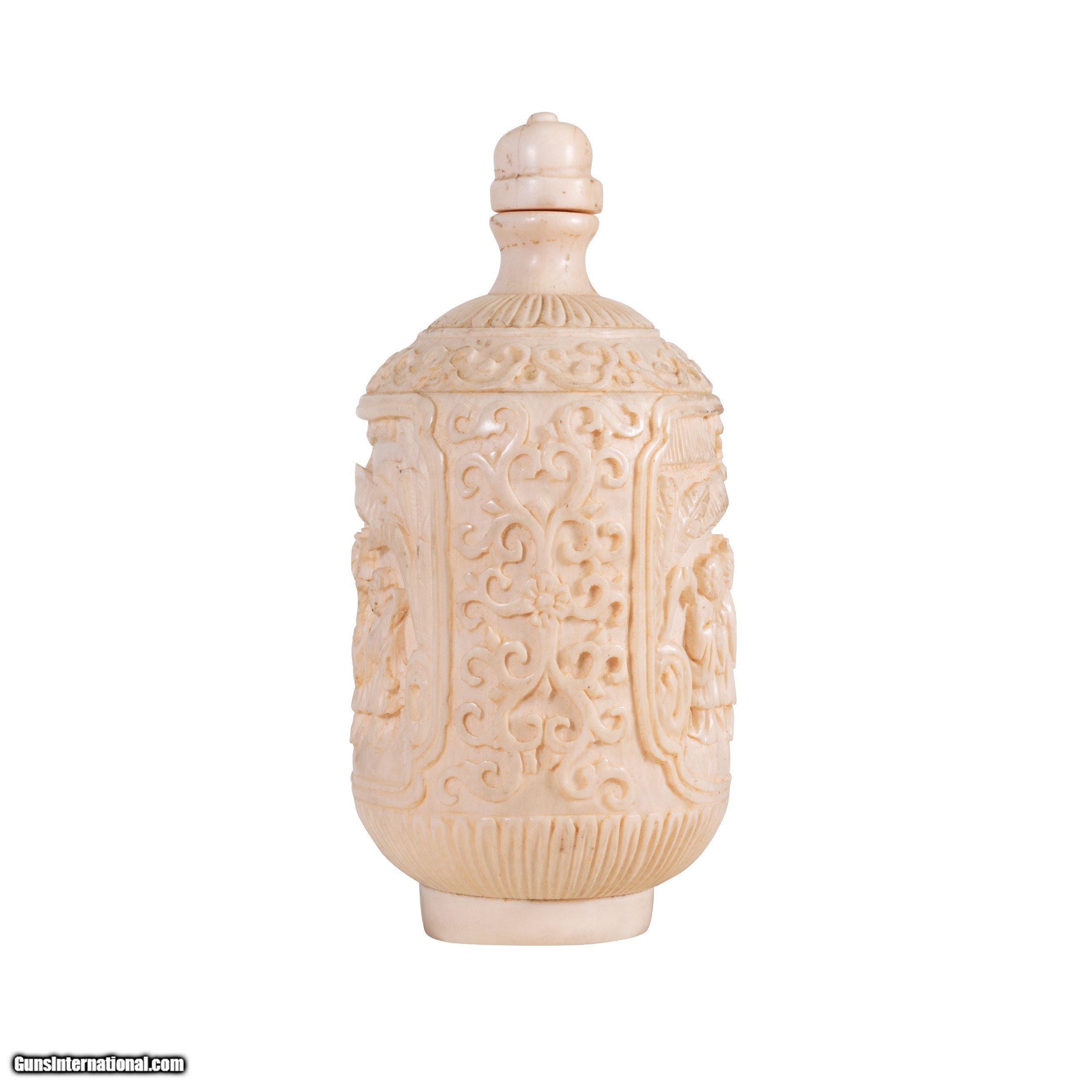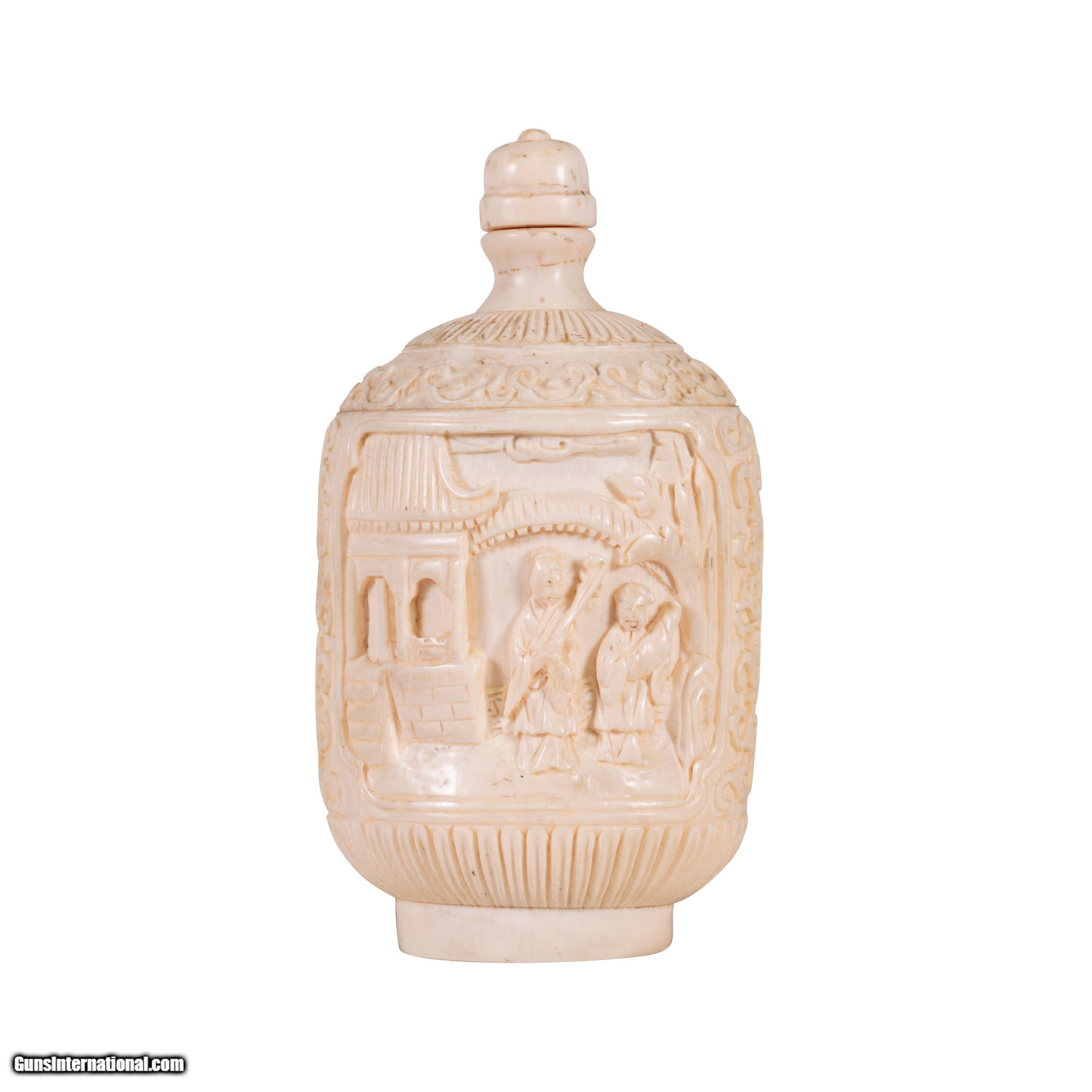 Description: Ivory snuff bottle. Bottom marked. Ex. Ortiz Collection 5"H x 2 1/2"W Cisco’s complies with all State and Federal regulations regarding the commerce of ivory. This item is not available for international shipment or within the United States to Hawaii, Nevada, New Jersey, New York Oregon or Washington. SOLD |