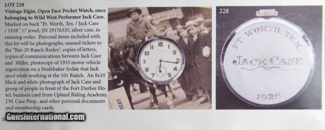 Description: 101 Ranch, Gold Plated Winchester Model 1873, SRC; Serial No. 461401B; Made 1893; .44-40 Caliber with a 20” Barrel; This SRC belonged to Jack Case who traveled all over the United States during and after the Great Depression, producing and performing in rodeo shows. He managed his own rodeo shows under the company name “Jack Case Rodeo Attractions” and later outfit as the “Bar-20 Ranch Rodeo”, whose appearances were sponsored by such organizations as the Family Welfare Agency, American Legion Posts, and regional Elk Lodges. Case was the assistant arena director of the Pendleton Round-Up in 1923 and went on to direct and perform in Buck Taylor’s Wild West Show at the Million Dollar Pier in Atlantic City, New Jersey. Case also performed with his friend Miller’s 101 Ranch Wild West Show, which toured all over America, and Case acted as manager of the 101 Ranch shows during their European tours in 1924 and 1926. This Winchester is a .44-40 caliber SRC with a 20” Barrel. The entire exterior is Gold washed or Gold plated except the dust cover, saddle ring, elevator, and door in the butt plate which are nickel. The barrel markings are light but readable. The rear sight is a flip up, ladder sight and the front sight is a standard blade. Stamped on the left side of the lower tang is “J. Case” which is not visible with the butt stock in place. The walnut butt stock is in good condition with gaps in the wood to metal fit. The forearm has a chip missing from either side in front of the frame. The action functions properly and the bore is dark. The lever return spring is not functioning properly. Affixed to the right side plate is a 25 cent token from the 101 Ranch store. This Winchester is accompanied by a large folder of personal photos, documents, flyers and personal correspondence from Jack Case. Jack was born Willard Luna Case, Sept. 3, 1902 in Edneyville, North Carolina, he disliked his name and started going by Jack or J.W. Case. There is no record of his death information but it is likely he died sometime in the last quarter of the 20th century. Also Accompanied by a Vintage Elgin, Open Face Pocket Watch. Marked on back “Ft. Worth, Tex. / Jack Case / 1928”, 17 Jewel, Serial No. 29176335, Silver Case, in Running Order. Accompanied by Personal items such as photographs, unused tickets to the “Bar-20 Ranch Rodeo”, copies of letters, copies of communications between Jack Case and Miller, photocopy of 1933 motor vehicle registration on a Studebaker Sedan that Jack used while working at the 101 Ranch. An 8x10 black and white photograph of Jack Case and group of people in front of the Fort Durkee Hotel, business card from Upland Riding Academy, J.W. Case Prop., and other personal documents and membership cards. One of the Best Items Coming From the 101 Ranch Collection of Buddy King, Canadian, Texas; See All Photos for Condition; No Texts; Call (254)541-5765 or Email Only; PERSONAL PROPERTY of Harold Wieser; Price: $8,975 + $75 S&H Via USPS PRIORITY MAIL; Payment Address: Harold Wieser - 1466 U.S. Hwy 77 - Rosebud, TX 76570; SEND PAYMENTS VIA USPS PRIORITY MAIL; BEWARE of SCAMS!!! – DO NOT SEND MONEY or CORRESPONDENTS ELECTRONICALLY UNLESS YOU HAVE SPOKEN to HAROLD WIESER FIRST! 254-541-5765 SOLD |