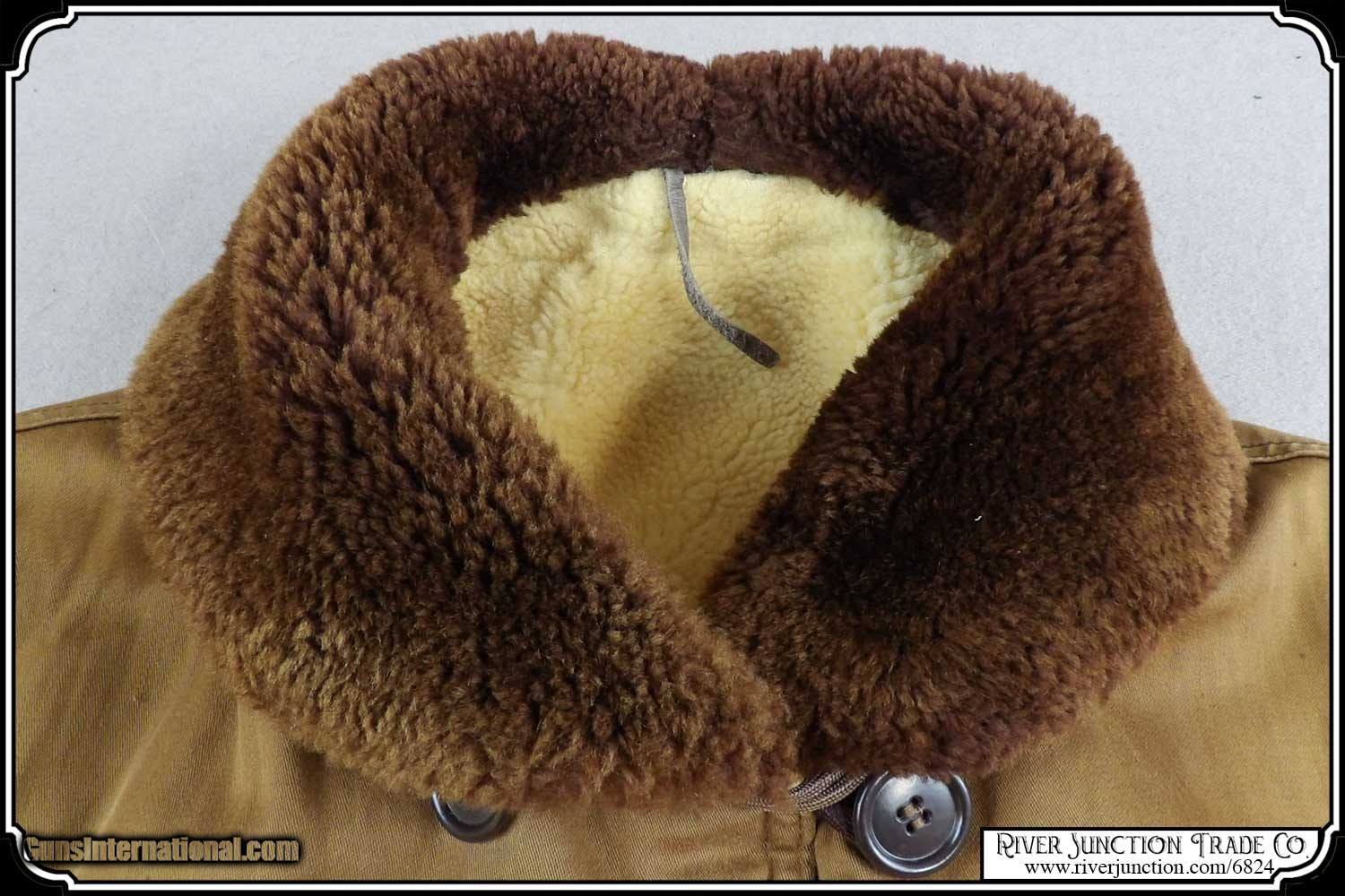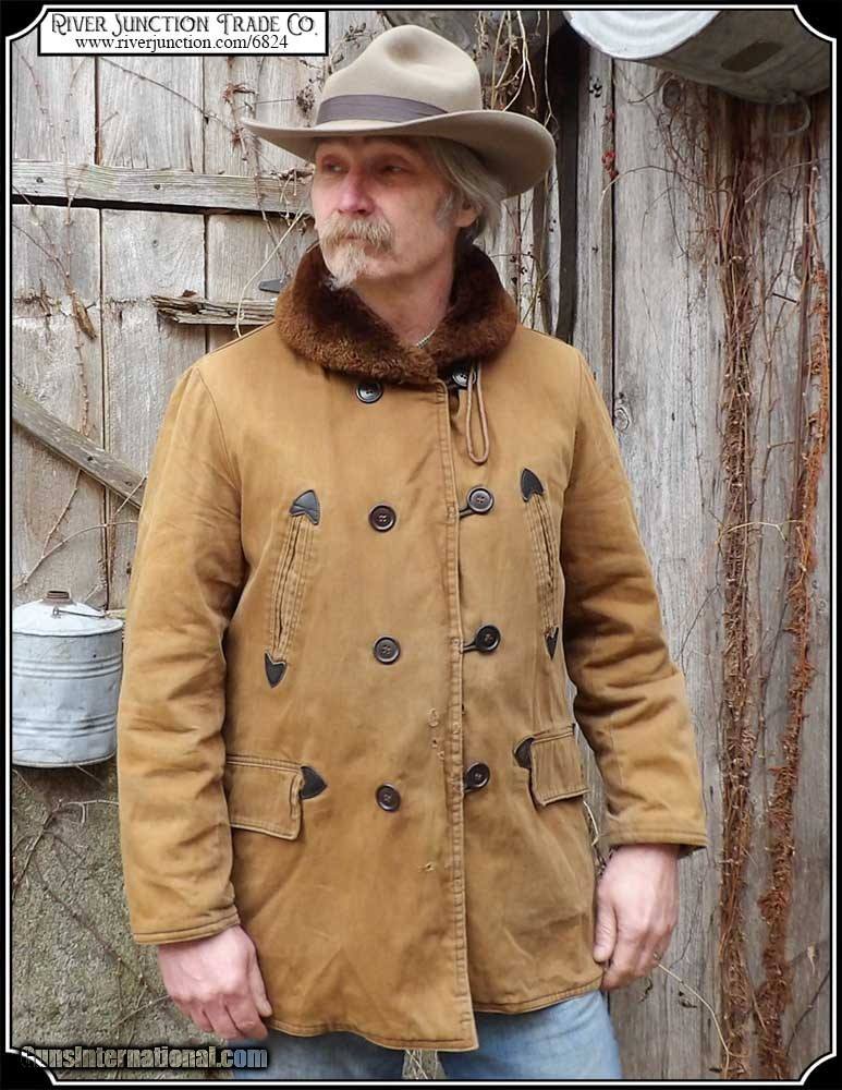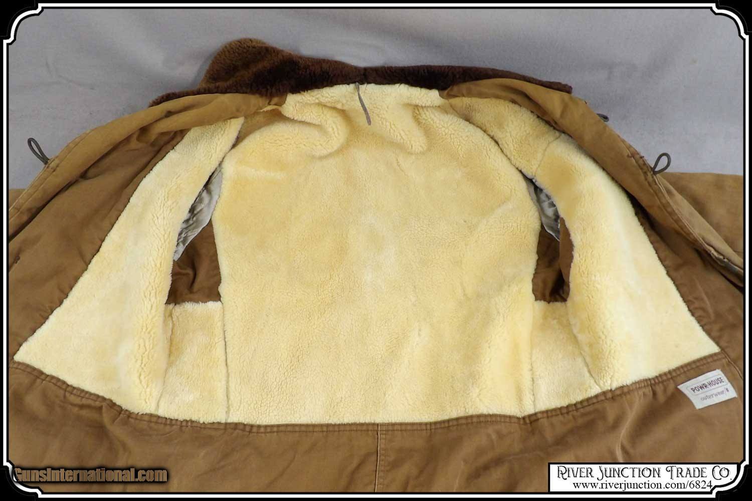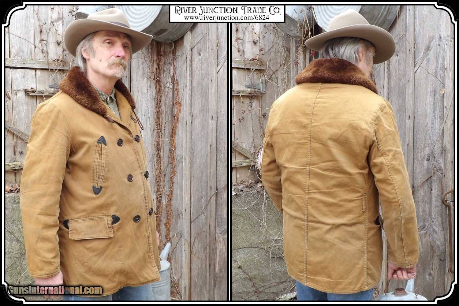 Description: Scarce Vintage Montgomery Ward Power House Outerwear shearling lined chore Rancher coat. This coat is reminiscent the style that Jimmy Stewart wore in the movie "The Far Country" from 1954. This coat is fully lined, the body is lined with a nice cream colored Shearling, the Collar is a dark Shearling, and the sleeves are lined with a quilted satin. The Shearling is in pristine condition with no rips, tears or other damages Four generous pockets adorn the outside of the coat, each one is re-enforced at the corners with leather. This coat is a 44, and measures about 34 inches from collar to bottom. The sleeves are 34 inches. Please note some small wear spots on the front were the gun belt had been fastened, and sleeves. See Pictures Overall good wearable condition Payment: Antiques can be shipped DIRECTLY to you. You can order online. WE DO NOT CHARGE ANY CREDIT CARD FEE. Order with a credit card or pay-pal on our site. Just click on the blue link above “Visit Our ” and paste the four digit numerals into the search box. Before you checkout you will see shipping cost and total. OR If you prefer: Pay by cash, postal money order, cashiers check, personal & business checks. We wait for checks to clear. We always answer questions and entertain offers. Have questions? Call me 563-880-4588. Jim SOLD |