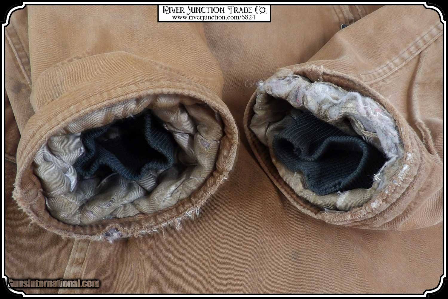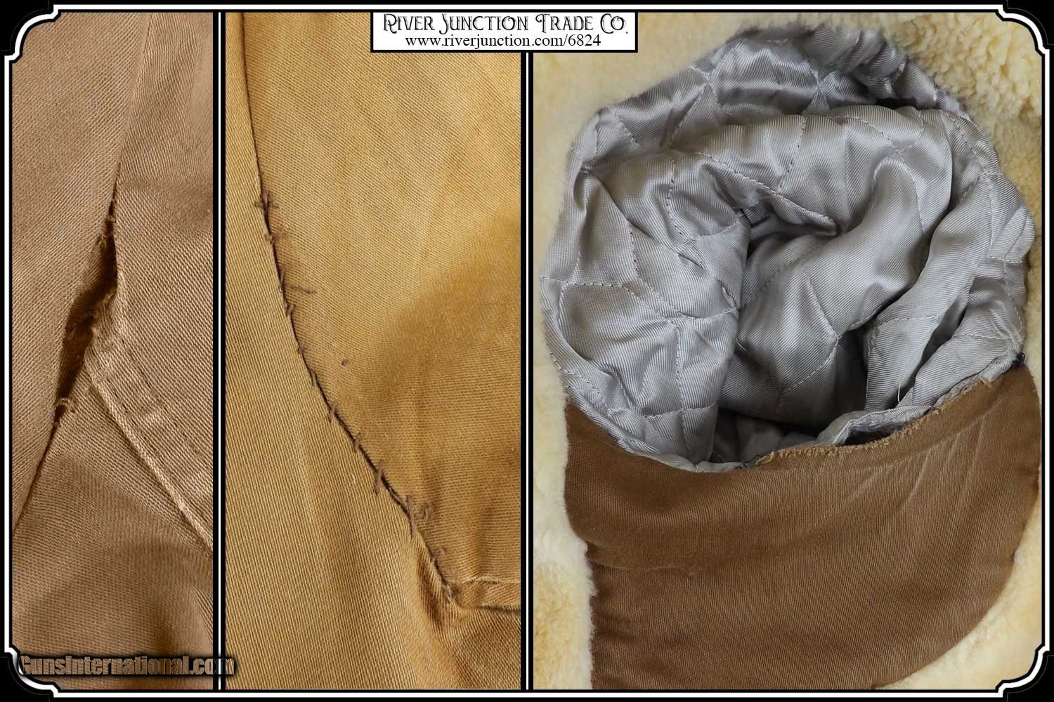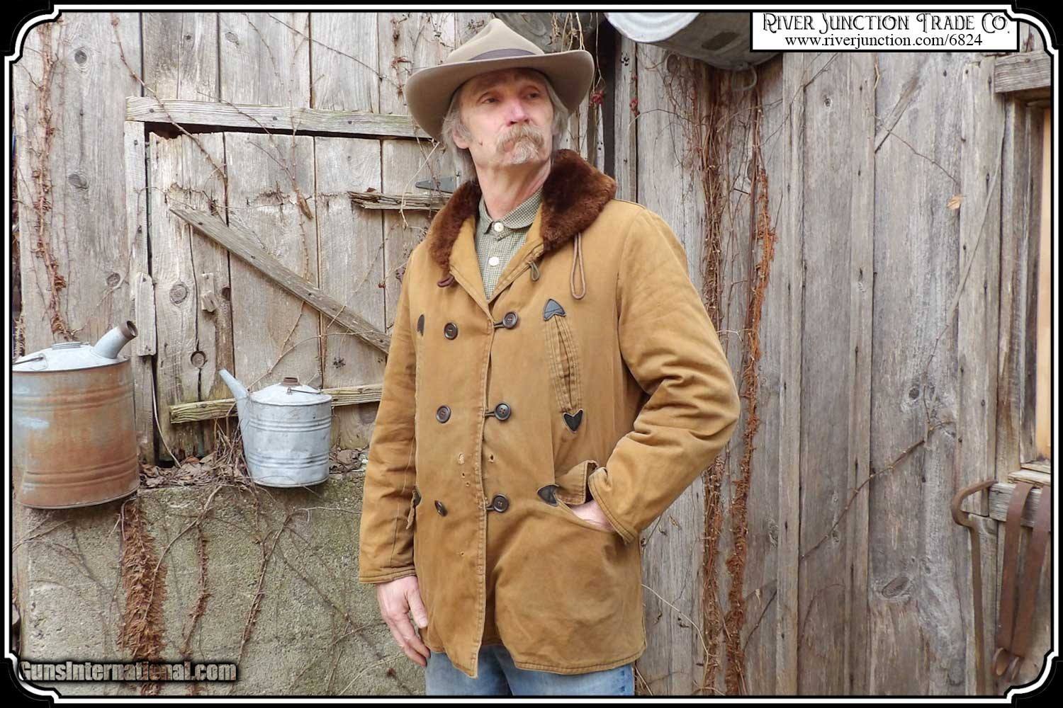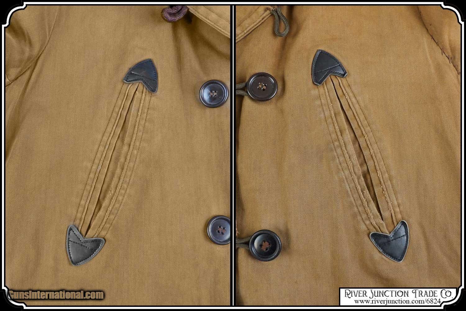 Description: Scarce Vintage Montgomery Ward Power House Outerwear shearling lined chore Rancher coat. This coat is reminiscent the style that Jimmy Stewart wore in the movie "The Far Country" from 1954. This coat is fully lined, the body is lined with a nice cream colored Shearling, the Collar is a dark Shearling, and the sleeves are lined with a quilted satin. The Shearling is in pristine condition with no rips, tears or other damages Four generous pockets adorn the outside of the coat, each one is re-enforced at the corners with leather. This coat is a 44, and measures about 34 inches from collar to bottom. The sleeves are 34 inches. Please note some small wear spots on the front were the gun belt had been fastened, and sleeves. See Pictures Overall good wearable condition Payment: Antiques can be shipped DIRECTLY to you. You can order online. WE DO NOT CHARGE ANY CREDIT CARD FEE. Order with a credit card or pay-pal on our site. Just click on the blue link above “Visit Our ” and paste the four digit numerals into the search box. Before you checkout you will see shipping cost and total. OR If you prefer: Pay by cash, postal money order, cashiers check, personal & business checks. We wait for checks to clear. We always answer questions and entertain offers. Have questions? Call me 563-880-4588. Jim SOLD |