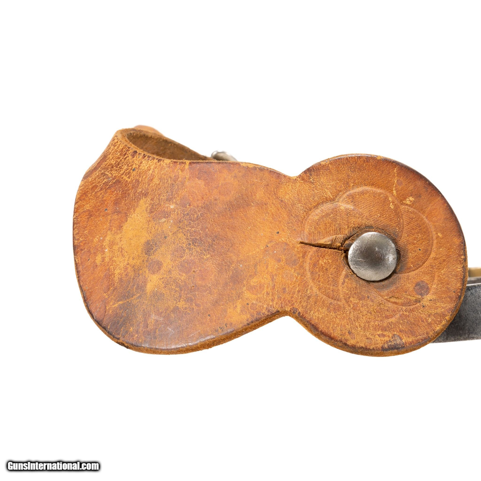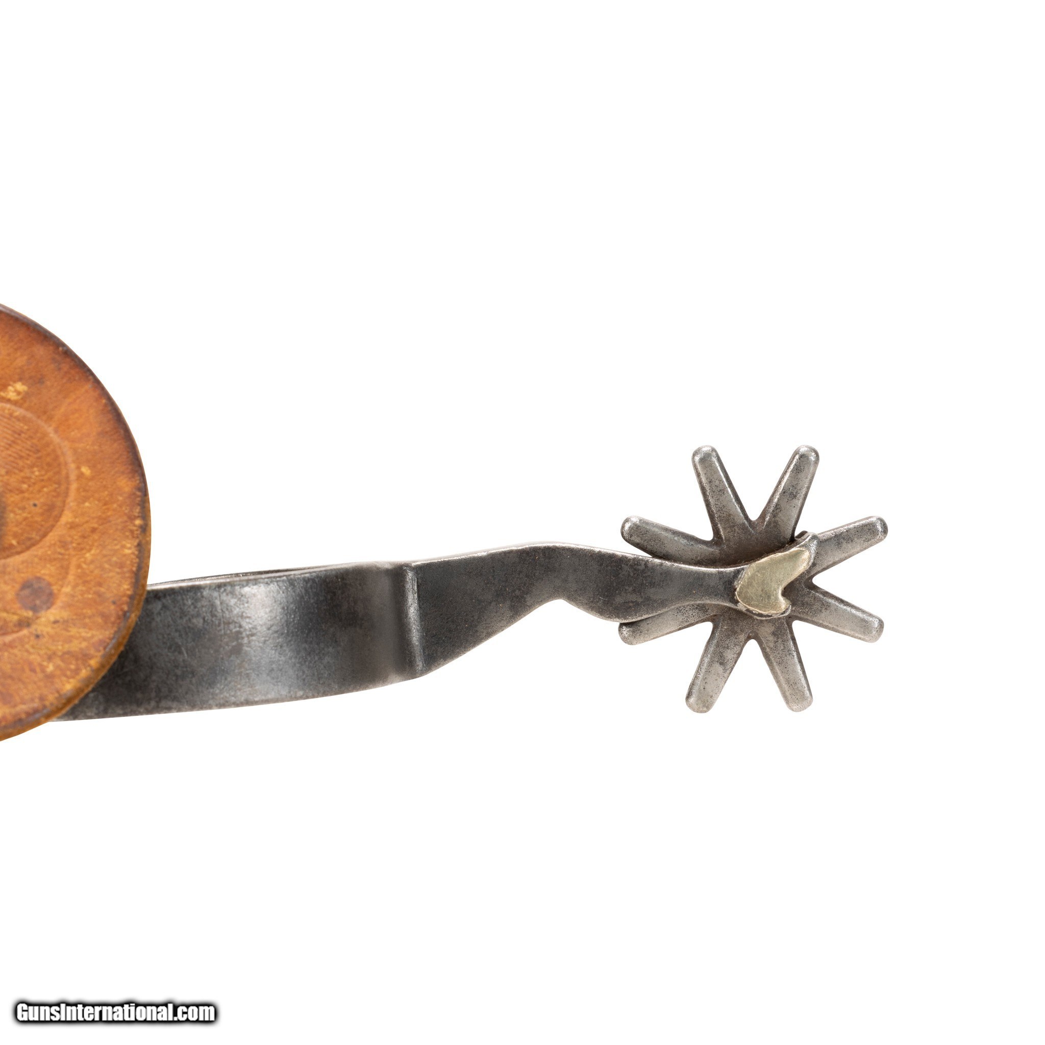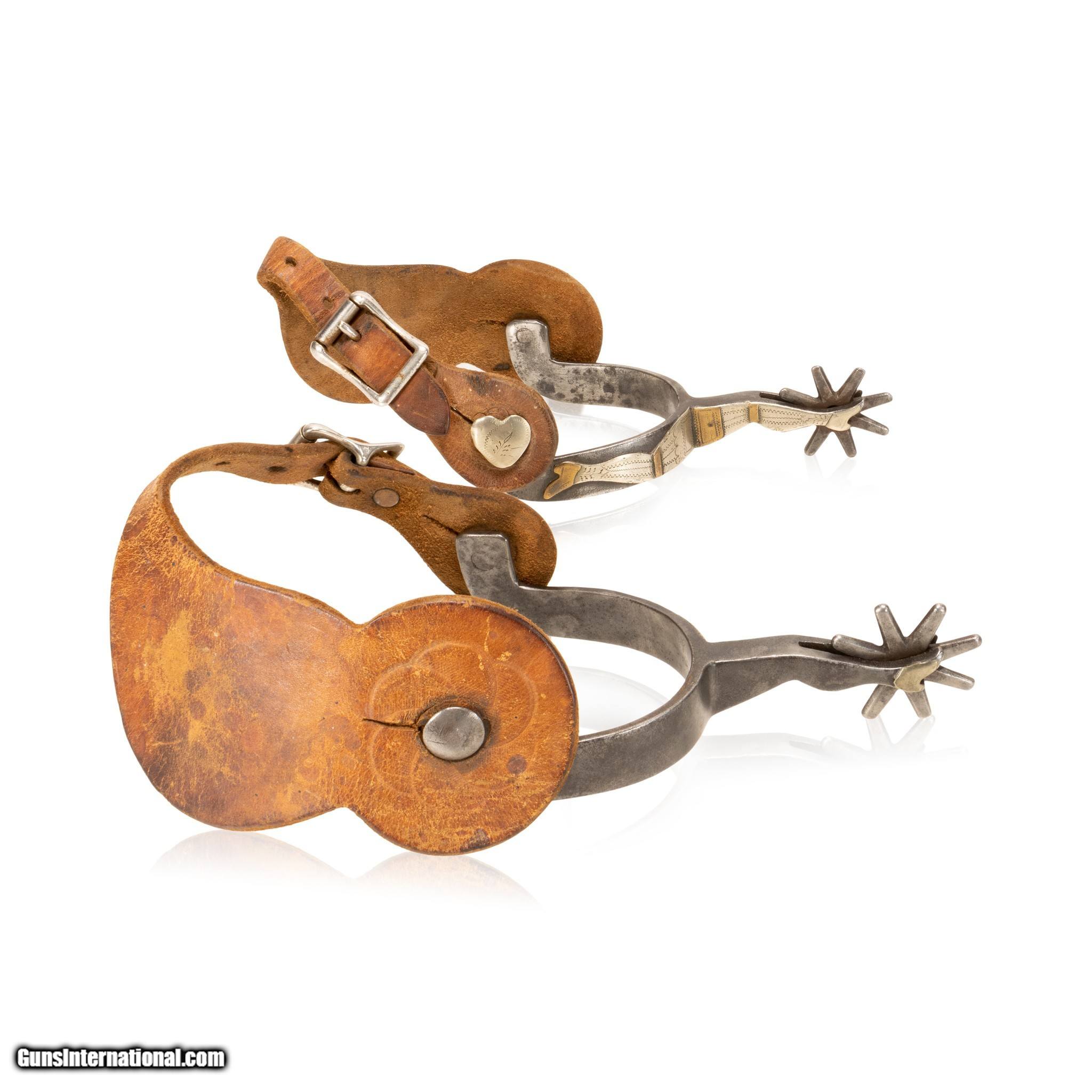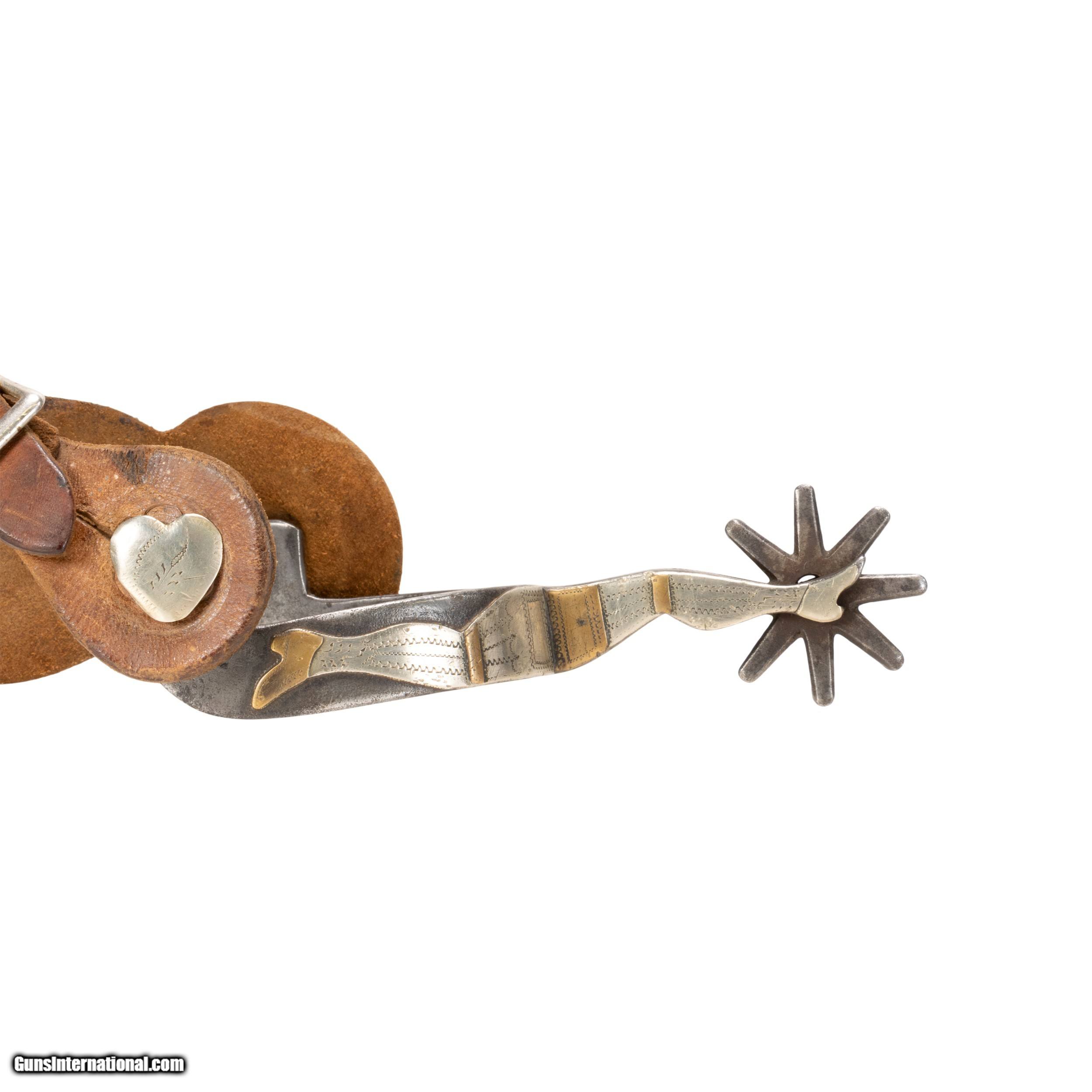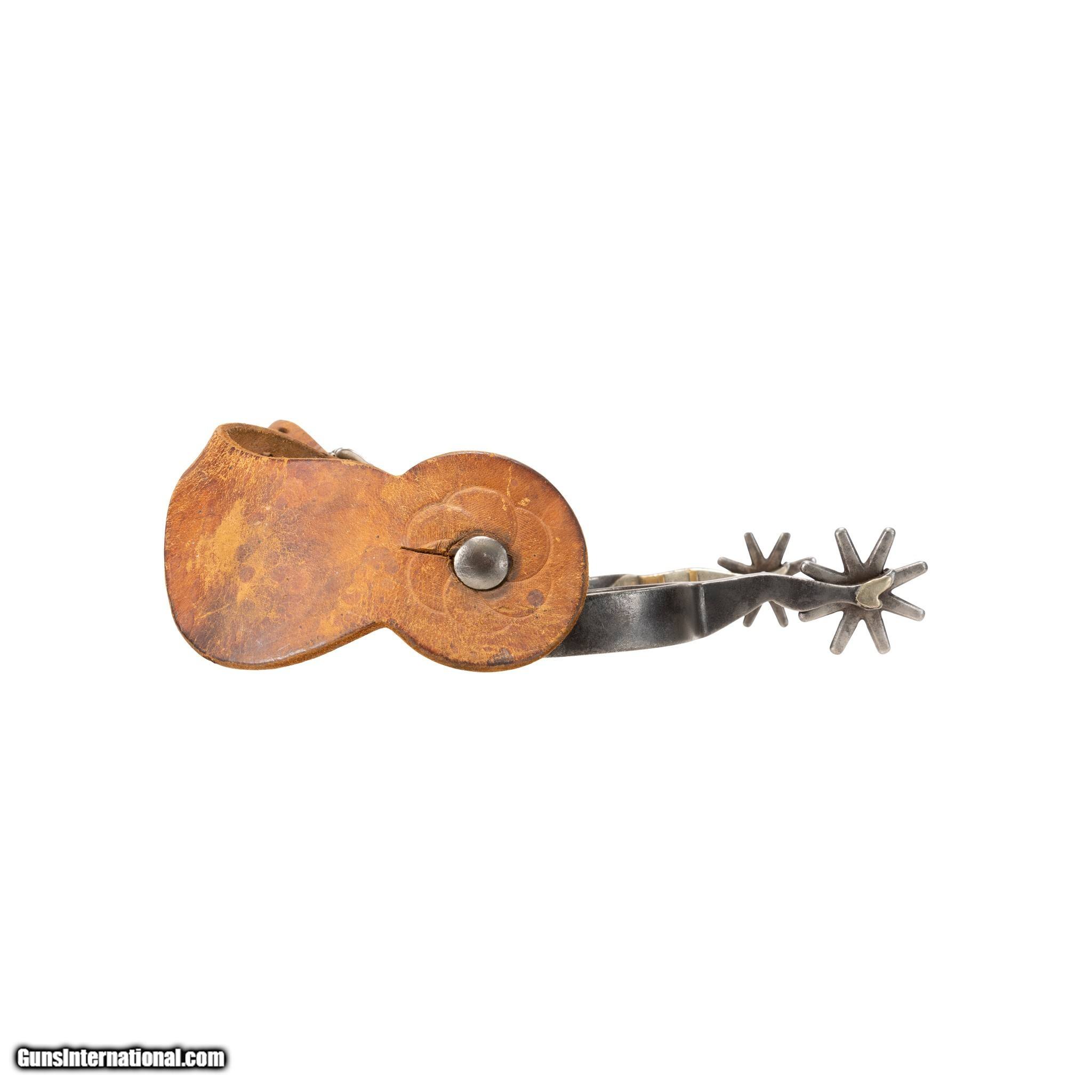 Description: One of the rarest pairs of spurs to find. Spelled out "Kelly Bros & Parker" double gal legs. Pattern no. 34. Single mounted with attractive mix of brass and silver and heart buttons. Featuring "open" silve rlegs with copper and brass accents. Old leathers. Would make a great addition to a Western collection or Southwestern home decor. Also good for continued use with a Western cowboy or equestrian style. Size: 3" inside, 6 1/2"L. Rowels 3/4" Family Owned & Operated Cisco’s Gallery deals in the rare, exceptional, and one-of-a-kind pieces that define the history of America and the Old West. Our pieces range from American Indian to Cowboy Western and include original items of everyday life, commerce, art, and warfare that tamed America’s frontier. Our 14,000 square foot gallery opened in 1996 in beautiful Coeur d’Alene, Idaho. Personal Service Cisco’s operates on old fashioned values – honesty and integrity, and all of our items are backed by our money back guarantee. We appreciate the opportunity to earn your business. Whether you desire assistance with a jewelry purchase, choosing a gift, identification, or even selling – we hope to be your trusted source. SOLD |