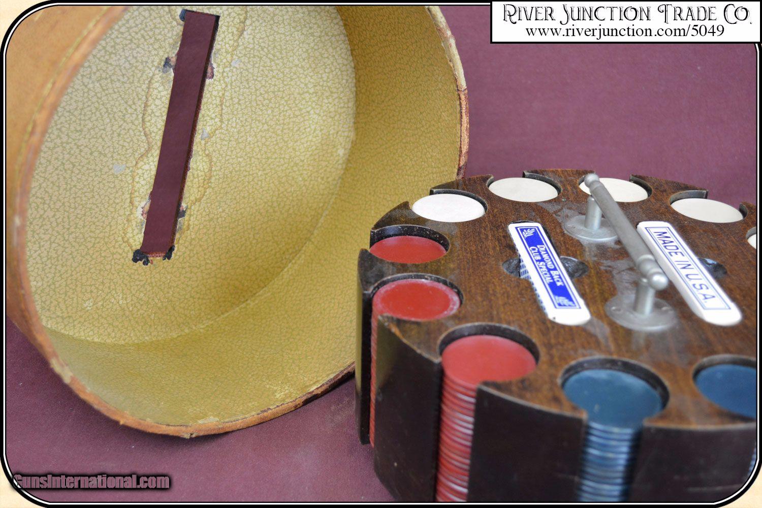 Description: Large Gambling Hall, turn table Poker Chip Rack. The chips are Victorian era clay chips. Housed in a massive solid walnut rack with slots for two decks of cards. The set has a leather covered with an opening for the metal handle to pass through. The round case is 9 1/4 inches in diameter, by about 5 1/2 inches tall including the carry handle. The wood shows no breaks or chips. There are 12 stacks of chips, each with about 25 chips a total of about 300 chips, 75 red, 75 blue, and 150 white. The chips are 1.5 in. in diameter with no markings. They are not chipped or cracked. Fully loaded this set weighs about 10 pounds It is a wonderful large saloon type set. This great set shows a little age but is ready for the big game of 5 Card Stud.. I have included 2 sets of old time cards. See photo for more details. We alway answer questions and entertain offers. Payment Cash, postal money order, cashiers check, personal & business checks. Can be ordered with a credit card or paypal at wxx.riverjunction,cxx just type in the number 5049 in the search box. SOLD |