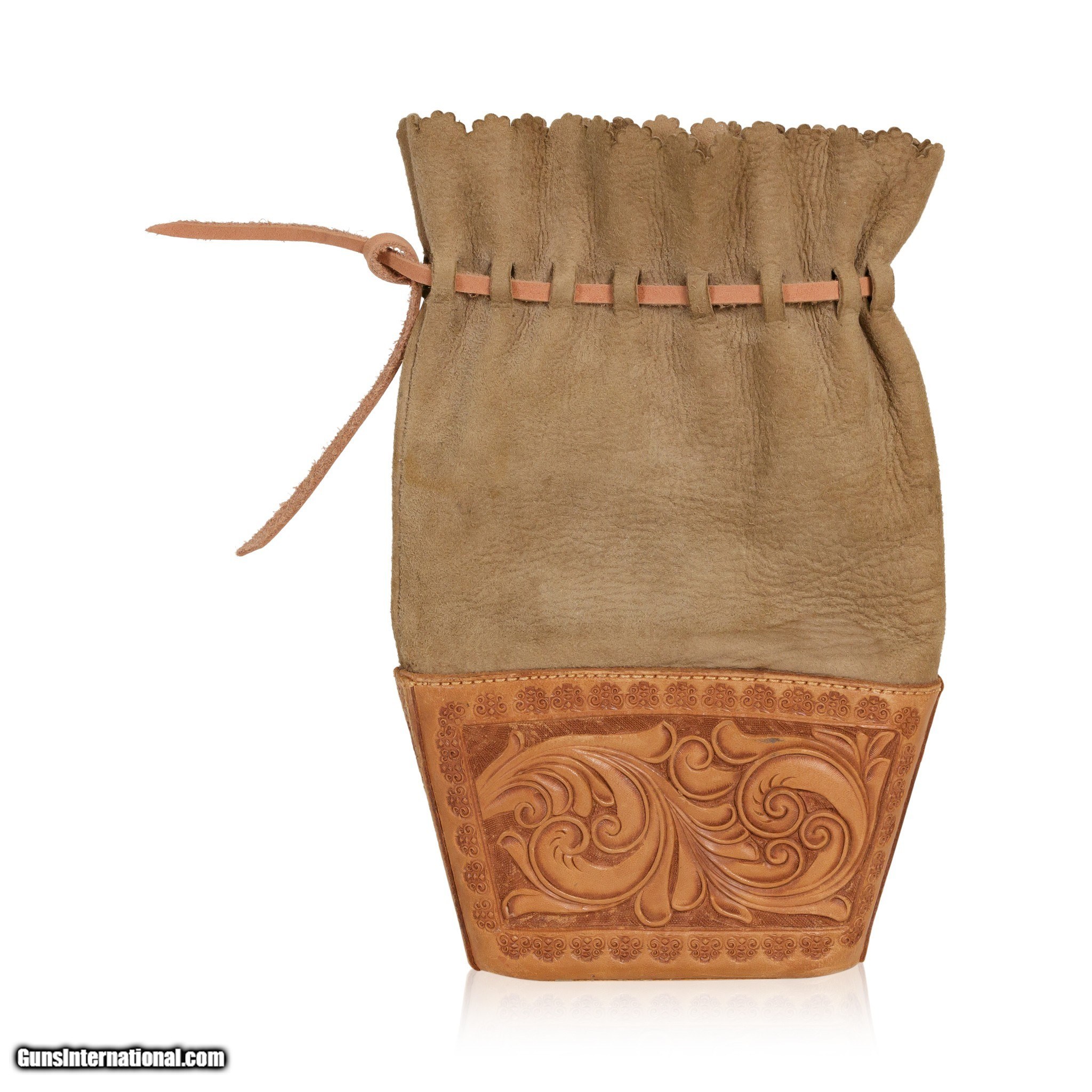 Description: Engraved leather flask pouch to place in luggage or saddle bags. Upper section of pouch is a plain light colored leather and lower section features well done scrollwork. Pouch has leather drawstring top. An unusual vintage piece, something that we haven't seen much of. Would make for a great gift to accompany a flask, or could use as a pouch for a variety of purposes. Made during the early 20th century. Size: 8" x 5" Family Owned & Operated Cisco’s Gallery deals in the rare, exceptional, and one-of-a-kind pieces that define the history of America and the Old West. Our pieces range from American Indian to Cowboy Western and include original items of everyday life, commerce, art, and warfare that tamed America’s frontier. Our 14,000 square foot gallery opened in 1996 in beautiful Coeur d’Alene, Idaho. Personal Service Cisco’s operates on old fashioned values – honesty and integrity, and all of our items are backed by our money back guarantee. We appreciate the opportunity to earn your business. Whether you desire assistance with a jewelry purchase, choosing a gift, identification, or even selling – we hope to be your trusted source. SOLD |
