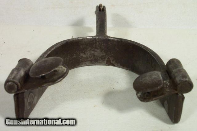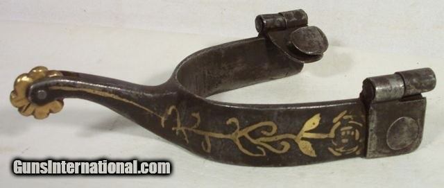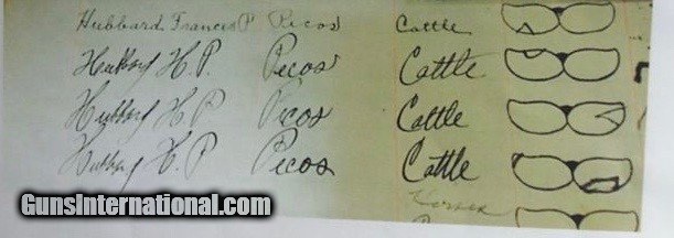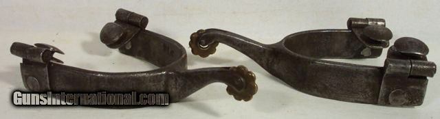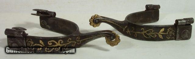 Description: Pair of R.L. Causey Gold Inlaid Spurs; property of H.P. Hubbard of Pecos, Reeves County, Texas with his registered brand; April 13, 1916 in Vol. No. 1 of REEVES COUNTY REGISTERED BRAND text; researched by Homer Mills, rancher out of Alpine, Texas; ‘RLC’ inside heel bond marked; GOLD believe that this pair could have been one of the pairs that Bob Causey took with him to Pico, California, where he visited John Vancleve Causey his brother and a famous Buffalo Hunter; part of newspaper article on pgs. 90-1 of Jane Pattie’s book, COWBOY SPURS AND THEIR MAKERS; these are VERY RARE SPURS! ; from my own personal collection; Price: $8,975 Shipped; Price includes insured shipping; return policy: three days inspection from the date the item is received; full refund of shipping both ways ONLY IF THE ITEM IS MISREPRESENTED; (Scroll to view 14 photos of this item). SOLD |