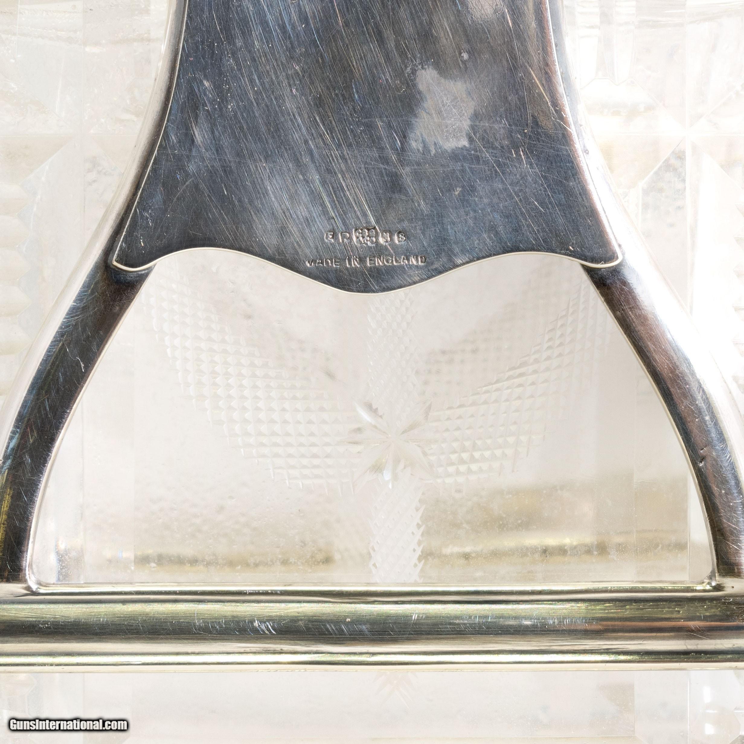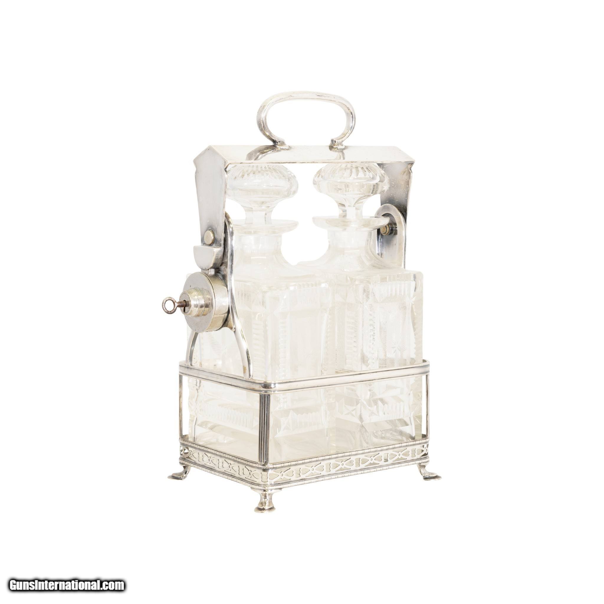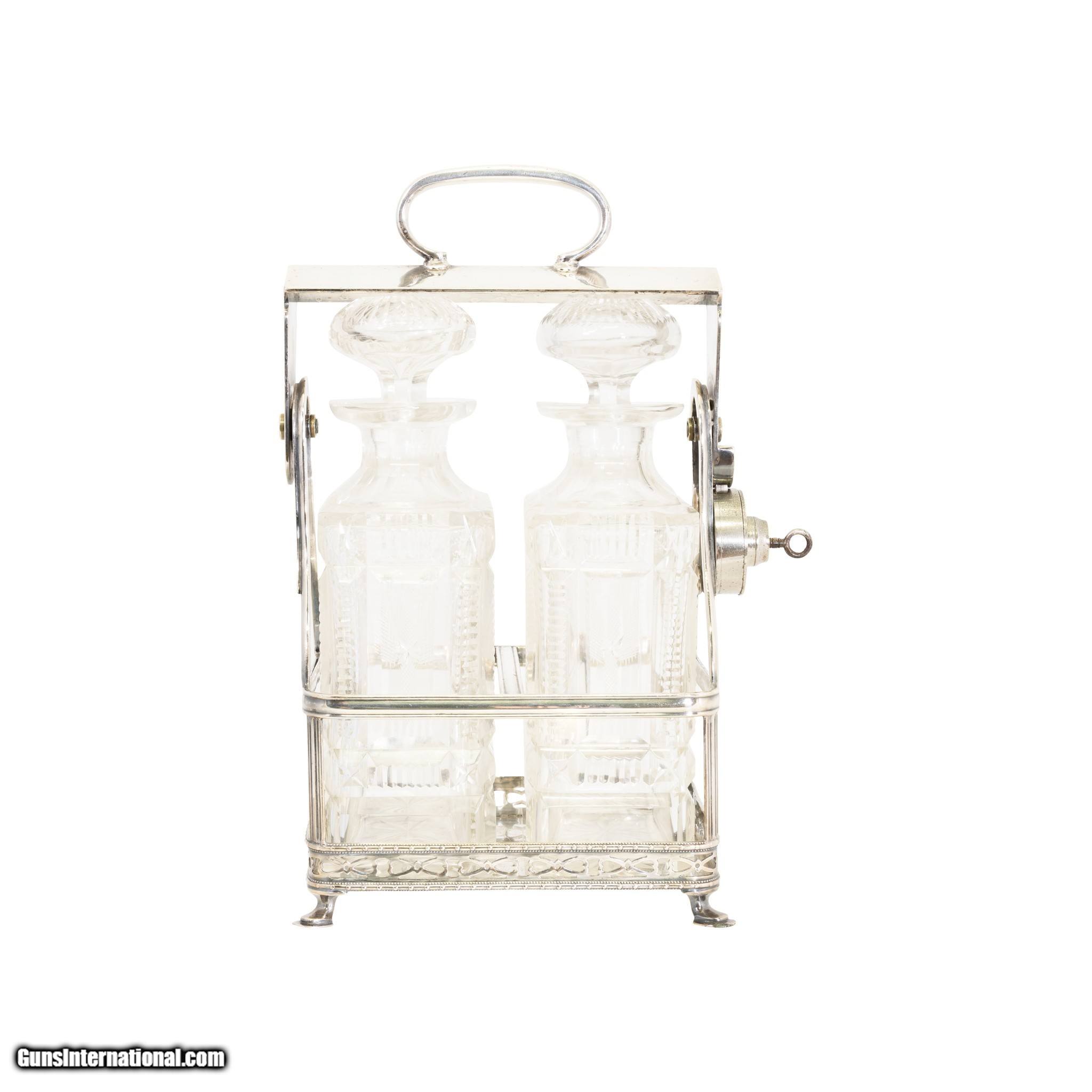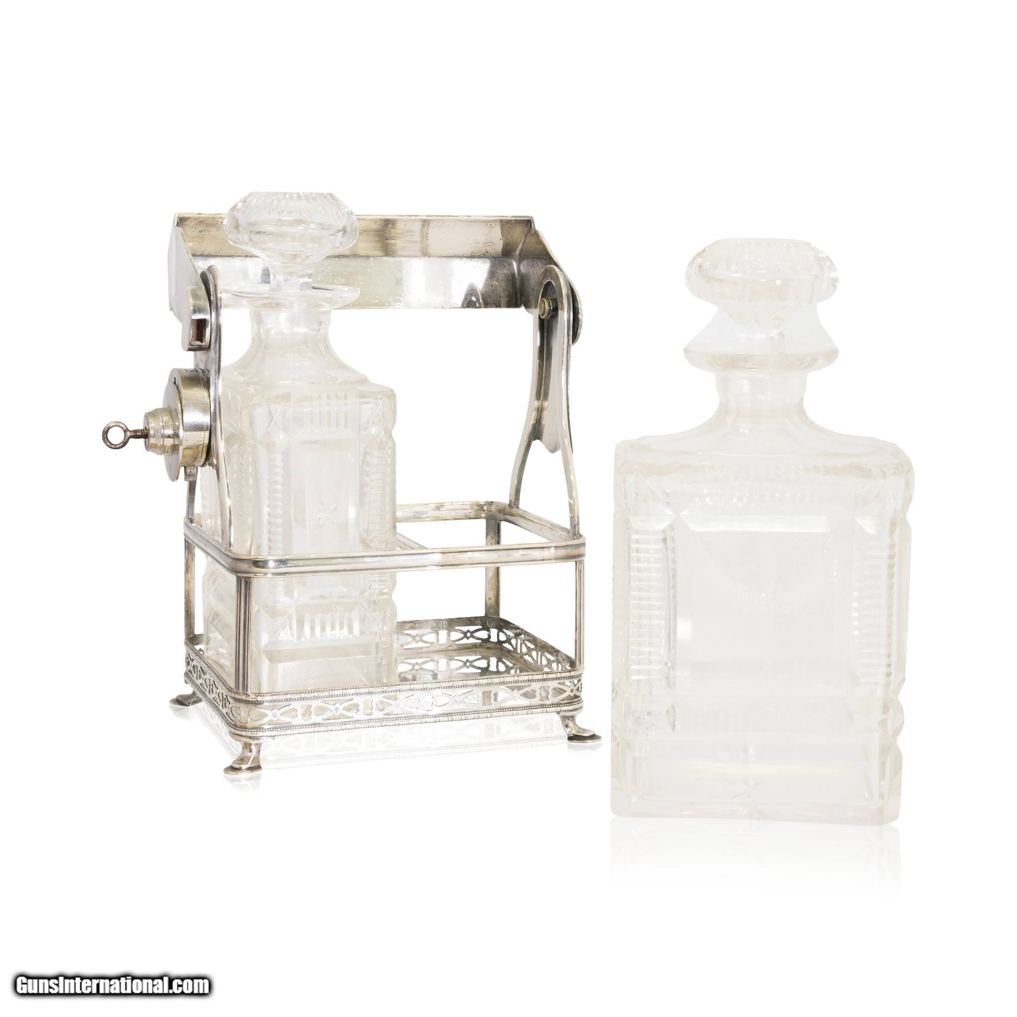 Description: Matched pair of pressed glass liquor carafes in chrome carrier with lock - safe from the butler and maid. From a ranch in Montana. 5" x 7 1/2" x 12"H. SOLD |