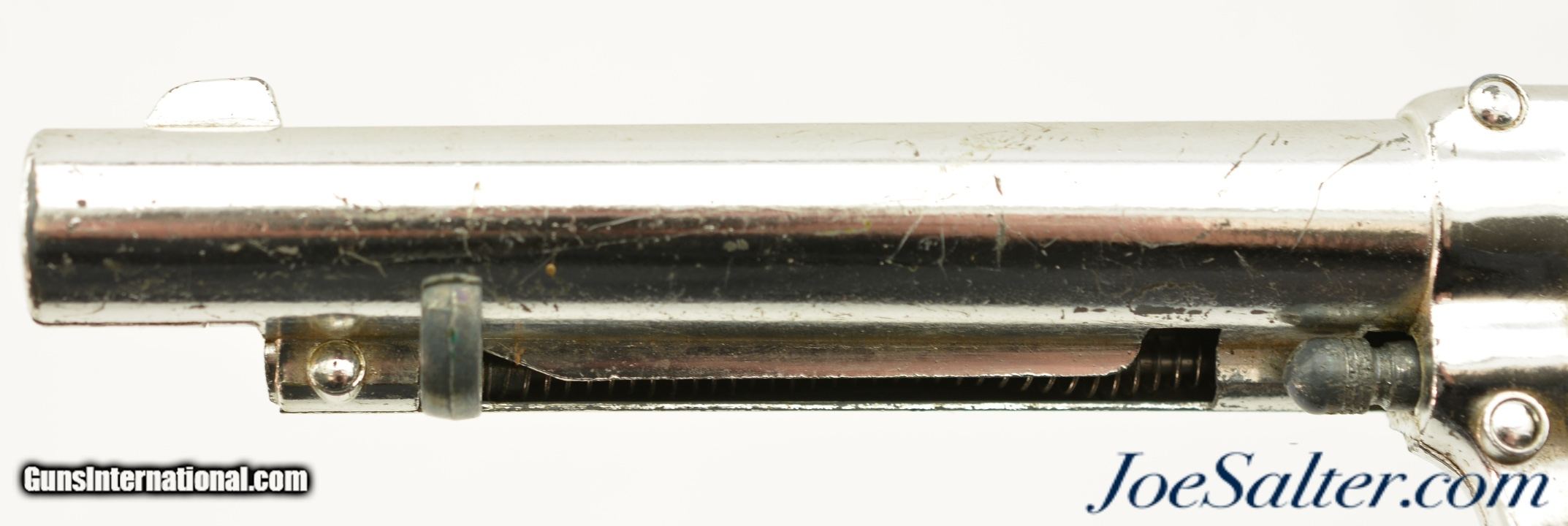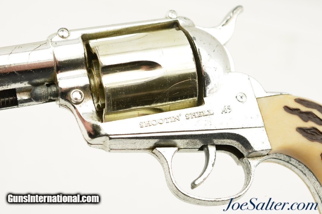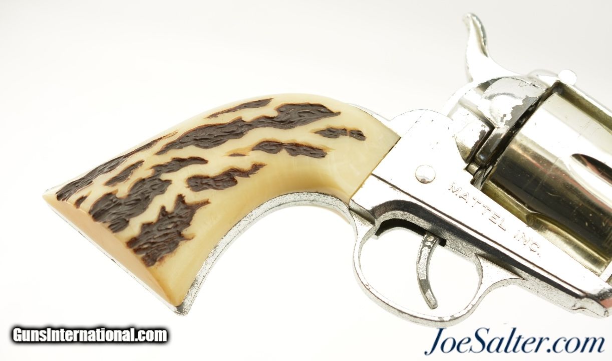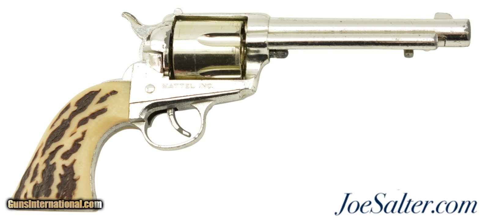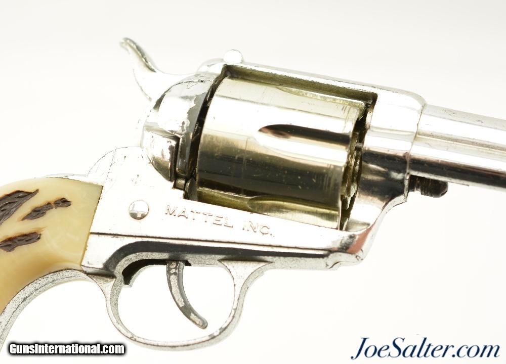 Description: This Mattel Shootin Shell 45 works as a single action or double action which is why it is such a special cap gun. The gun is tight, with a little play in the cylinder. The chrome finish overall is invery good condition. There is some loss of finish on the high points, holster rubs on the tip of the barrel, and some loss of finish on the cylinder. Staghorn grips are in very good condition with no ships or cracks. Extractor is present and working. The toy gun works as it should. For single action you pull the hammer back, the cylinder rotates, the hammer stays back until you fire the gun. For double action just pull the trigger and the cylinder will rotate and the cap gun will fire. It would appear that this cap gun was not fired with caps.; Price: $119.00 Contact Seller |