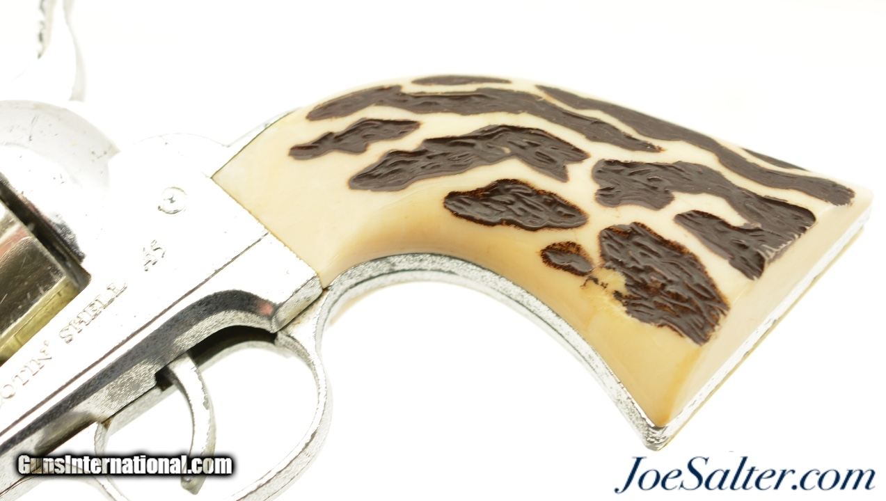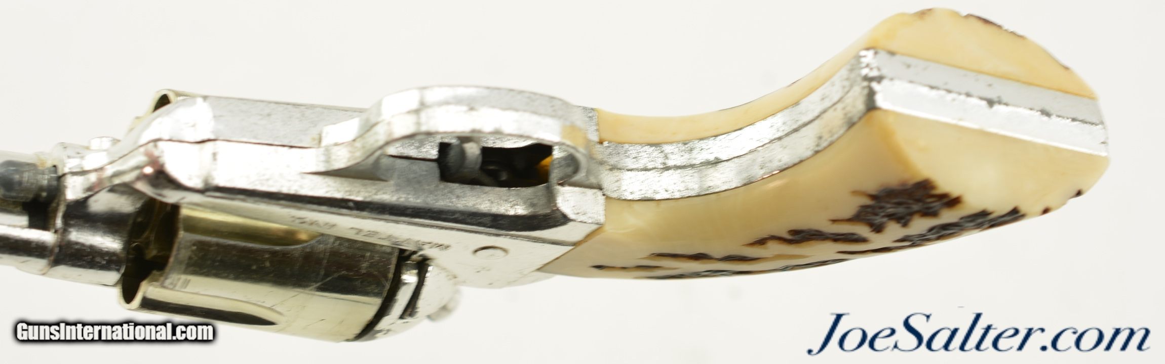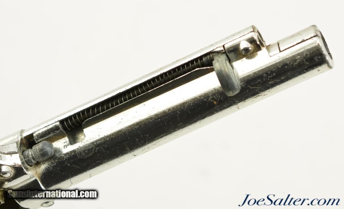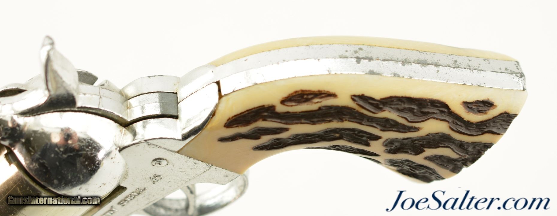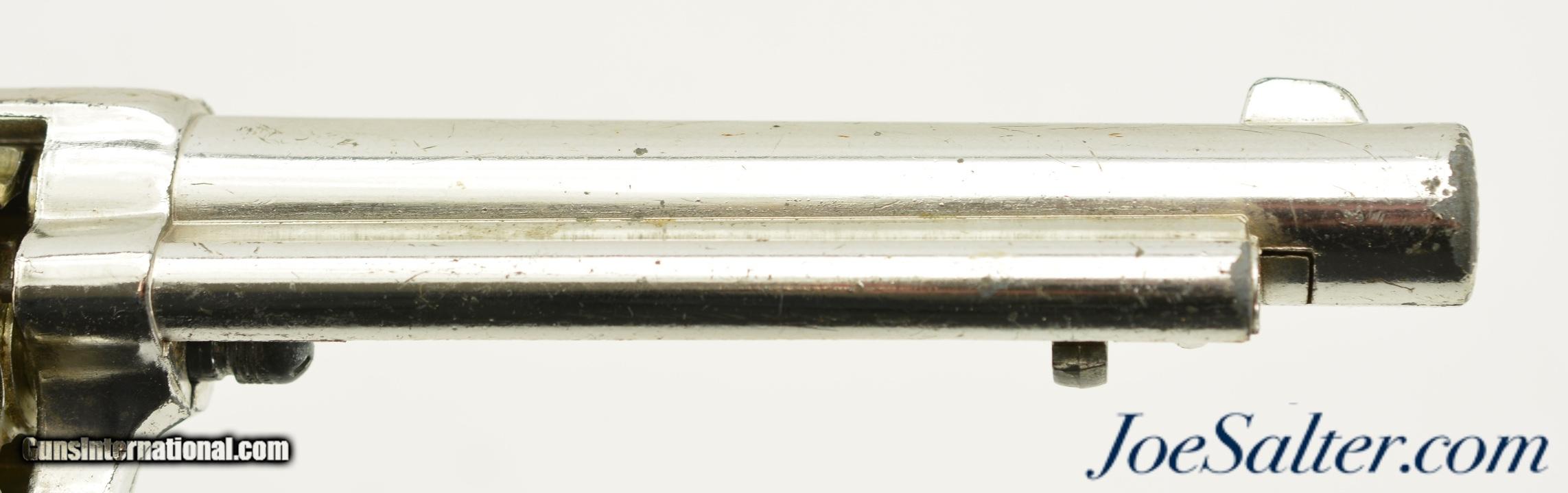 Description: This Mattel Shootin Shell 45 works as a single action or double action which is why it is such a special cap gun. The gun is tight, with a little play in the cylinder. The chrome finish overall is invery good condition. There is some loss of finish on the high points, holster rubs on the tip of the barrel, and some loss of finish on the cylinder. Staghorn grips are in very good condition with no ships or cracks. Extractor is present and working. The toy gun works as it should. For single action you pull the hammer back, the cylinder rotates, the hammer stays back until you fire the gun. For double action just pull the trigger and the cylinder will rotate and the cap gun will fire. It would appear that this cap gun was not fired with caps.; Price: $119.00 Contact Seller |