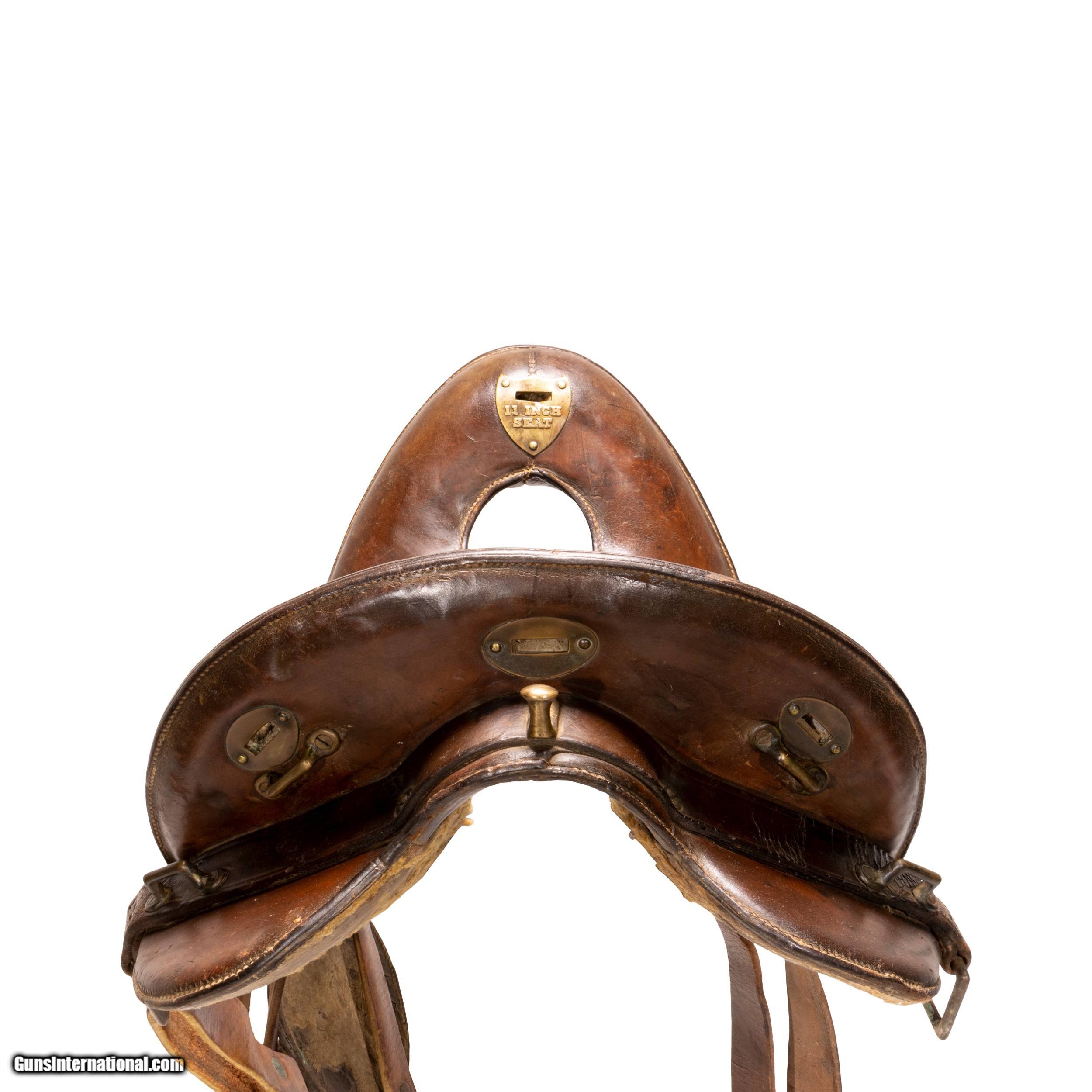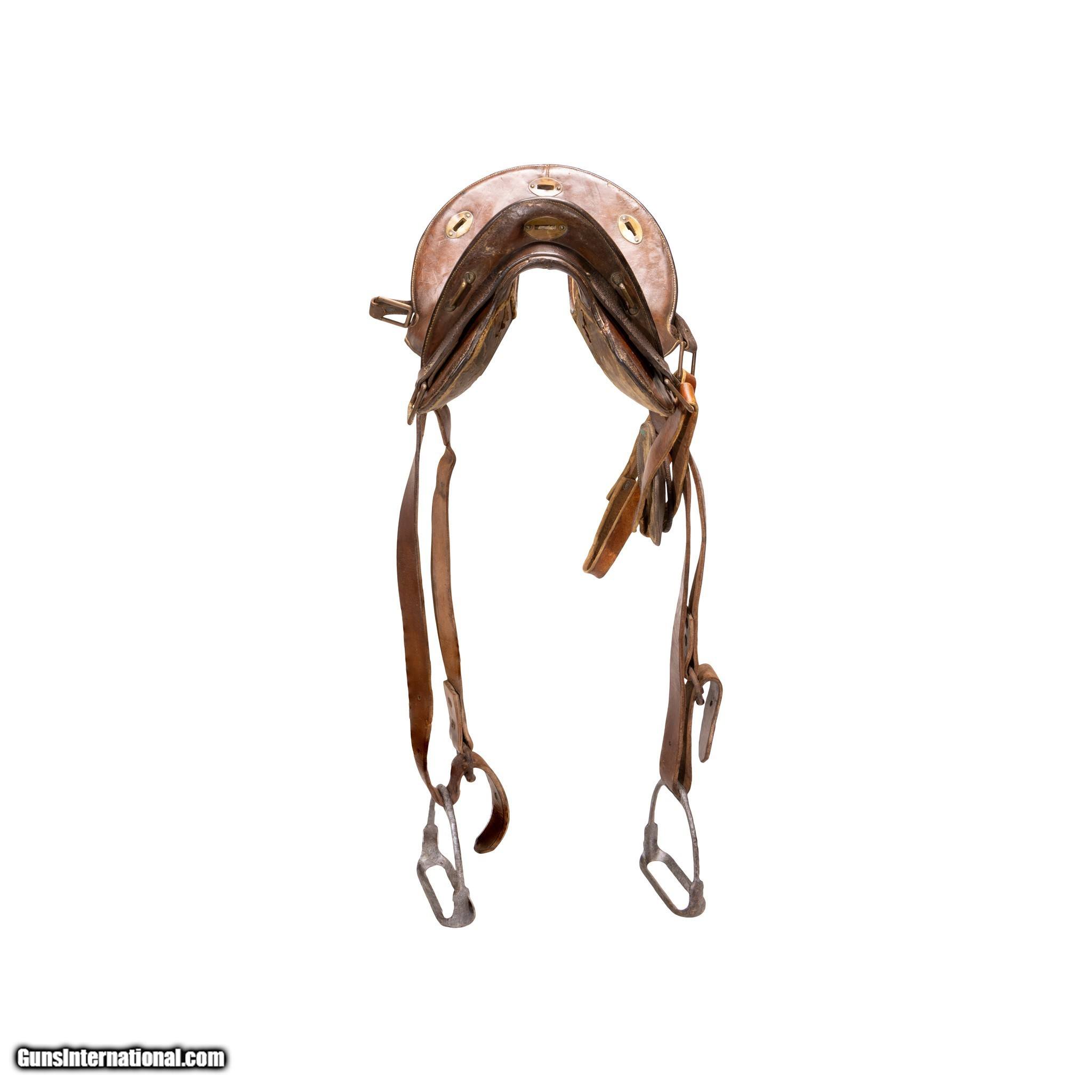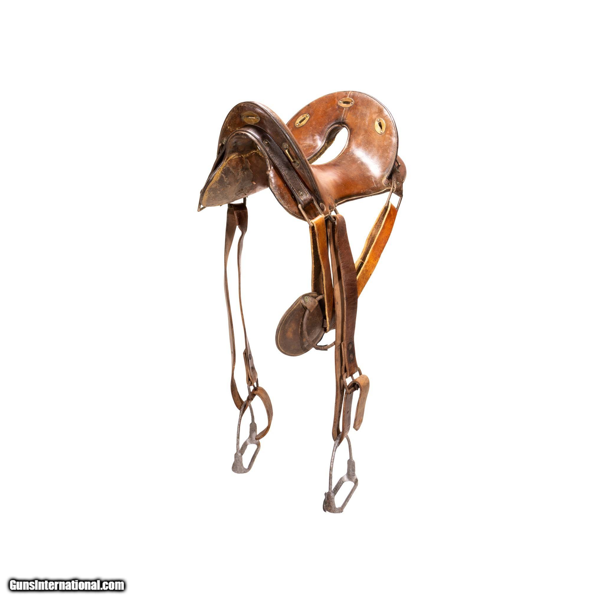 Description: McClellan cavalry saddle with iron stirrups and brass shield. In good condition. Would look great on display in a Western style home, farm, or ranch house. It's warm coloring would lend itself nicely to the decor of a modern home. Size: 11" seat. Family Owned & Operated Cisco’s Gallery deals in the rare, exceptional, and one-of-a-kind pieces that define the history of America and the Old West. Our pieces range from American Indian to Cowboy Western and include original items of everyday life, commerce, art, and warfare that tamed America’s frontier. Our 14,000 square foot gallery opened in 1996 in beautiful Coeur d’Alene, Idaho. Personal Service Cisco’s operates on old fashioned values – honesty and integrity, and all of our items are backed by our money back guarantee. We appreciate the opportunity to earn your business. Whether you desire assistance with a jewelry purchase, choosing a gift, identification, or even selling – we hope to be your trusted source. SOLD |