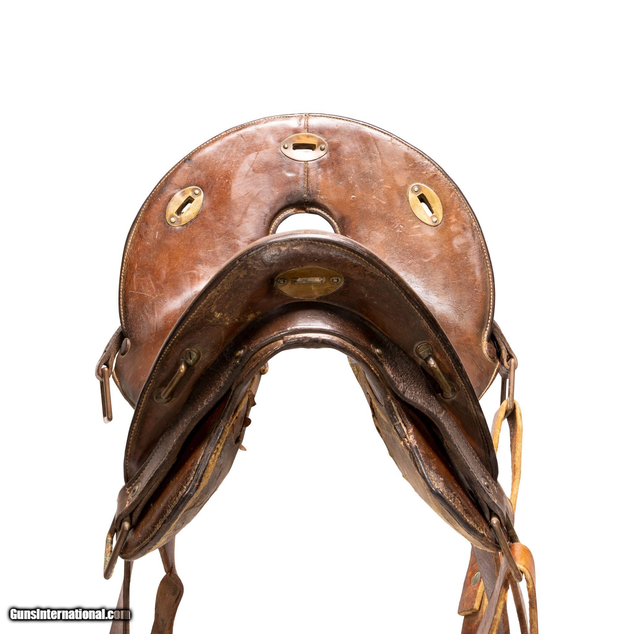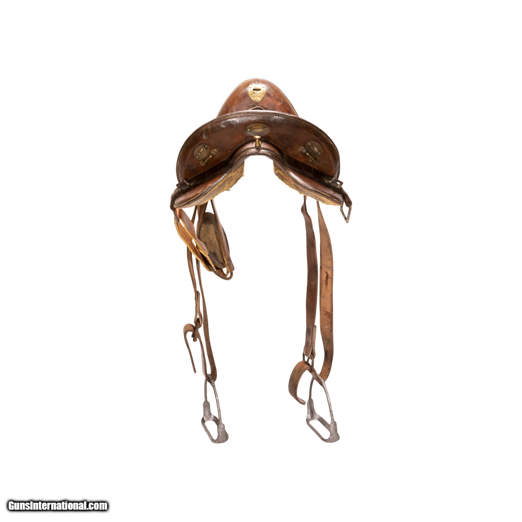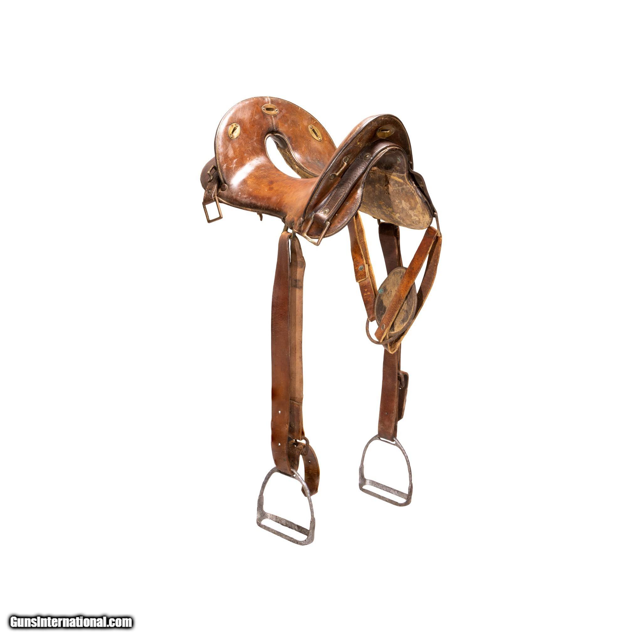 Description: McClellan cavalry saddle with iron stirrups and brass shield. In good condition. Would look great on display in a Western style home, farm, or ranch house. It's warm coloring would lend itself nicely to the decor of a modern home. Size: 11" seat. Family Owned & Operated Cisco’s Gallery deals in the rare, exceptional, and one-of-a-kind pieces that define the history of America and the Old West. Our pieces range from American Indian to Cowboy Western and include original items of everyday life, commerce, art, and warfare that tamed America’s frontier. Our 14,000 square foot gallery opened in 1996 in beautiful Coeur d’Alene, Idaho. Personal Service Cisco’s operates on old fashioned values – honesty and integrity, and all of our items are backed by our money back guarantee. We appreciate the opportunity to earn your business. Whether you desire assistance with a jewelry purchase, choosing a gift, identification, or even selling – we hope to be your trusted source. SOLD |