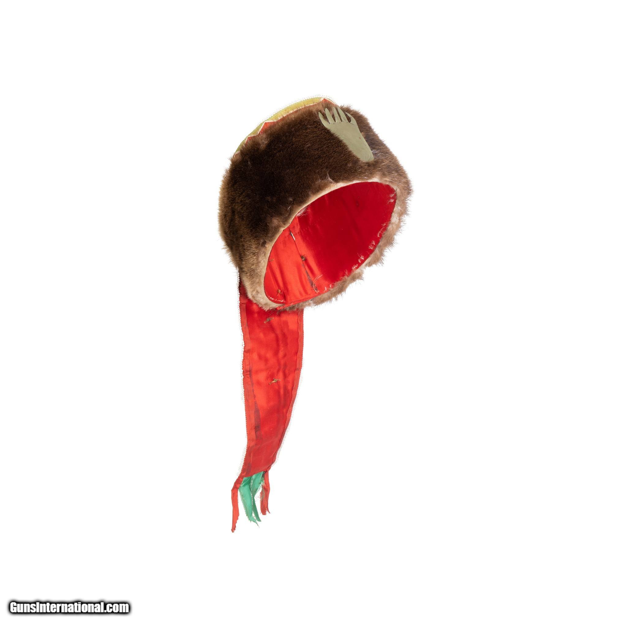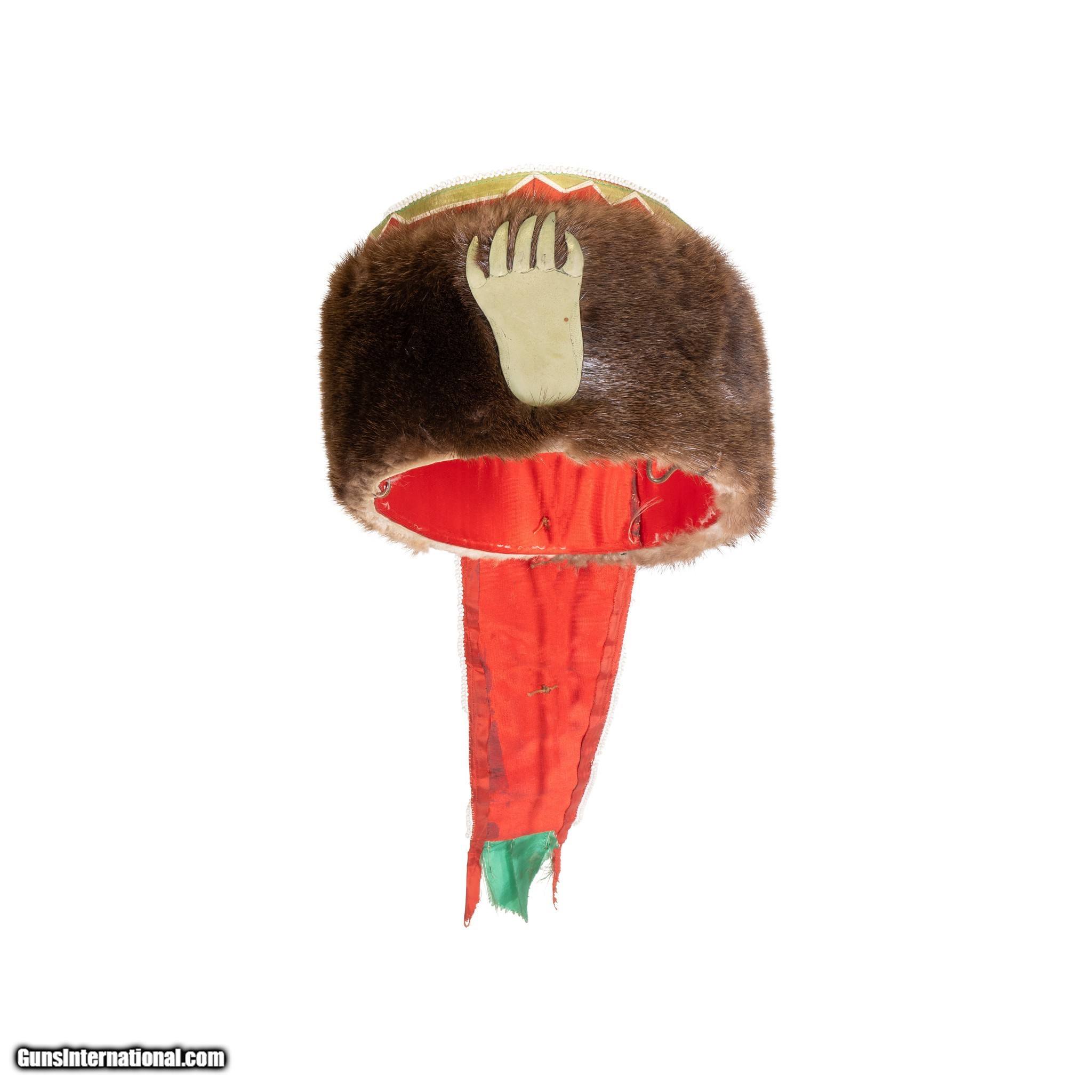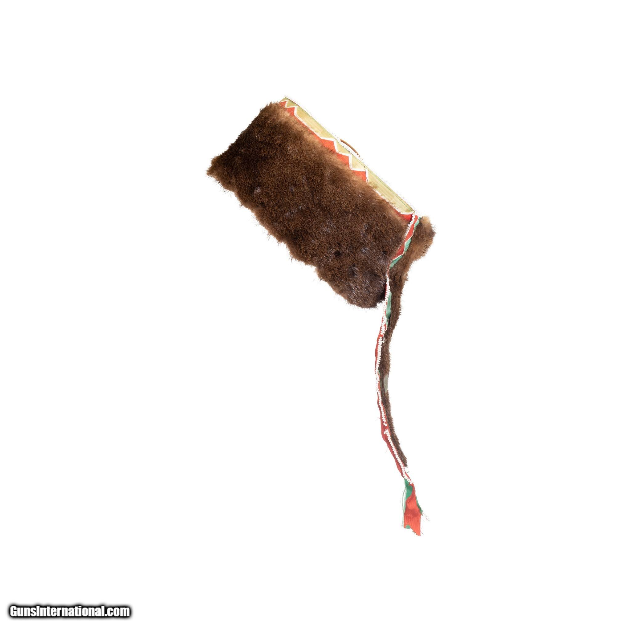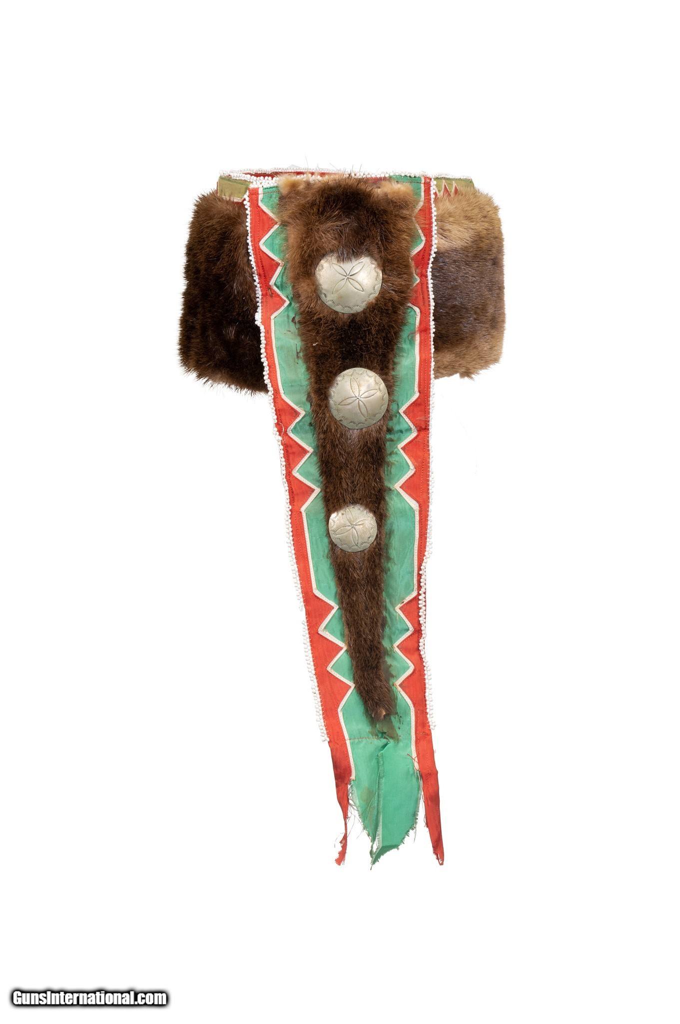 Description: Meskwaki otter skin turban with adornments of German silver, silk ribbons and German silver bear paw on front. Patina and fading from use. 16"L x 8"W x 10"Deep. First quarter 20th Century. SOLD |
