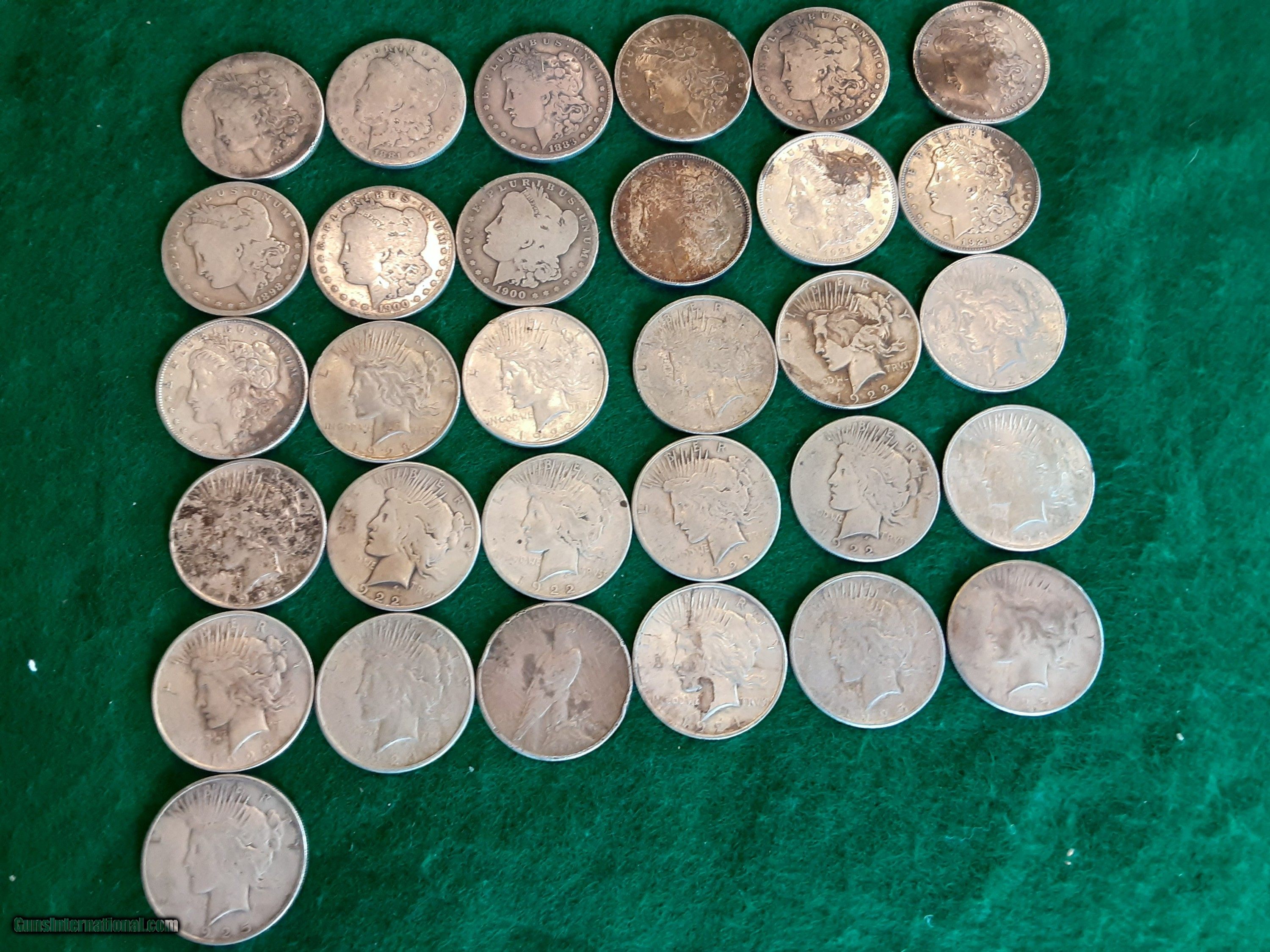 Description: LAYAWAY?....31 TOTAL SILVER DOLLARS! 13 Morgan and 18 Peace dollars.... SEE (photo) of LIST FOR DATES AND MINTMARKS. All the experts are claiming a huge jump in silver prices due to Government shortages and demand for use in electric car batteries and solar energy panels! I also have 4 $20 gold coins slabbed/graded by NGC and PCGS, in my listings. Shippimg $12. See my other lkistings! Thanks...Greg cp SOLD |