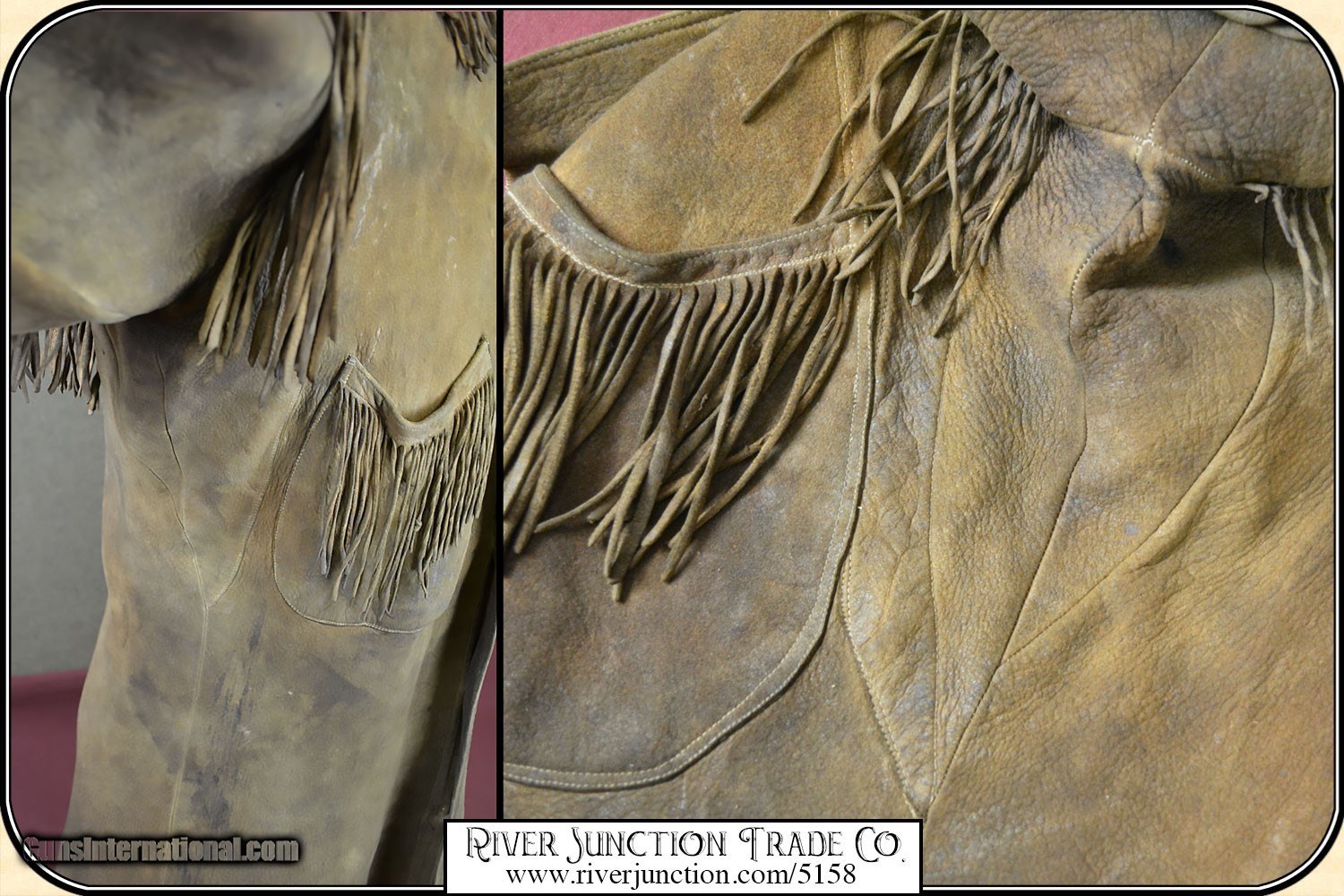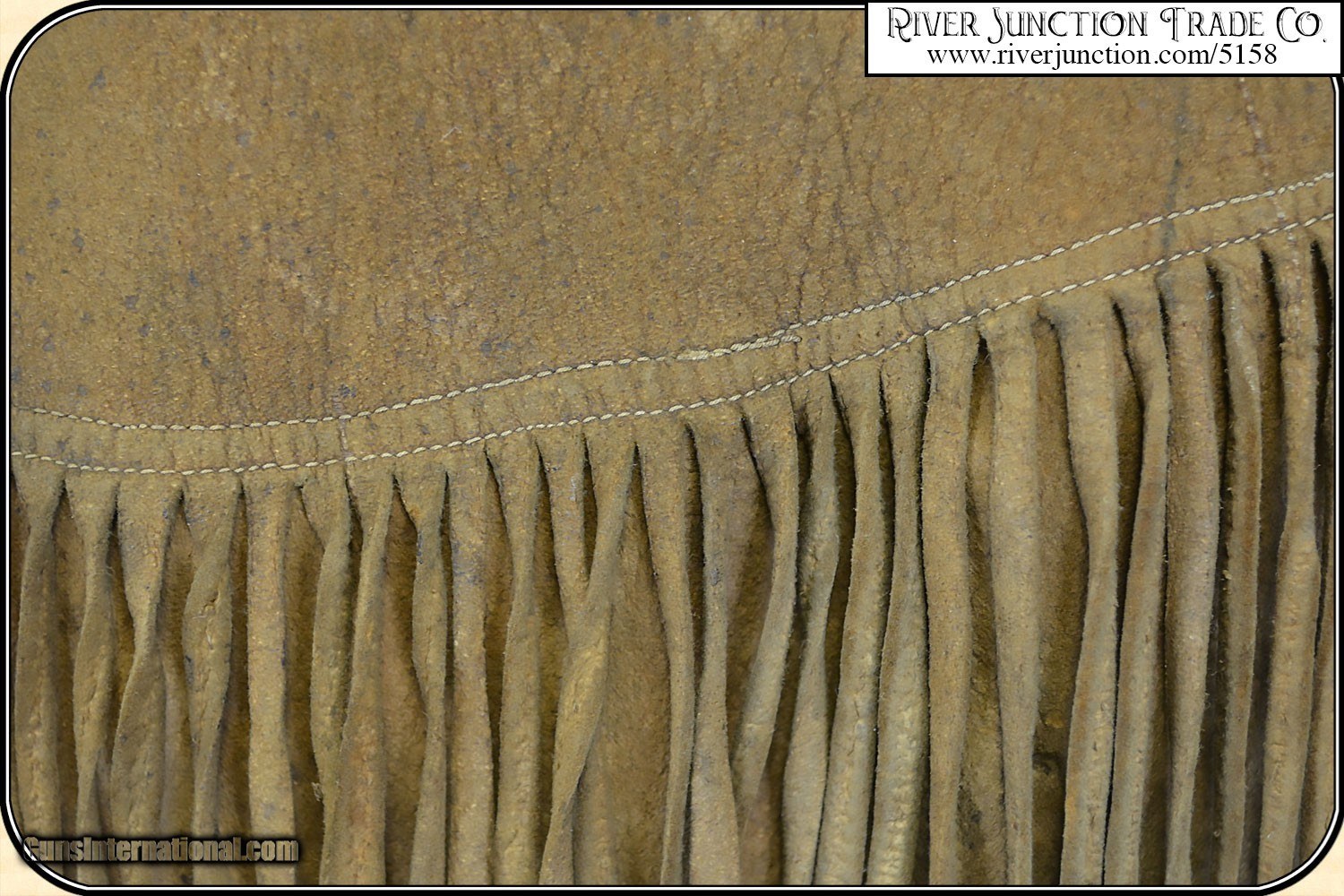 Description: This is an original, antique, tobacco colored, indian tanned buckskin shirt/coat. Beautifully sewn, likely on a hand cranked sewing machine. This shirt was made about 1840 to 1850. It was made of native tanned deer skin. EVERY STITCH IS PERFECTLY SEWN and not a single stitch is missing or loose. Around each button hole is the hand stitching and the stitching is very close together. The remaining buttons are REAL HARD RUBBER, three of the original 6 are missing but could easily be replaced if you like. Long leather fringes are around the shoulders, pockets and bottom, while shorter fringe is around the collar. Their are three pockets, two breast pockets and one inside pocket. The breast pockets are pouch shaped (bigger at the bottom than at the top, with the top cut on a curve, designed to keep thing from falling out. The inside pocket is very deep could carry valuables or perhaps 5 inch barreled 1849 Colt pocket model. Just the thing for a Pony Express rider. The only damage I see is that the collar buttonhole has been torn out (repairable) and the hanging loop has been pulled loose (see photo). This garment has many unique feature, we have tried to show in the photos. The cuff styling is a feature that denotes the age of this garment. This shirt/coat is a 38 inch chest measurement and would fit the average Civil War Soldier of the time. This is of museum quality and certainly tells a story of the American West. Shirts of this style were often made by Indian women for Cavalry Officers during our westward expansion and can be seen in old photos of early cowboys . The accompanying props are not included. Rare to find as these were often used up. Great for a museum, cowboy room antique gun display. From the real west. We always answer questions and entertain offers. Payment Cash, postal money order, cashiers check, personal & business checks. Can be ordered with a credit card or paypal at wxx.riverjunction,cxx just type in the number 5158 in the search box. SOLD |