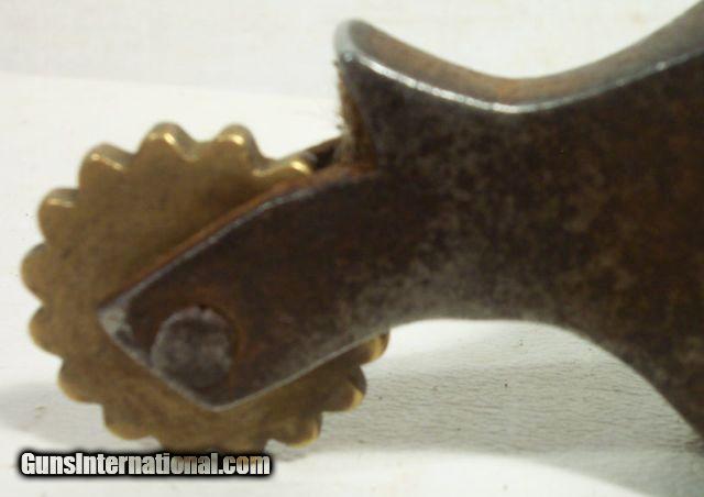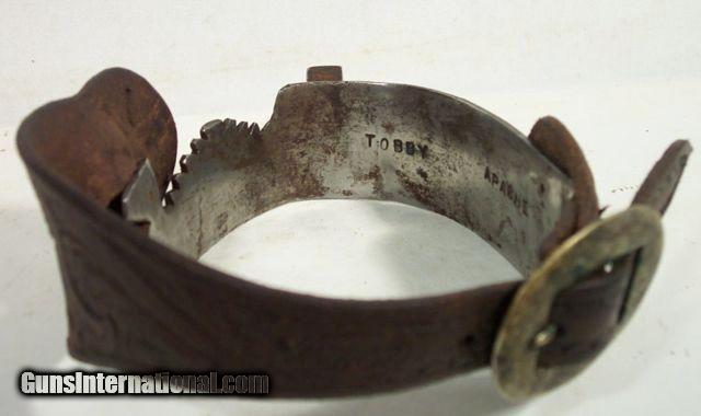Description: Very unusual pair of Spurs made by E. F. Blanchard-Datil, New Mexico; Circa 1930’s; Obviously made for an Apache Indian named Tobby; Marked E.F.B.; Tobby Apache and Apache Tobby; antique; from my own personal collection; All items shipped fully insured--Spurs $30; return policy: three days inspection from the date the item is received; full refund of shipping both ways ONLY IF THE ITEM IS MISREPRESENTED. Note: International sales only as laws permit. SOLD |