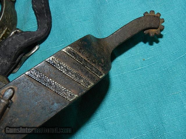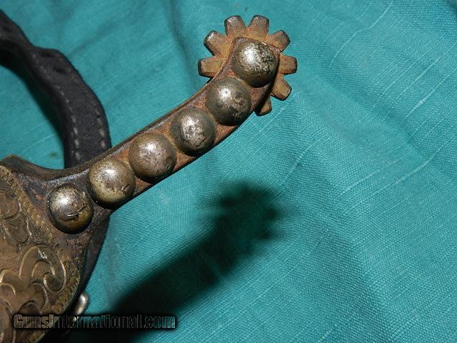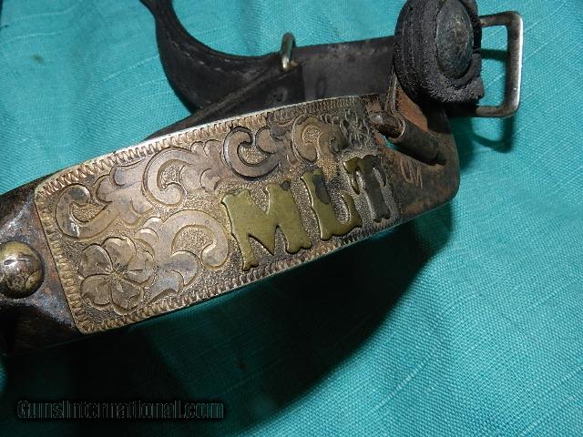 Description: A great pair of old spurs with silver inlays and the laether straps and silver button concho I don't know the age but has Initials MLT, or MTL depending on the style used . which means it could be (example Michael Lawrence Thomas) or Michael Taylor Lawrence). Away a great pair of spurs with age and not touched , They both looked matched and complete! We don’t have asite .I prefer money orders or a check. Item ships when funds come in. If you can only pay with a card let me know. I hope you like my wide selection of unusual guns, knives and gun parts. Shipping price determined by zip code. I try to keep the prices affordable, which means I make less money than most dealers. You won’t get altitude sickness with my prices! I consistently have the best selection of older guns If you BUY IT NOW you must still contact us for details buy it now doesn't end the sale, it just sends an email telling us you want to buy this gun. A phone call won’t secure a sale! Not home many times, the first buyer by email buys the gun !Thissite doesnot close down a sale when you do a BUY IT NOW like Ebay!I can get six buy it nows in an hour, first buyer to email gets the guns, others are in second place! Best to send another email . Sometimes not home to get calls. Some guns are required shipment to a gun dealer near you for a transfer to you when it arrives. With the widest selection of older guns at great prices, We don’t have a store, and sell on the internet only. SOLD |