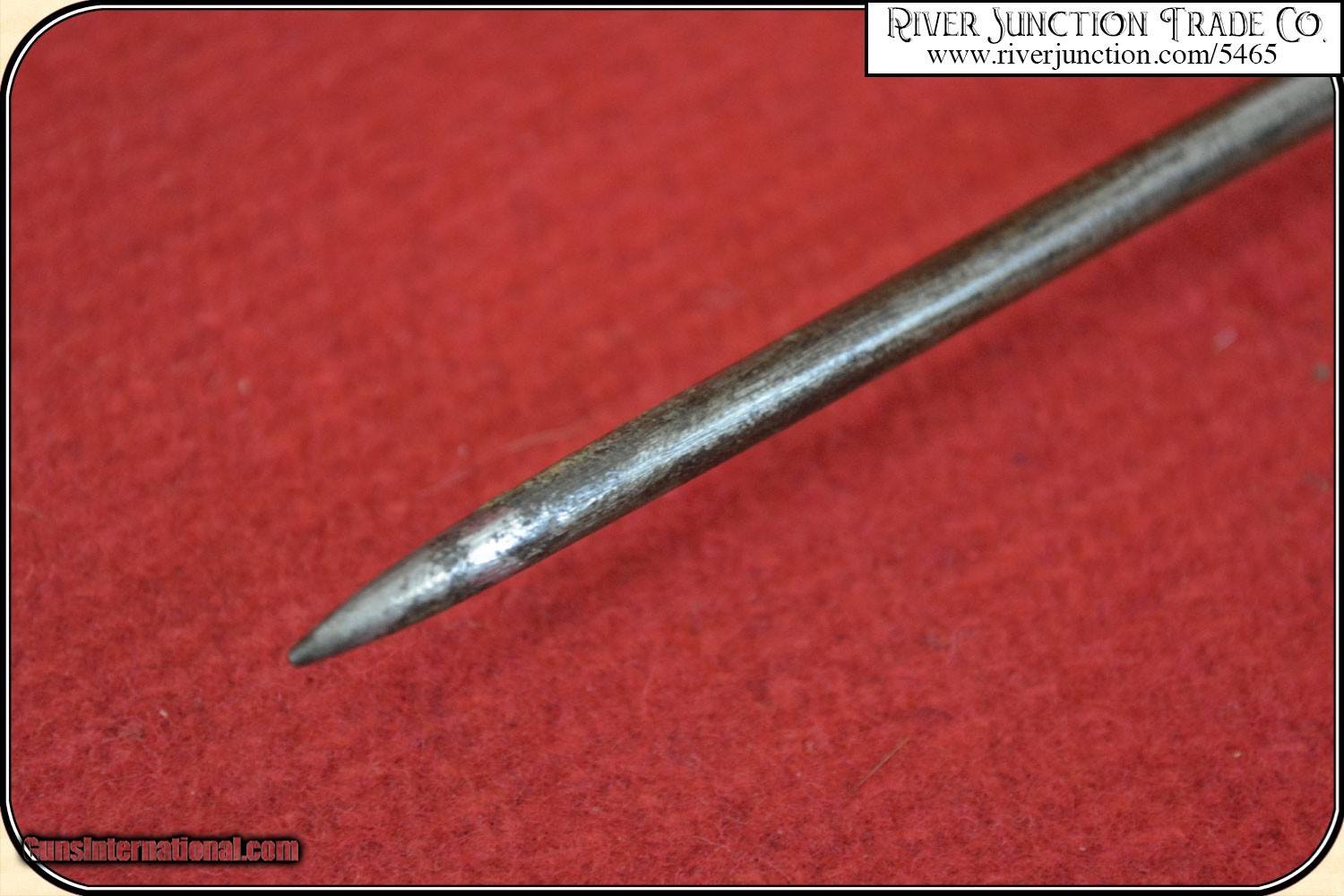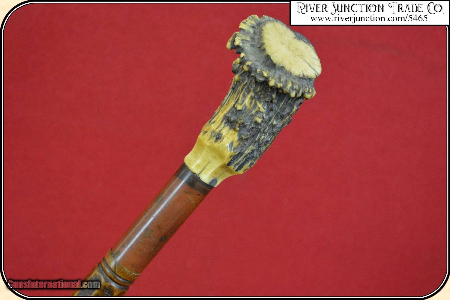 Description: A Handsome sword cane. The body is a tapered octagon shaft of curly maple with a large stag button handle at the top. Fine condition and perfectly working. A twist of the wrist and pull reveals the stiletto blade hidden within. The overall length as a cane is 33" and the condition is very good. It is an uncommon version of this type of defensive weapon curio. It has a sharp pointed tip and could be a formidable defensive weapon. The piece ends with a nickle and iron ferrule. The condition is very good. (Similar pieces are pictured in "Canes Through the Ages", by Francis H. Monek.) Payment: Item, can be ordered on line with a credit card or paypal on our sight. Just Google (riverjunction) and type in the River Junction Trade Co. item number (5465) in the search box. Before you checkout you will see shipping cost and total. OR If you prefer: Pay by cash, postal money order, cashiers check, personal & business checks. We wait for checks to clear. We always answer questions and entertain offers. Have questions? Call me 563-880-4588. Jim SOLD |