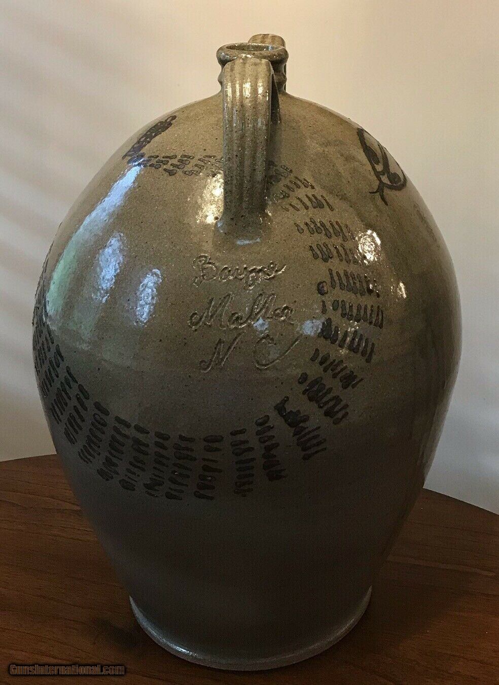 Description: $160.00 price reduction to $385.00 ..A rare find for the Man cave or patio..... Impressive Double Handle 4 Gallon Snake Jar by southern folk art face jug potter Michel Bayne! This massive jar is 17” tall and 71/2 “ at the base and approximately 40” around center . Covered in a beautiful alkaline glaze with an expertly painted snake wrapping around the jar. This is very much a top tier piece of folk art by perhaps the premier folk art potter working today. Michel is at the top of his game and this Awesome Jug was purchased at his home sale a few years ago. This jar is in as fired condition, no damage . A very large piece which will be securely packed. check my feedback. Please email with any questions! I’ve included pictures of several indentions that occurred in the making of this jar, no cracks or hairlines, just very shallow “dents”. There is also a desirable alkaline glaze drip......I can ship this item No Problem Lower 48 states. A great decorator piece for Bar or outdoor patio. email or call with any questions. Pick up OK in St. Louis, Mo area. $49.95 shipping well packed. (I have shipped jugs before.) SOLD |