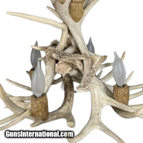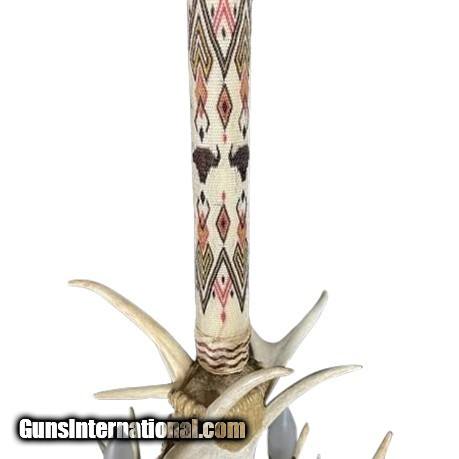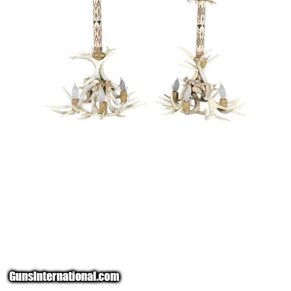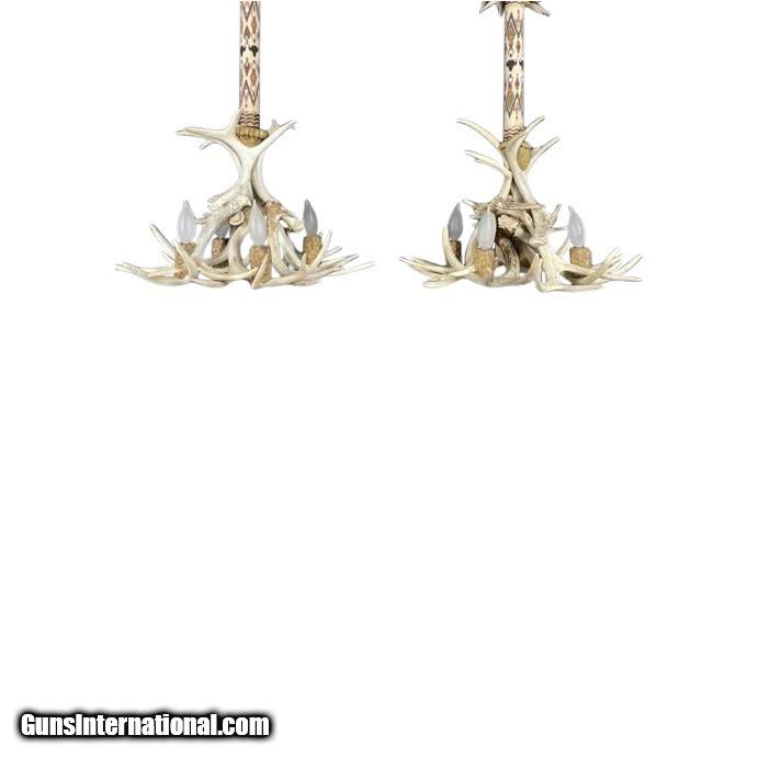 Description: Pair of whitetail antler chandeliers with horsehair hitching by Dan MacPhail of Kevil, Kentucky. Four light and polished whitetail sheds are featured on this stunning set, providing the perfect lighting for a cozy rustic den or a more modern cabin dining room. They measure 20"D x 24"H suspended on 2' rods with decorative horsehair hitching. The woven horsehair features geometric southwestern designs in black, pink, yellow, and salmon, with buffalo heads in the center of the design. SOLD |