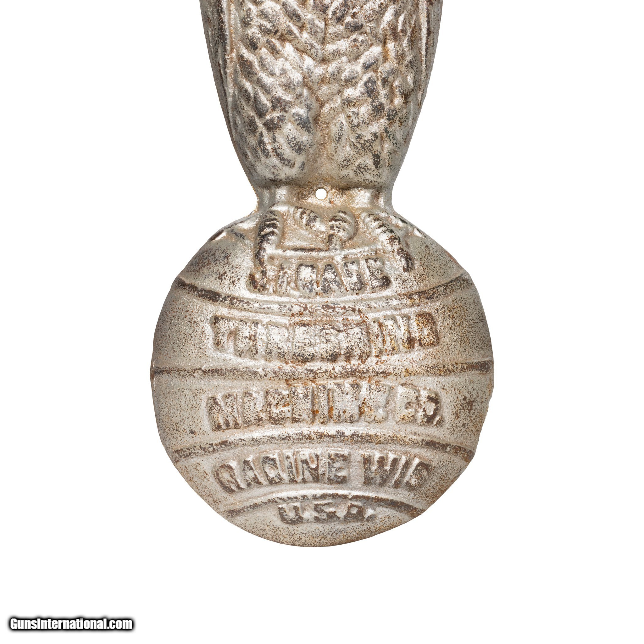 Description: Pair of cast iron Case eagle signs. Depicts the company mascot "Abe" on a globe. Embossed "J.I. Case Threshing Machine Company, Racine, WI, USA." Original silver paint. Made for wall mounting on both sides of the gate or door at the dealership. Hard to find. Circa 1880-1900. Eagles 14"H x 6"W x 3"D SOLD |