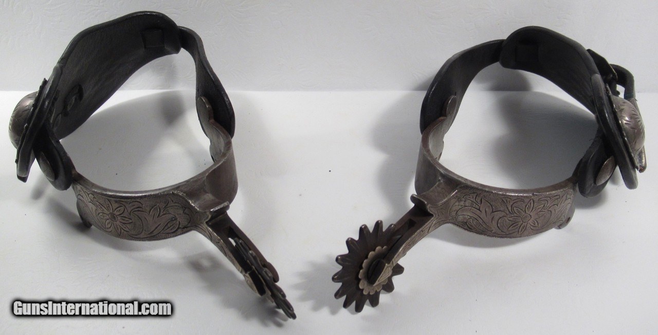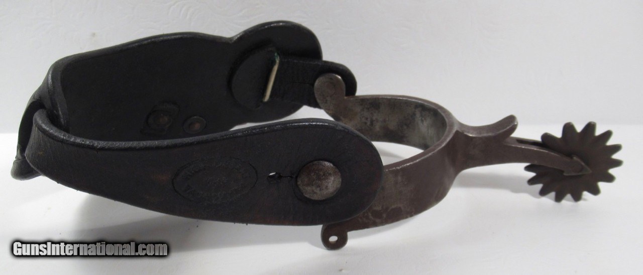 Description: Pair of Rex Schnitger Single Mounted Arrow Shank Spurs; Made when he was working for Bolin; “High Desert the Tack Smith” Straps Service Spurs; LIQUIDATING PERSONAL COLLECTION; Price: $1,500 + $30 S&H; Price includes insured shipping; return policy: three days inspection from the date the item is received; full refund of shipping both ways ONLY IF THE ITEM IS MISREPRESENTED. SOLD |