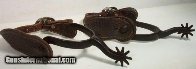 Description: Pair of single mounted spurs made by Tom Johnson, Jr. in Dalhart, Texas; circa 1912; antique; from my own personal collection;All items shipped fully insured--Spurs $30; return policy: three days inspection from the date the item is received; full refund of shipping both ways ONLY IF THE ITEM IS MISREPRESENTED. Note: International sales only as laws permit. SOLD |